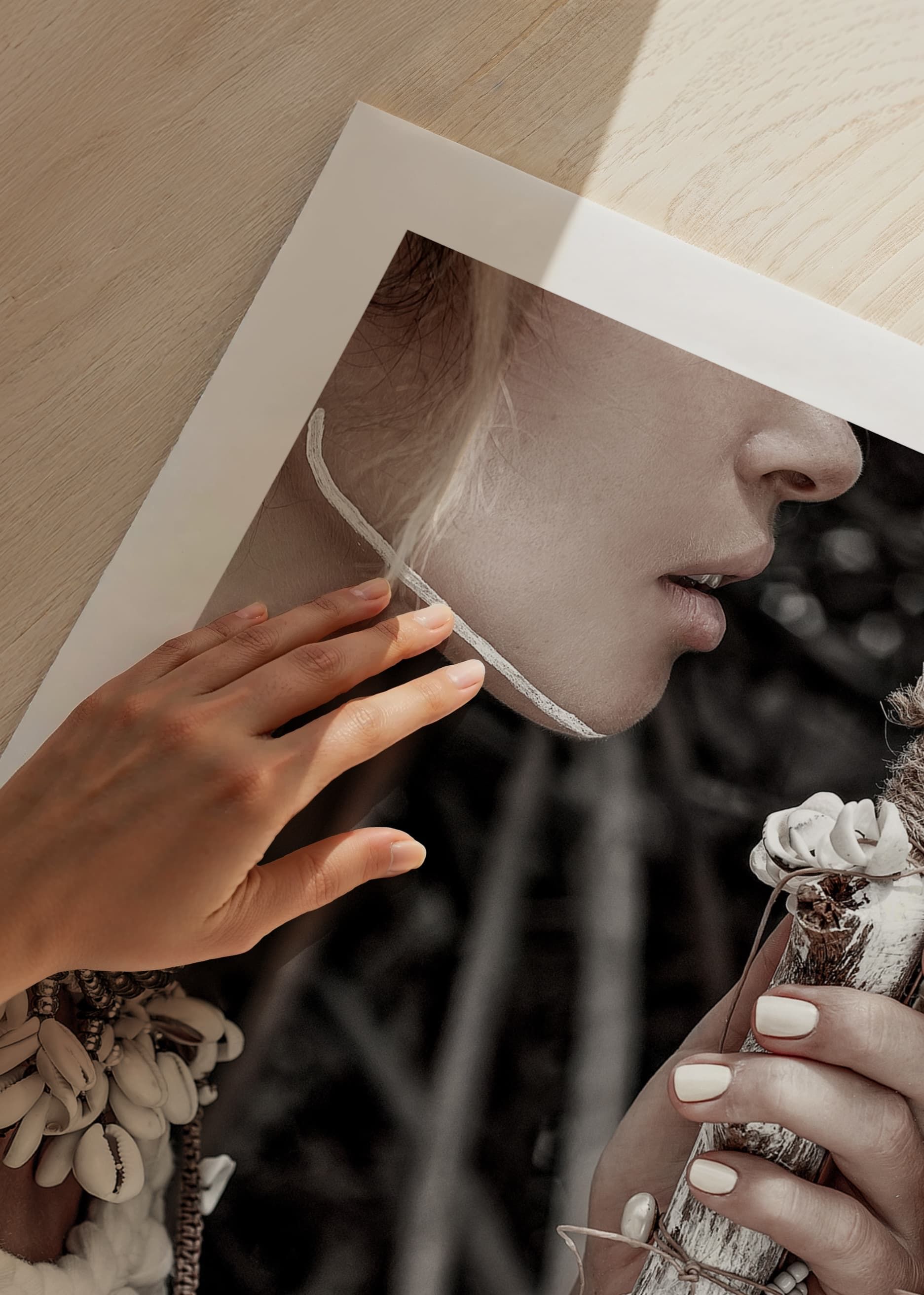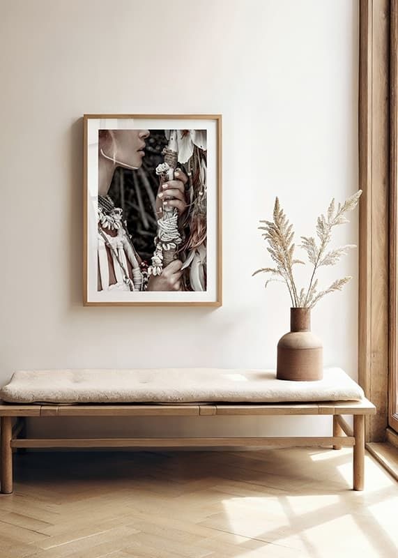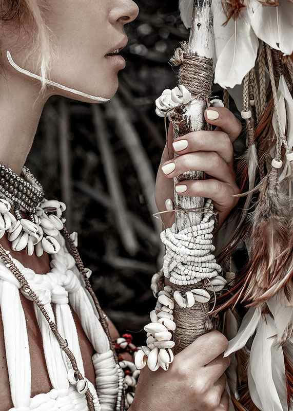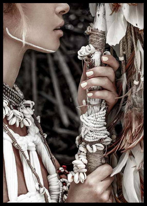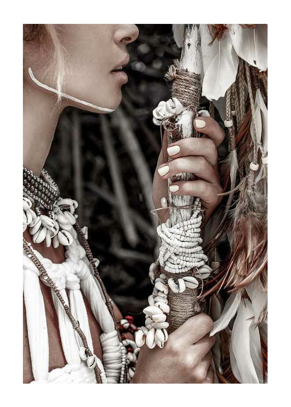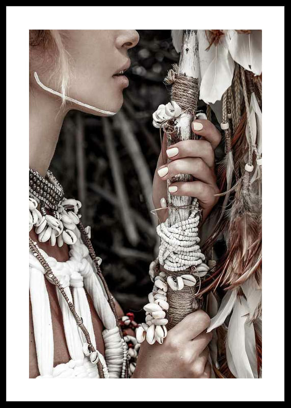 Detaljerad närbild av kvinna i traditionell utsmyckning med halsband av snäckor, pärlor och flätade band. Hon håller en stav dekorerad med vita band och naturliga fjädrar. Dämpad färgskala i beige och brunt ger ett naturligt intryck. Denna poster tillför ett stilrent inslag till exempelvis vardagsrum eller sovrum.