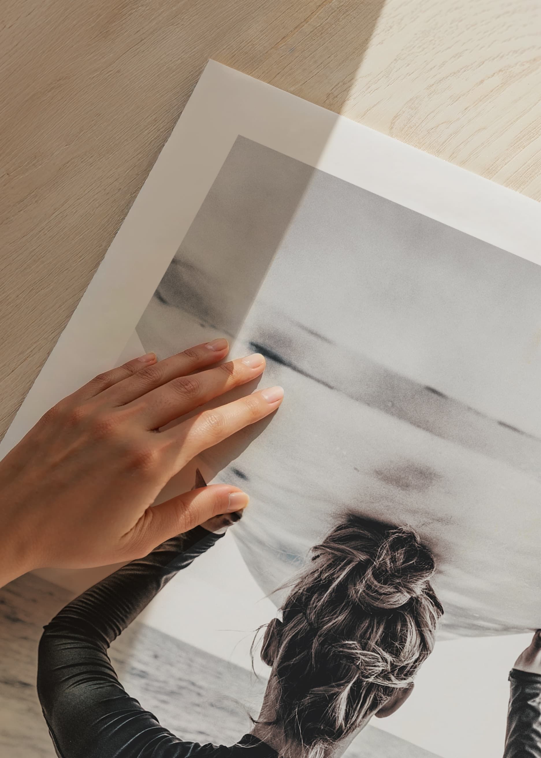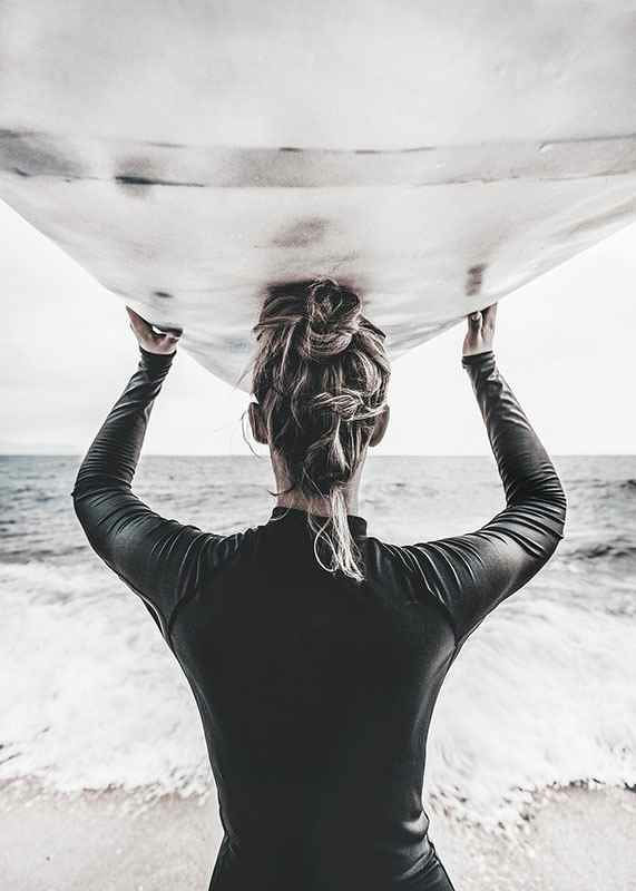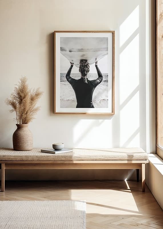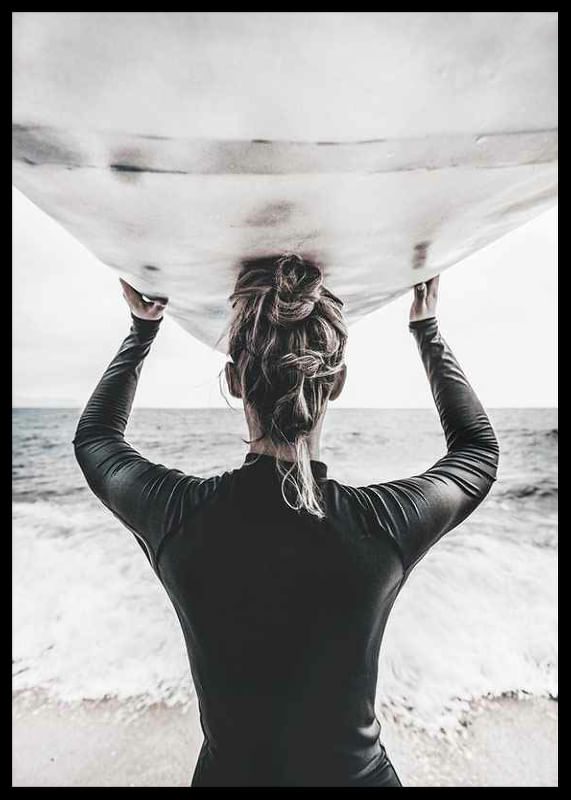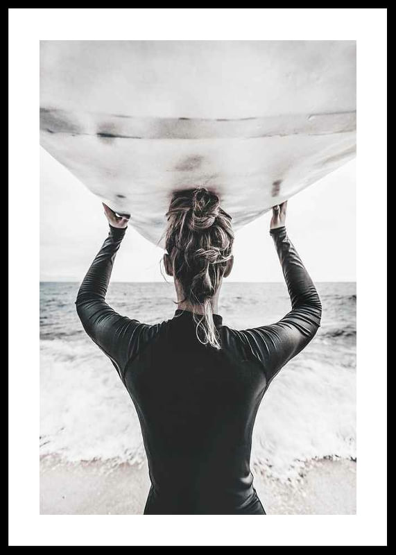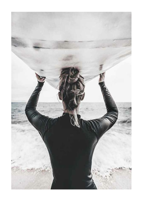 Bakifrån syns en surfare med håret i knut, klädd i mörk våtdräkt, som bär en surfbräda ovanför huvudet och blickar ut över havet. Ljus sandstrand och vågor i bakgrunden ger en somrig känsla. Denna poster förmedlar rörelse och frihet, och passar i rum där en naturnära eller sportig atmosfär önskas.