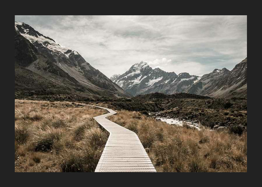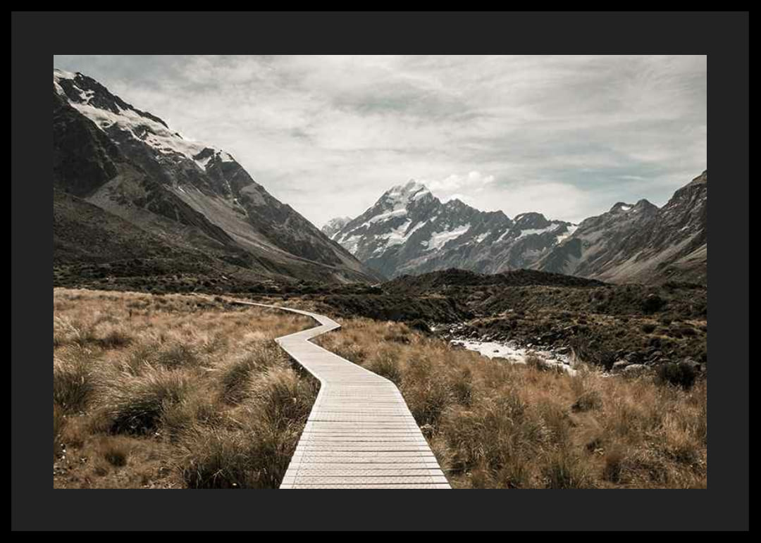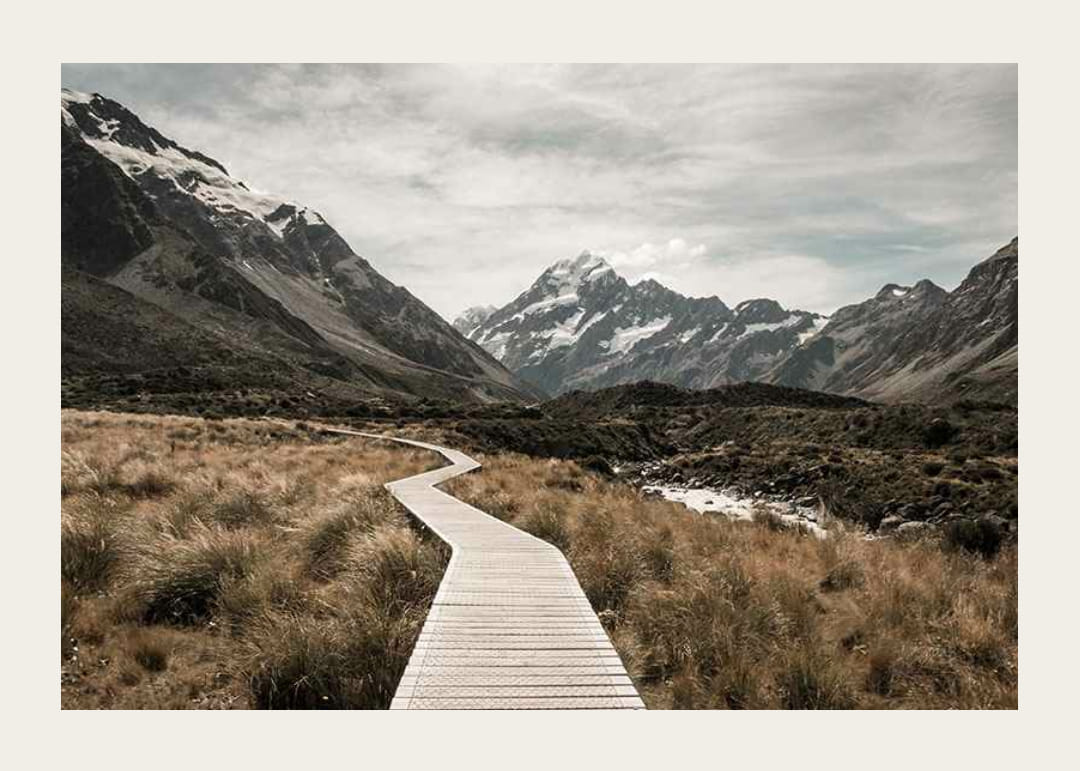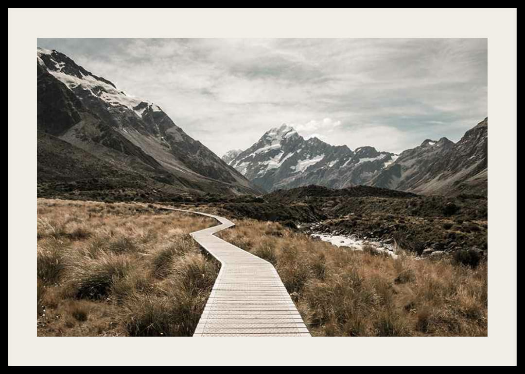 En slingrande spång leder genom hög guldgul gräsmark mot de majestätiska snötäckta topparna av Aoraki / Mount Cook i fjärran. Neutral färgskala med milda jordtoner skapar ett avskalat intryck. Denna poster passar utmärkt för dig som vill ge hemmet en känsla av vidsträckt och stillsam natur.