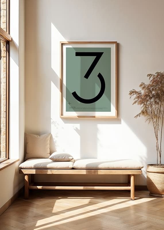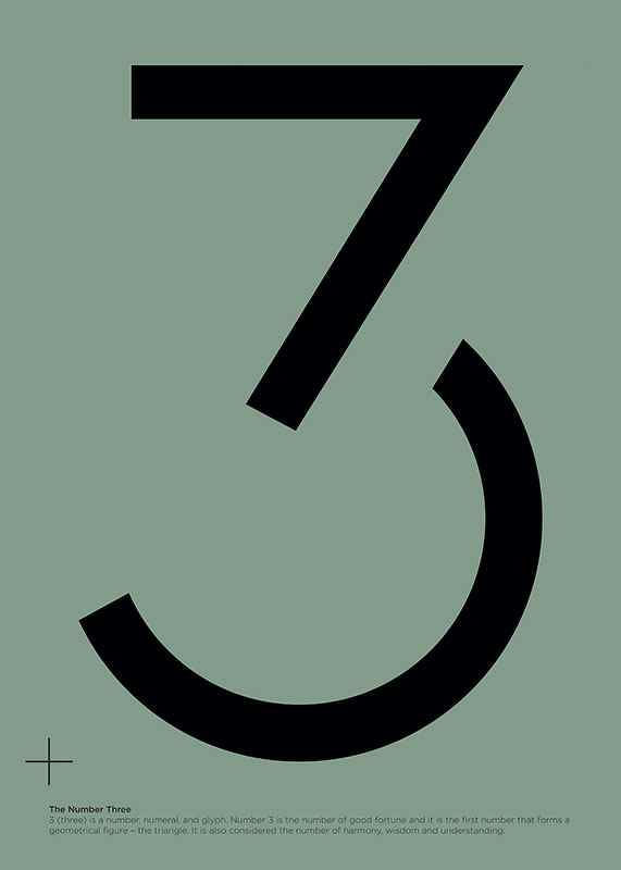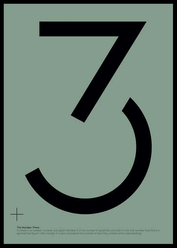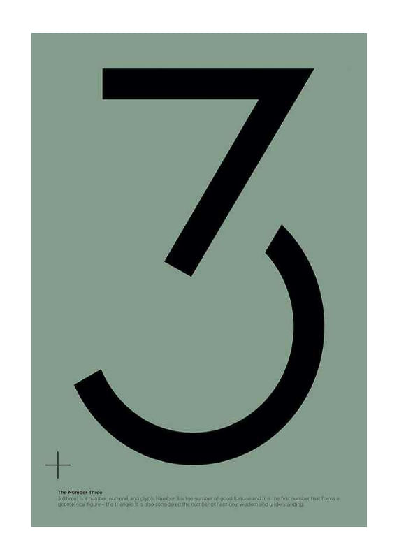 Stort svart nummer tre dominerar motivet mot en dämpad grön bakgrund. Under siffran finns en diskret engelsk text om siffrans betydelser i olika sammanhang. Den grafiska stilen och monokroma färgvalet ger postern ett stilrent uttryck som passar i både moderna och klassiska inredningar.