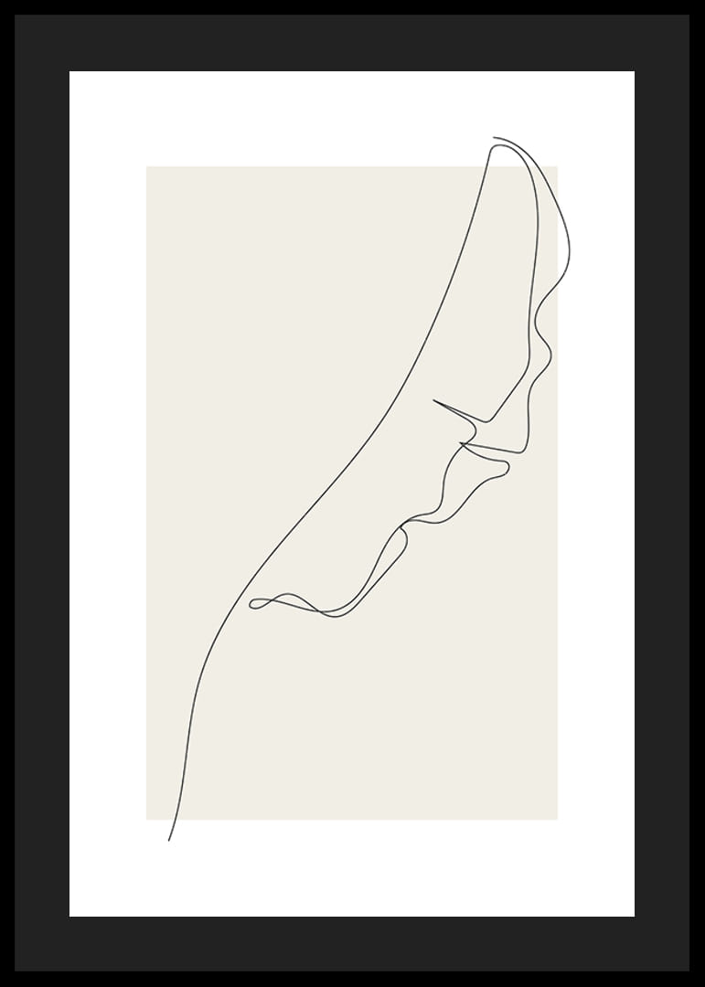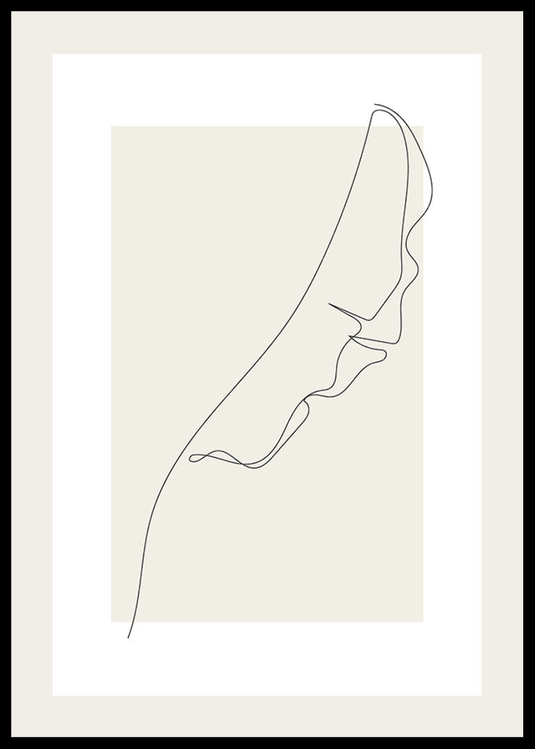Organisk linjeteckning föreställande ett ensamt bananblad i svart kontur mot en ljusbeige, rektangulär yta. Motivet domineras av bladets mjuka former som kontrasterar mot den neutrala bakgrunden och en bred vit kant. Den här postern passar bra i moderna, avskalade miljöer där naturinspiration uppskattas.