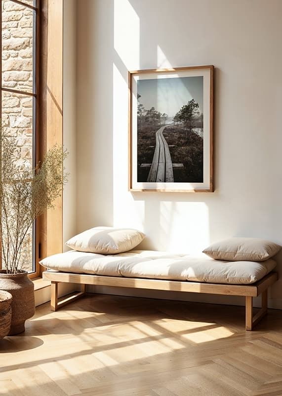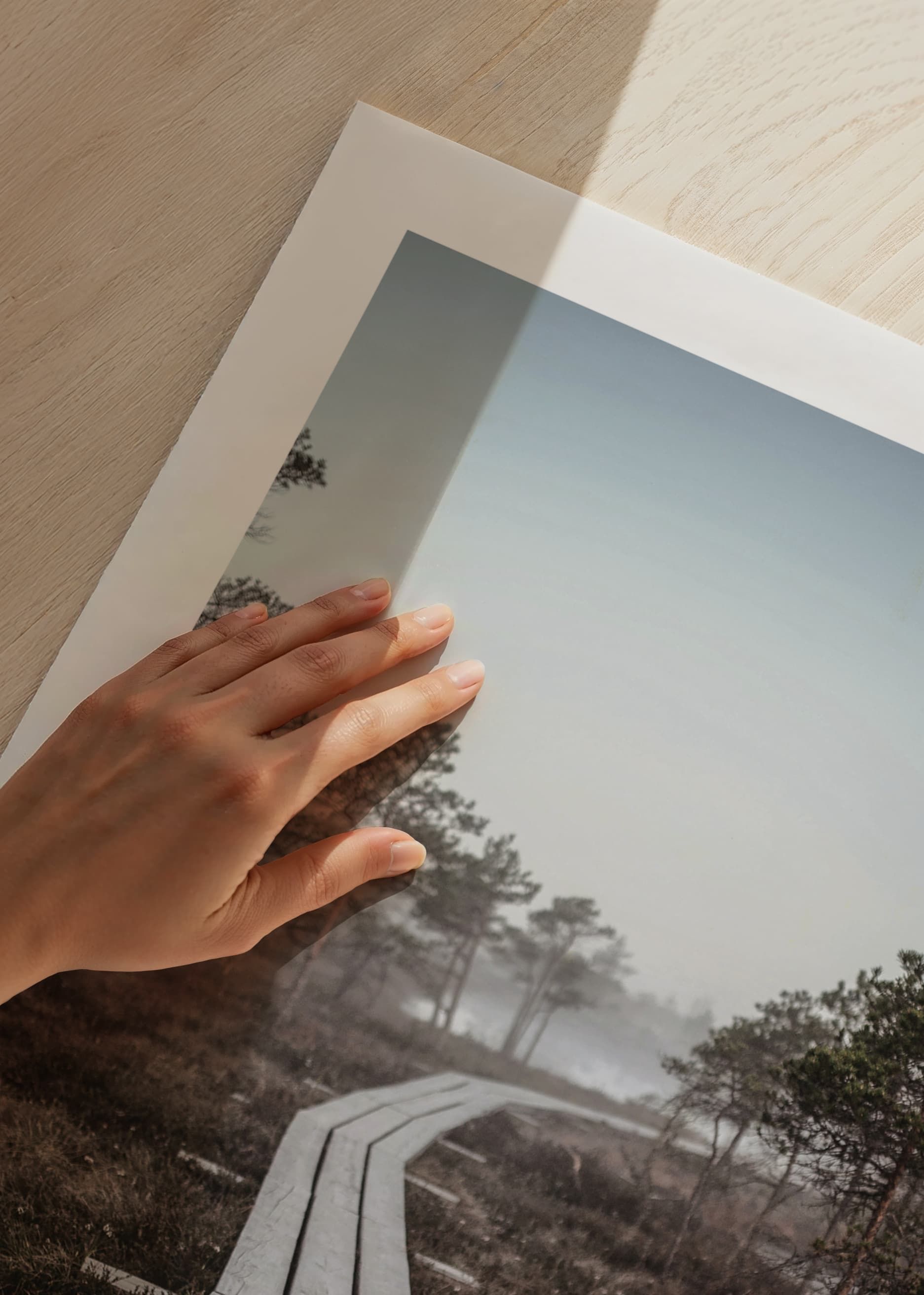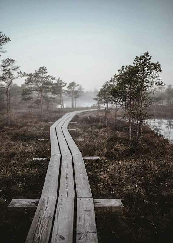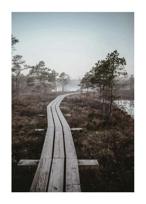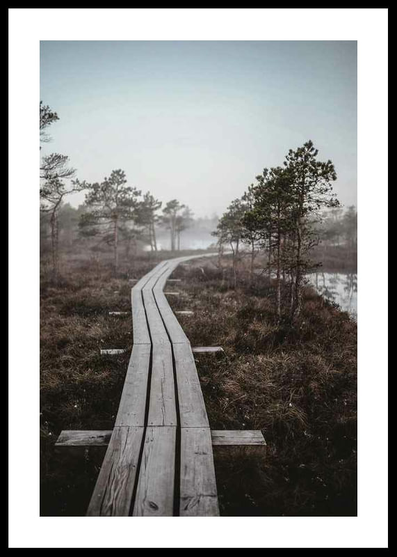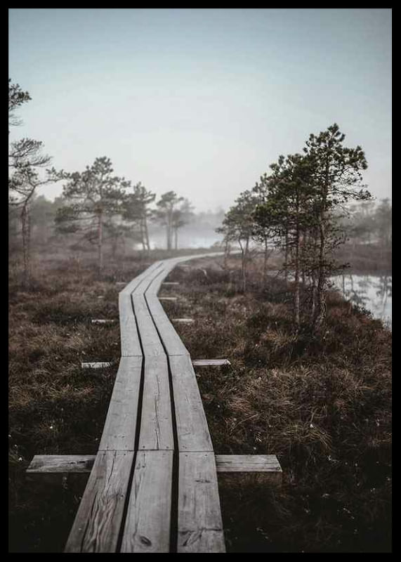En lång, smal träspång leder in i ett dimmigt träsklandskap omgiven av låga tallar och fuktig vegetation. De dova bruna och grå nyanserna skapar en avskalad känsla med subtila detaljer i morgondiset. Denna poster inger ett stilla och naturnära uttryck som passar i exempelvis hall, vardagsrum eller arbetsrum.