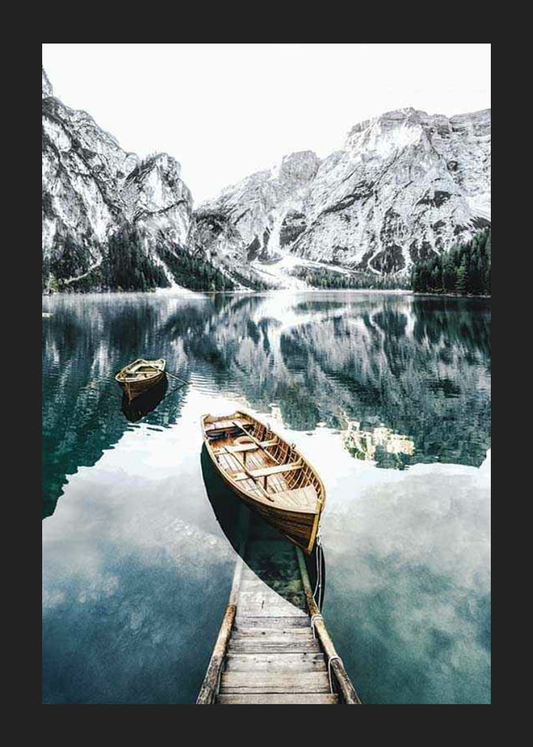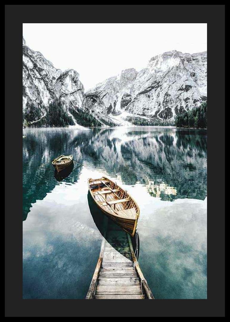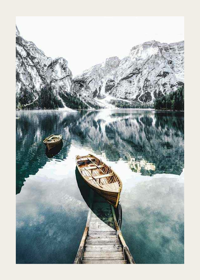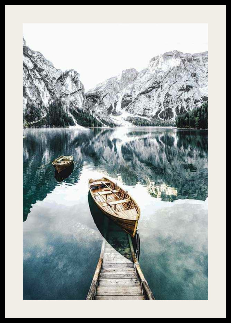 Två träroddbåtar flyter vid en kort brygga på en spegelblank sjö omgiven av imponerande, lätt snötäckta berg i Fanes-Sennes-Braies naturpark. Den klara ytan reflekterar både himmel och bergslandskap. Med svala blå och grå toner blir denna poster ett stilrent inslag i exempelvis sovrum eller vardagsrum.