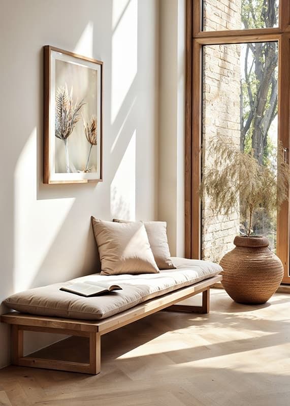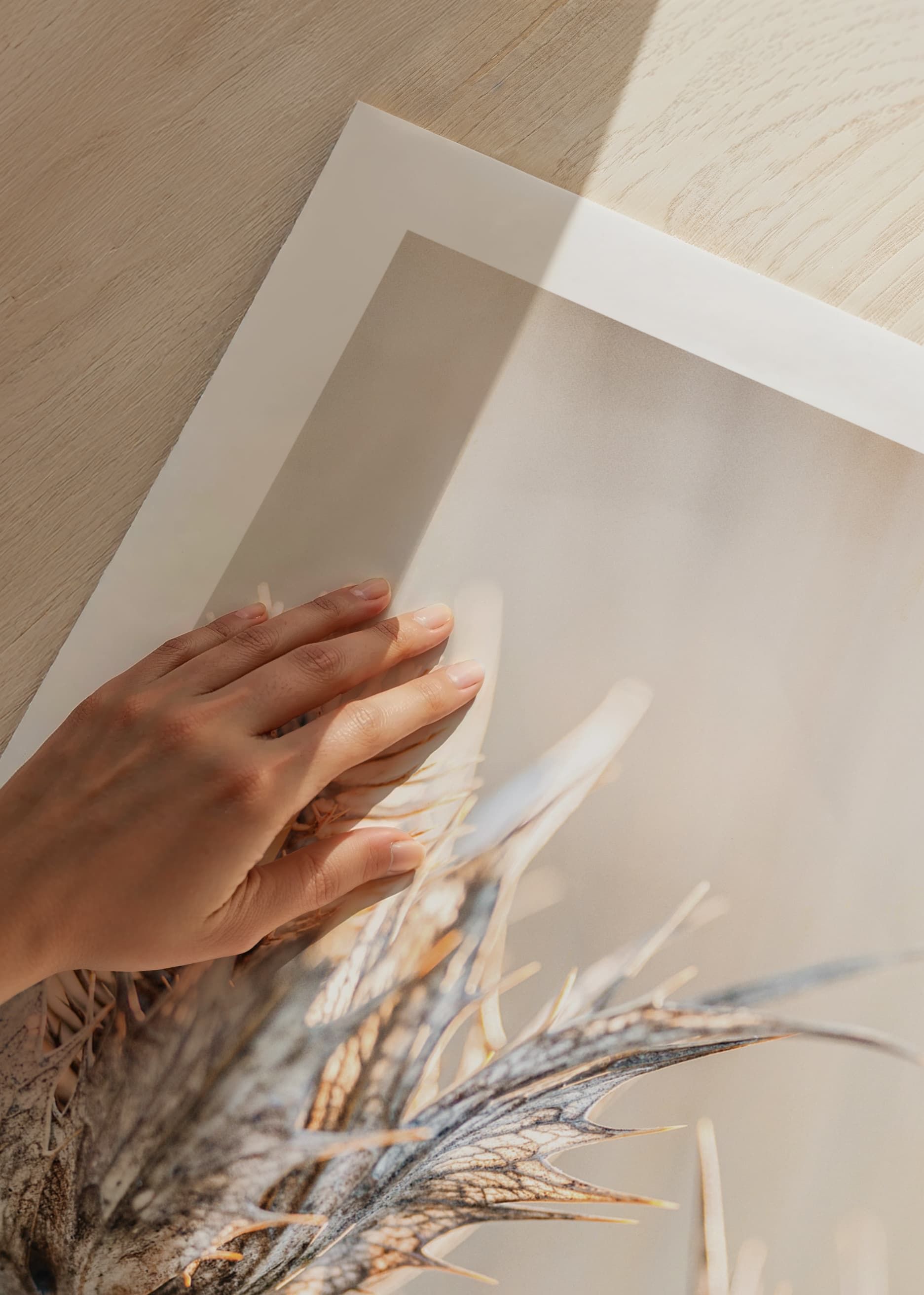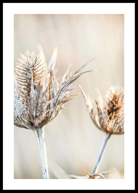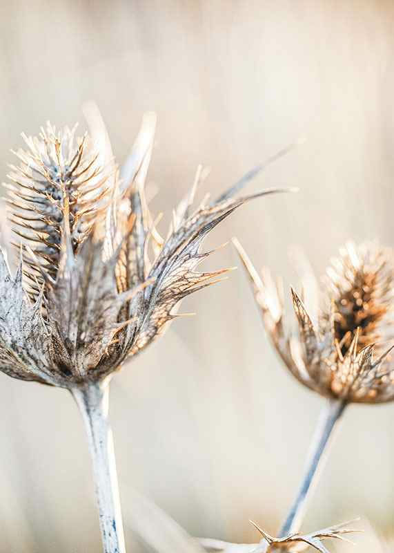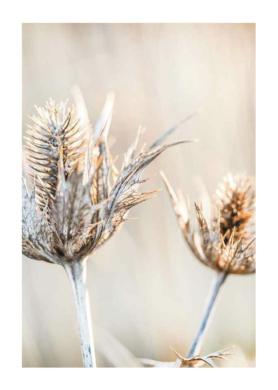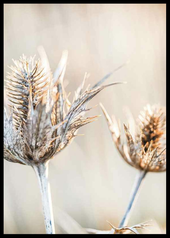 Närbild av två torkade tistlar med taggiga blad och stjälkar mot en suddig, ljust beige bakgrund. Detaljerna i växternas struktur framhävs av det mjuka, naturliga ljuset. Denna poster ger en stillsam och naturnära känsla och passar bra i allt från hall till vardagsrum.
