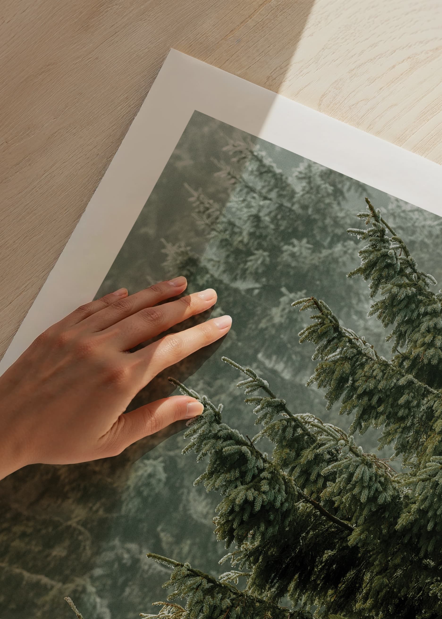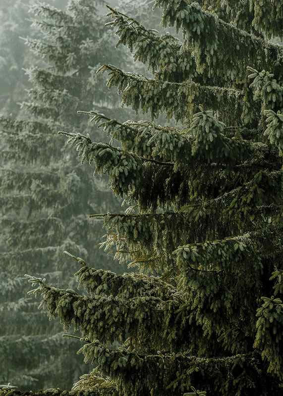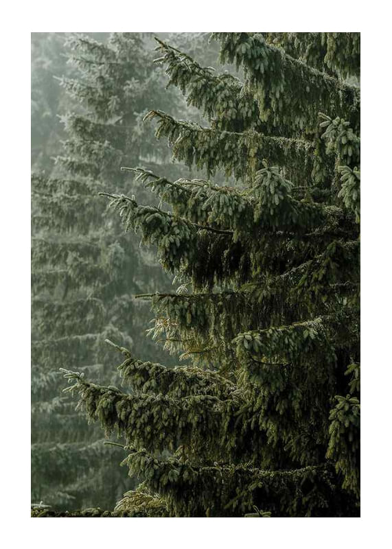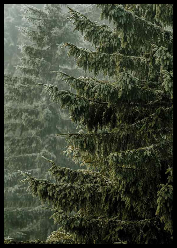 Täta grankvistar dominerar motivet med frodigt gröna barr och subtila dimslöjor i bakgrunden. Djupet och den dova färgskalan ger en naturlig och stillsam känsla. Postern tillför en skandinavisk naturkänsla i både vardagsrum och arbetsrum, och passar särskilt för dig som uppskattar skog och höstliga toner.