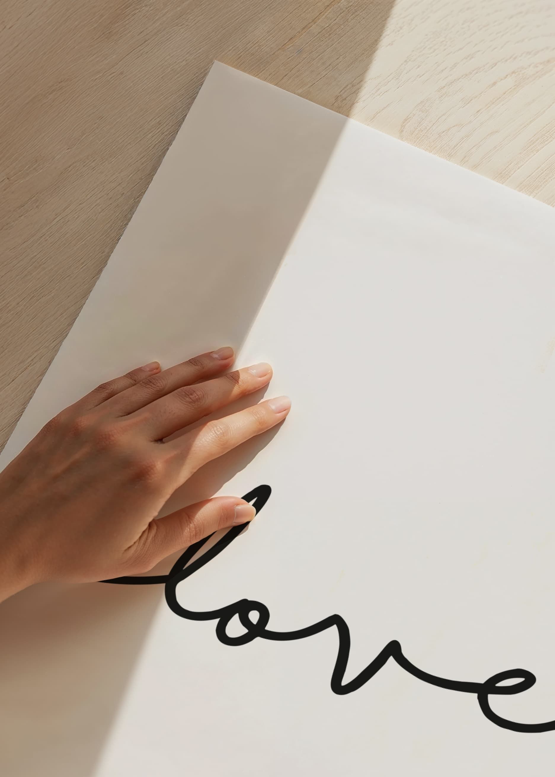Ordet love är skrivet i svart med en enda flytande linje i skrivstil på vit bakgrund. Den minimalistiska linjeteckningen ger ett modernt och stilrent intryck. Som poster skapar motivet en lugn och personlig känsla, och fungerar väl i sovrum, vardagsrum eller hall där en subtil touch av värme önskas.