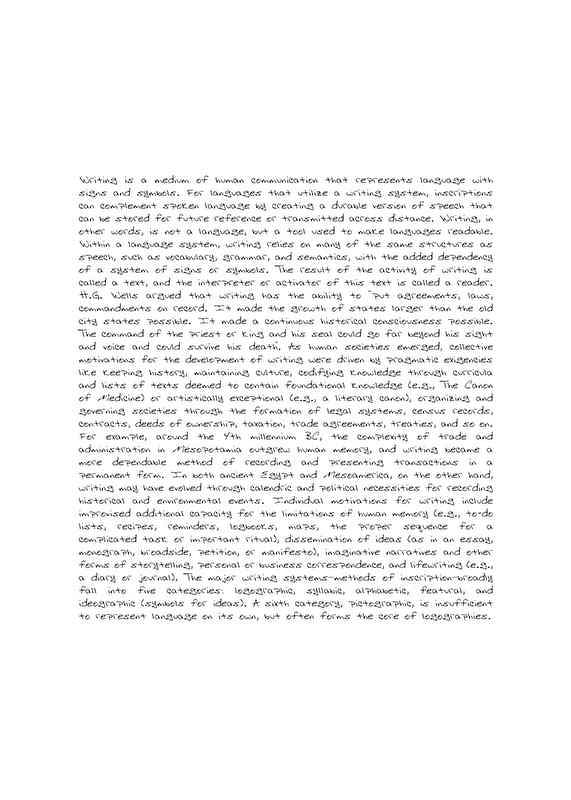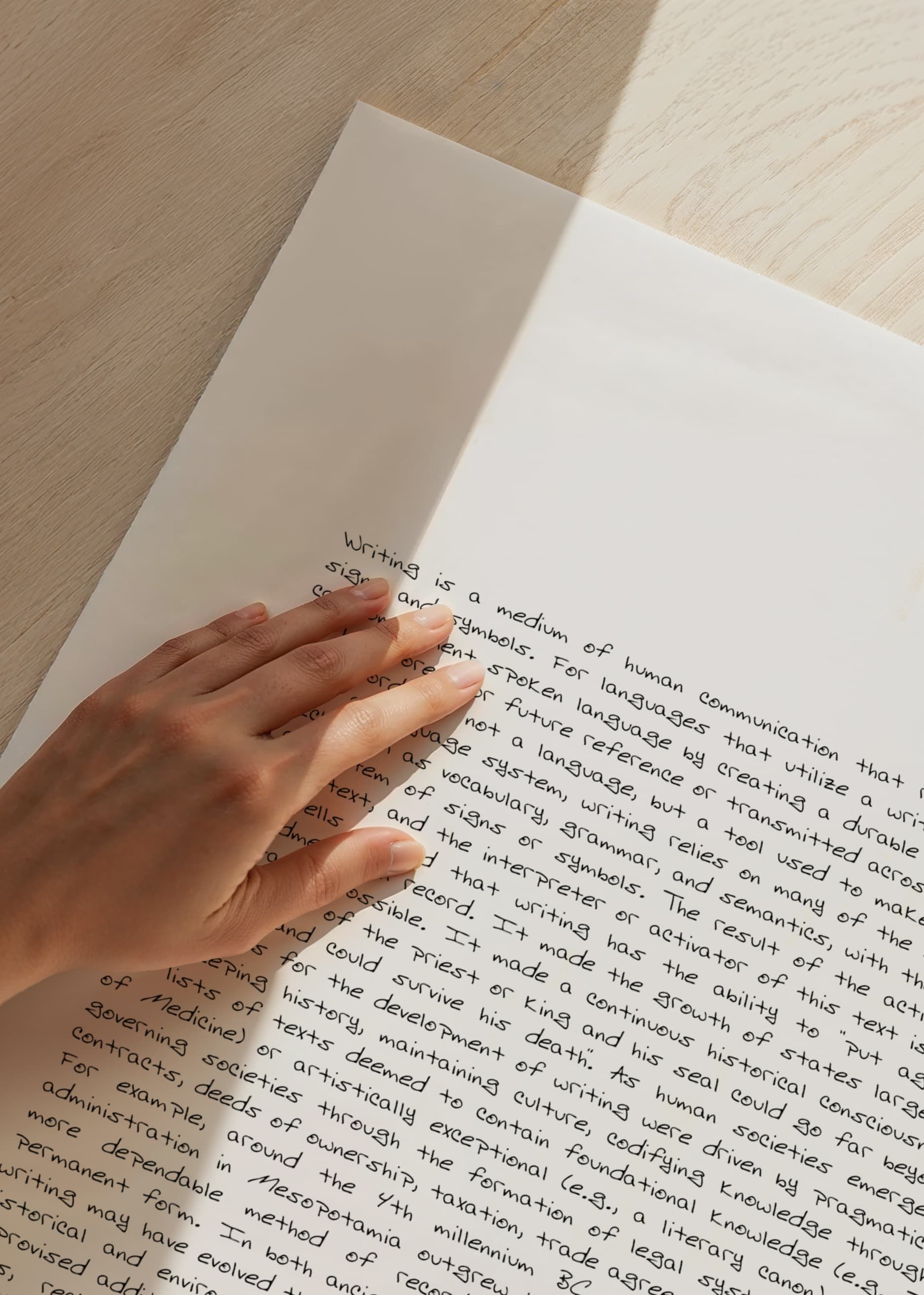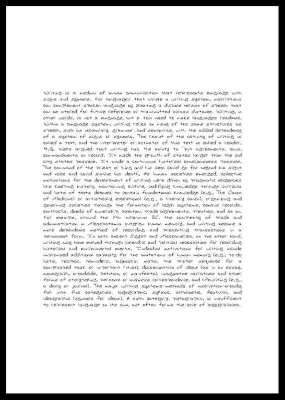 Tätskriven svart text på vit bakgrund i handskriven stil. Texten på engelska beskriver det skrivna ordets betydelse och utveckling genom historien. Det luftiga, grafiska uttrycket skapar en minimalistisk känsla. Som poster fungerar motivet väl i hemmakontor, bibliotek eller moderna vardagsrum där text och kunskap är i fokus.