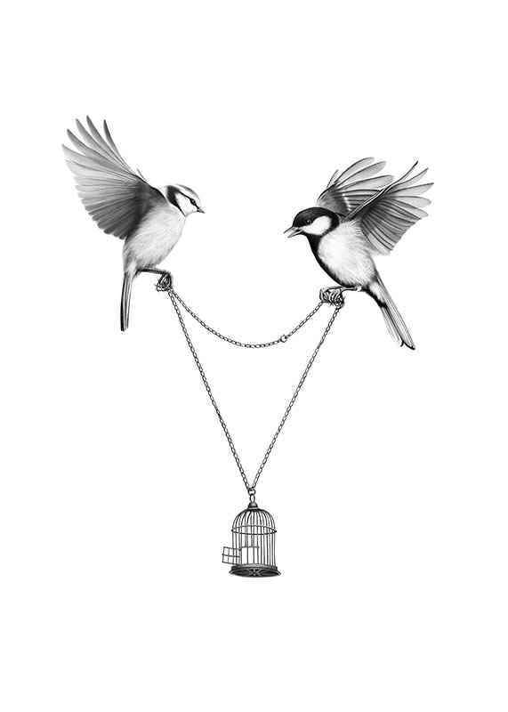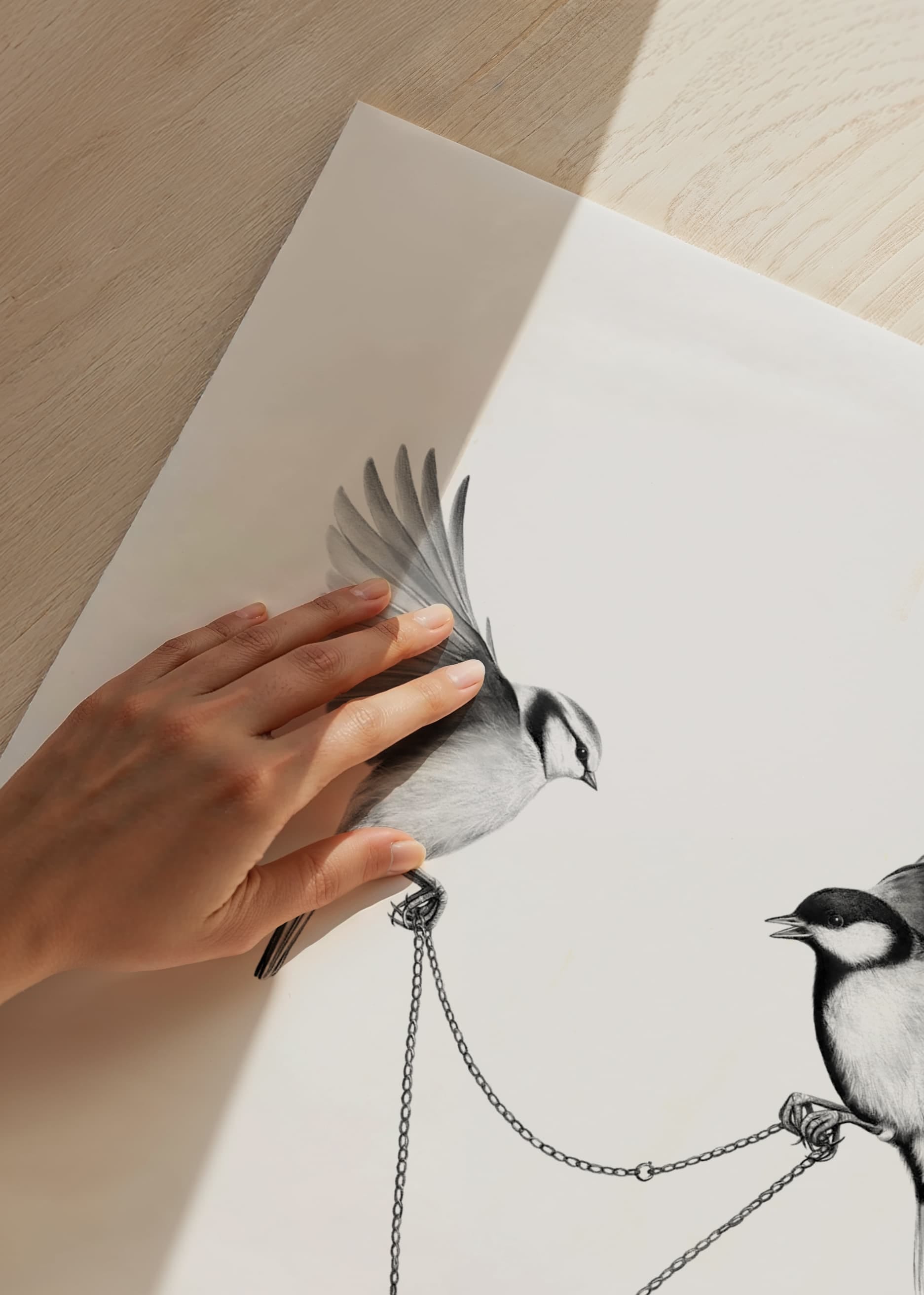 Två detaljrika mesar i svartvitt ses sväva mitt emot varandra, med utsträckta vingar och en kedja mellan sig. Från kedjan hänger en öppen tom fågelbur. Motivet är handtecknat av den svenska illustratören Sanna Wieslander och utmärks av hennes detaljrika blyertsstil som kombinerar klassisk konst med moderna element på ett lekfullt sätt. Den grafiska postern utstrålar en surrealistisk känsla där det klassiskt naturtrogna möter en kreativ, fri tolkning – perfekt för hem där fritt uttryck och konstnärlig inspiration värdesätts.