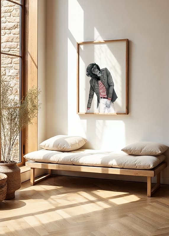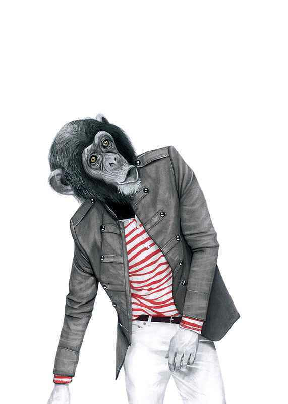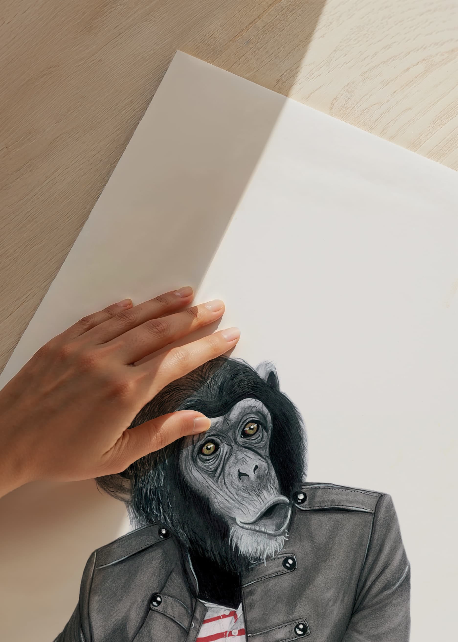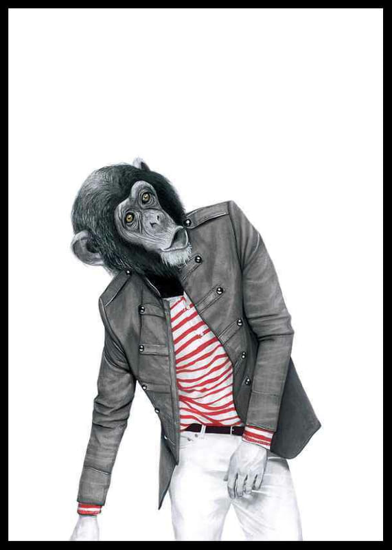 Ett motiv där en schimpans har en människokropp klädd i grå jacka och rödvitrandig tröja mot vit bakgrund. Kontrasten mellan djurhuvud och modern klädstil ger ett lekfullt intryck. Den svenska illustratören Sanna Wieslander är känd för sin karakteristiska stil som kombinerar klassisk konst med moderna element och surrealistisk humor. Hennes detaljrika blyertsstil och handritade illustrationer gör postern till ett intressant inslag, särskilt i kreativa miljöer eller vardagsrum.