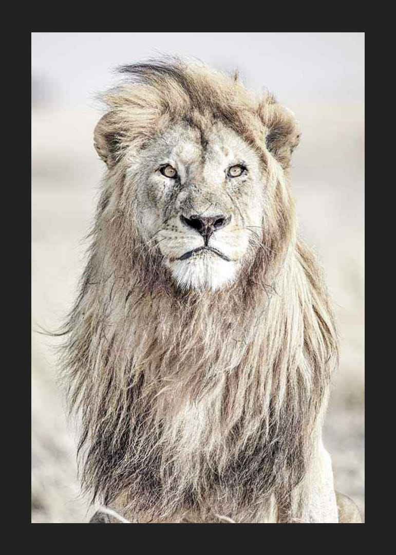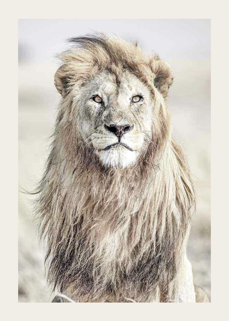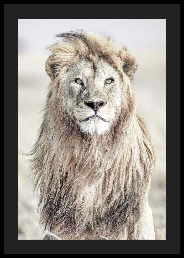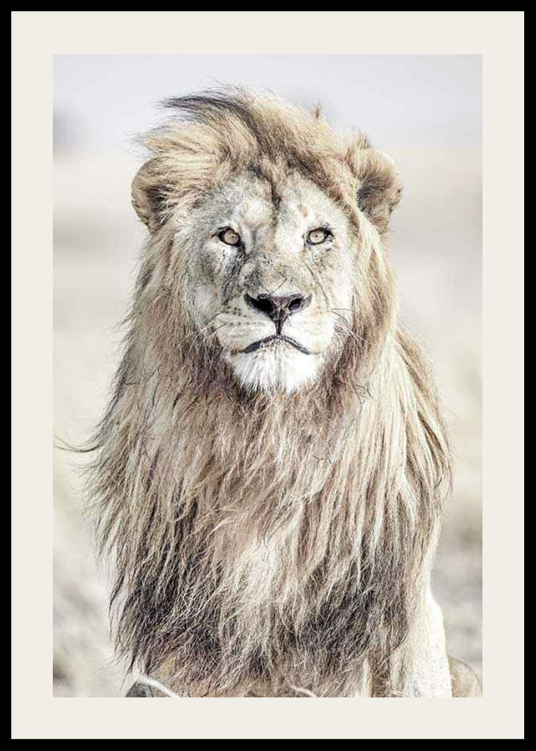 Närbild av ett lejon med ljus man, fotograferat i ett torrt savannlandskap. Fokuset ligger på det uttrycksfulla ansiktet och den fylliga manen, medan bakgrunden hålls diffus i beige toner. Denna poster ger en naturlig känsla och passar utmärkt i vardagsrum eller kontor.