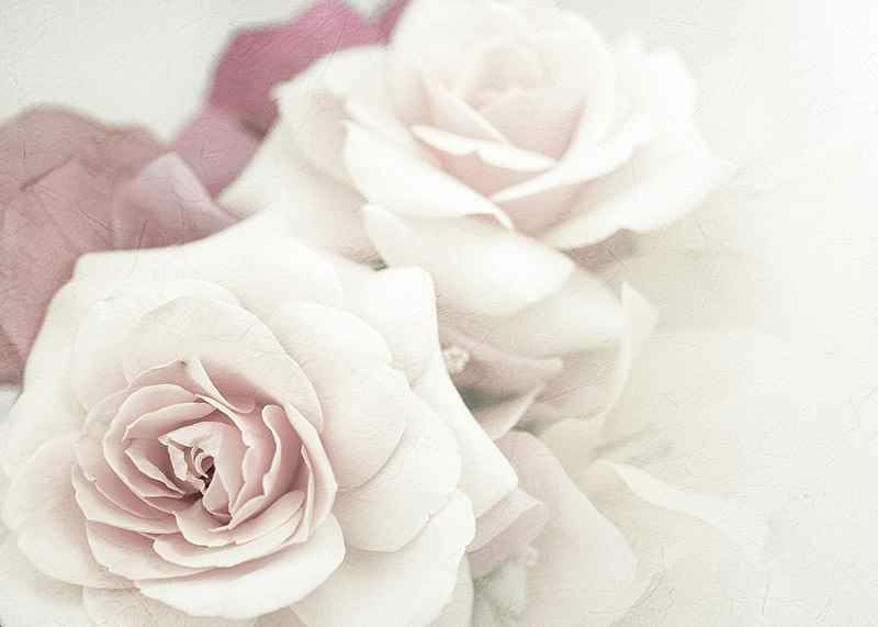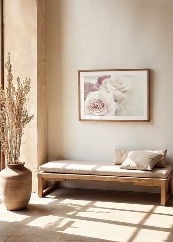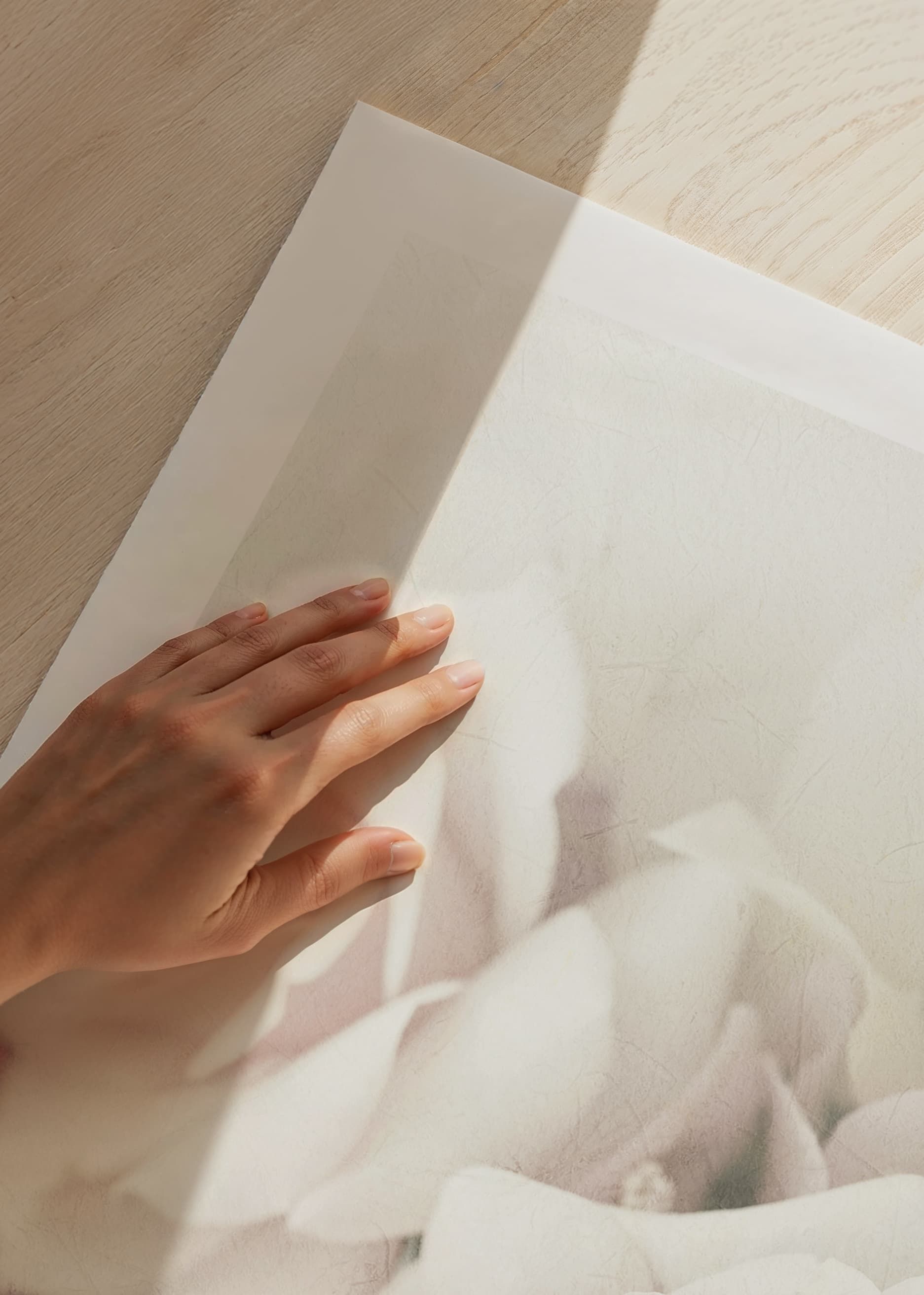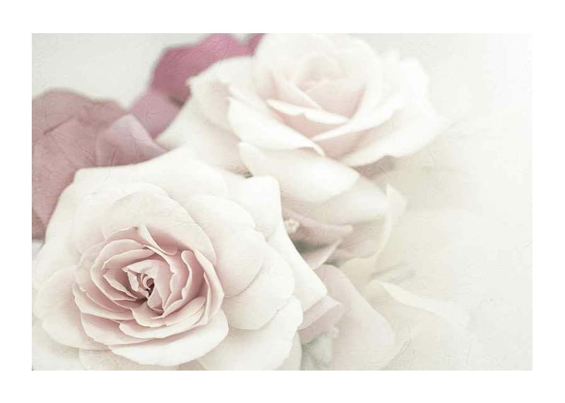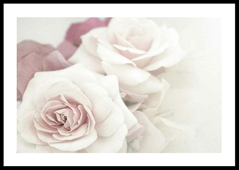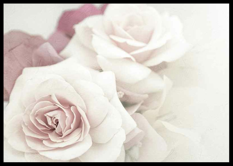 Närbild av rosor i mjuka rosa och vitaktiga nyanser. Motivets bakgrund är suddig och dämpad, vilket förstärker blommornas skira uttryck. De mjuka färgövergångarna och stillsamma formerna ger en subtil effekt. Denna poster passar lika bra i sovrum som i vardagsrum där en lugn atmosfär uppskattas.