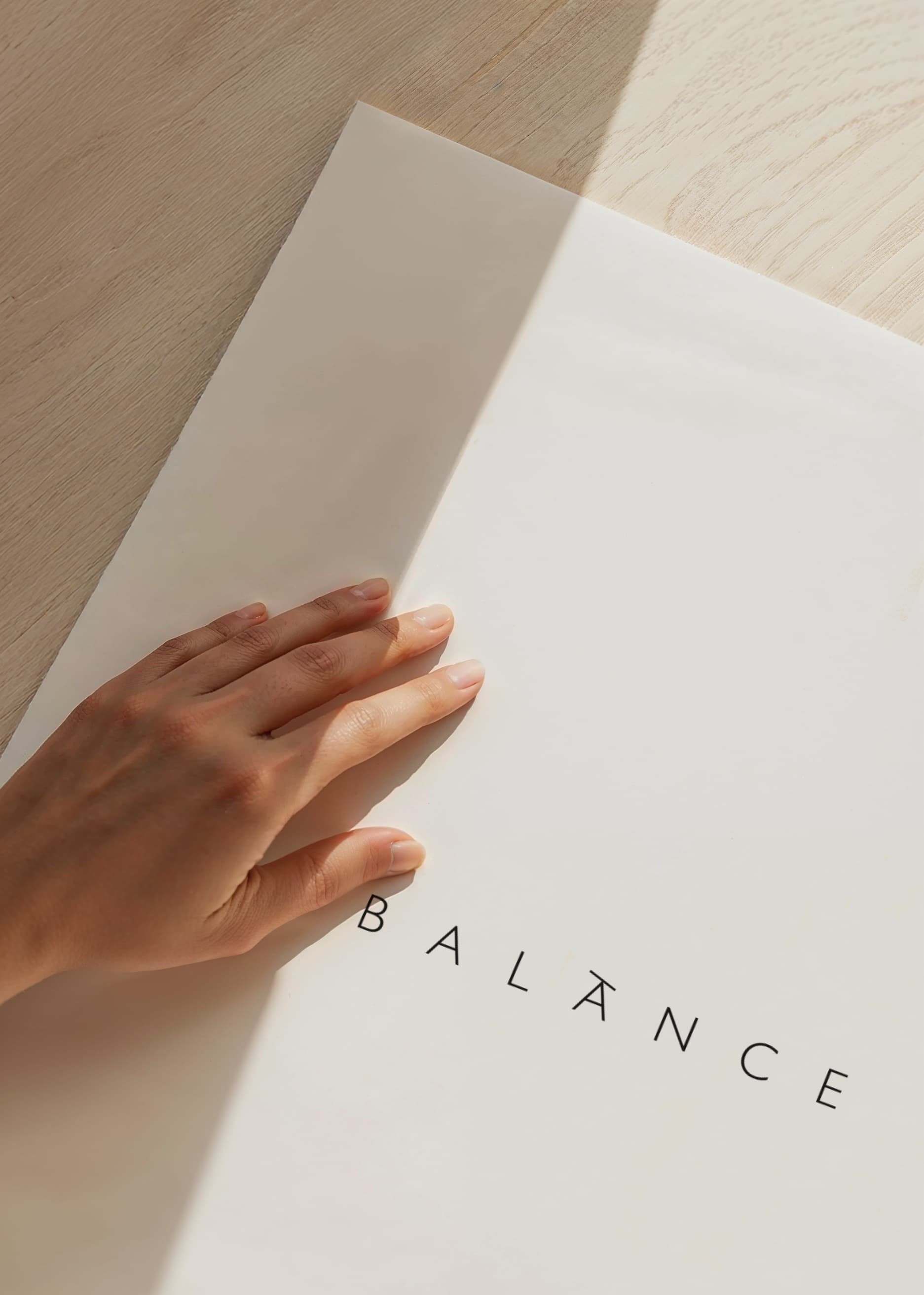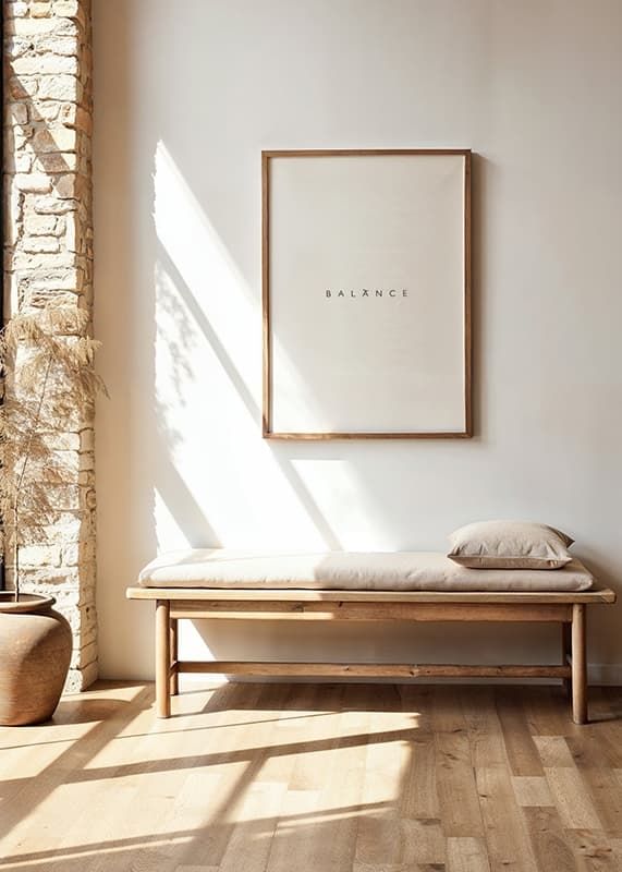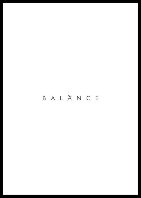 Ordet BALANCE är återgivet i tunn svart typografi mot vit bakgrund, med bokstaven A formad så att ett litet svart streck balanserar ovanpå. Den minimalistiska layouten ger postern en modern och luftig känsla som passar i hem där ett enkelt grafiskt uttryck och stilren texttavla efterfrågas.