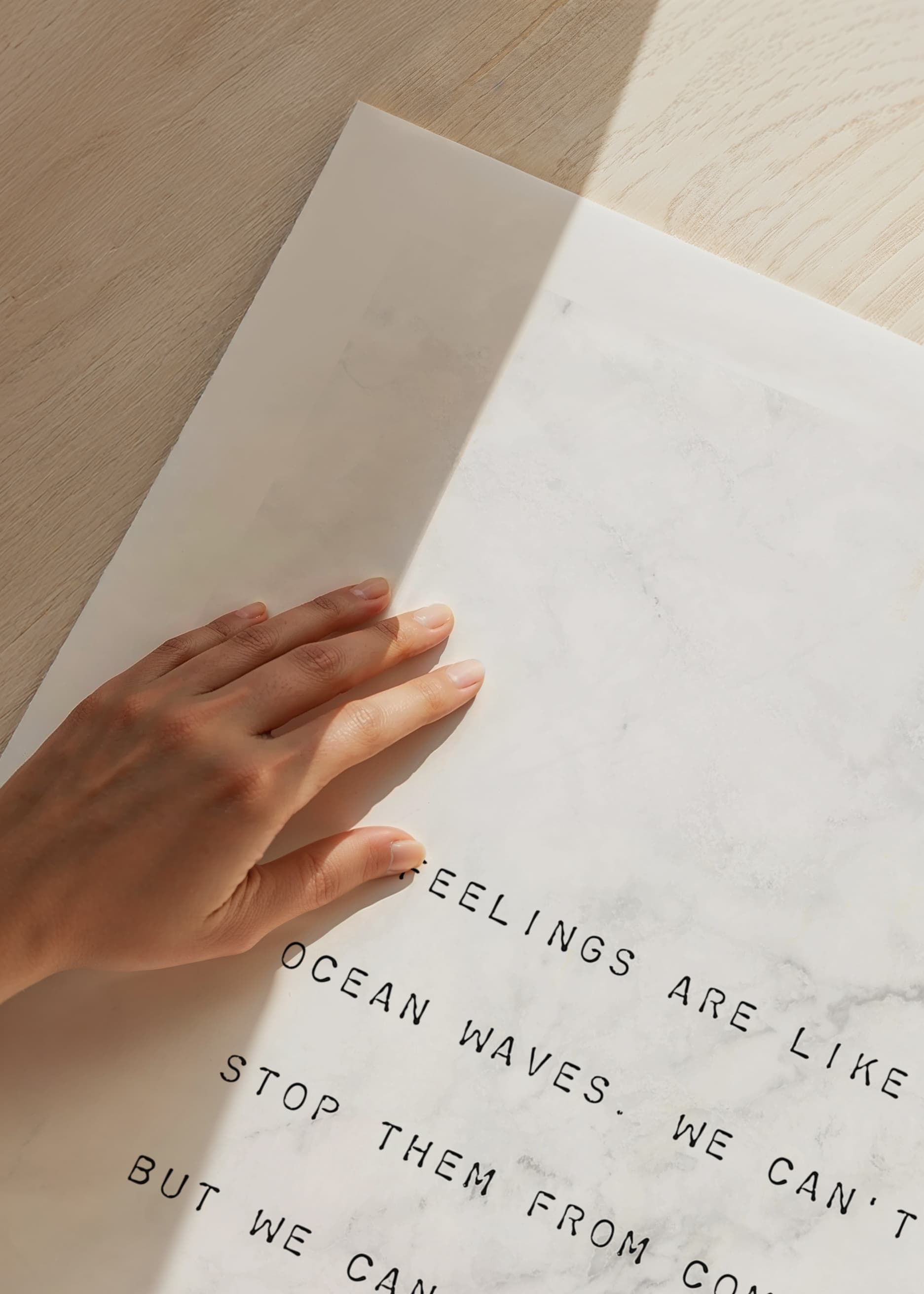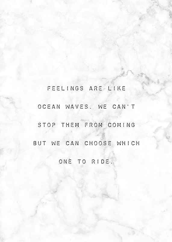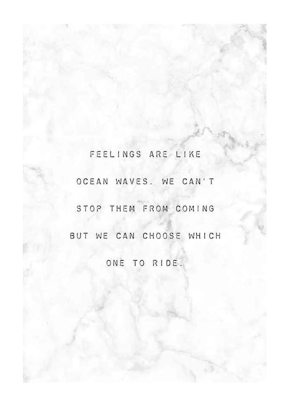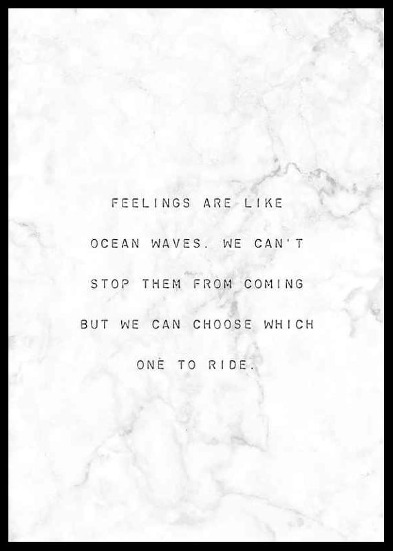 Citatet ”Feelings are like ocean waves. We can't stop them from coming but we can choose which one to ride” är centrerat med enkel svart typografi mot en ljus, marmorerad bakgrund. Den grafiska kompositionen ger ett diskret och stilrent uttryck. Postern passar i lugna miljöer som arbetsrum eller sovrum.