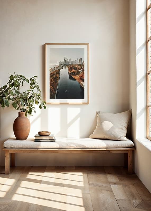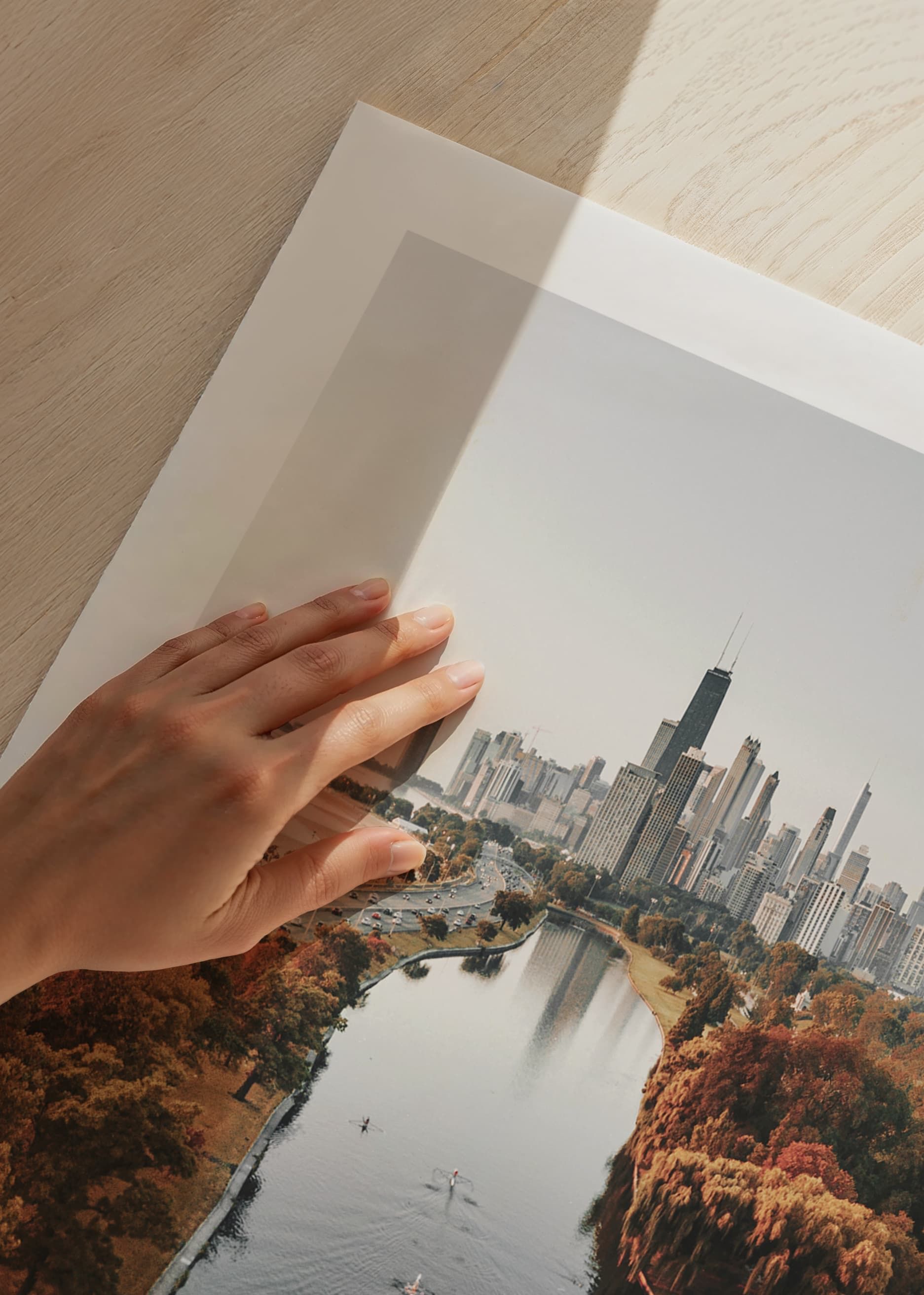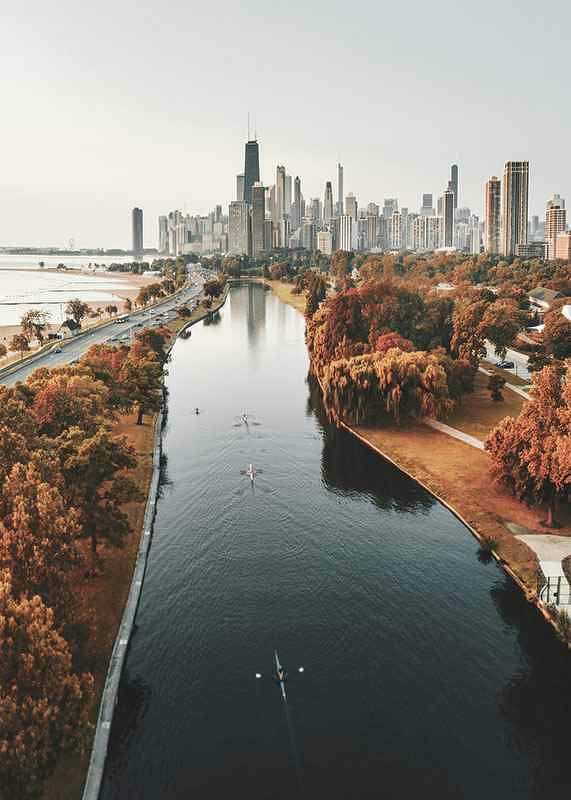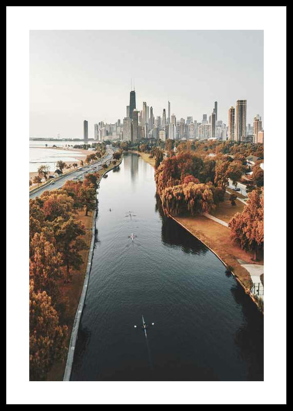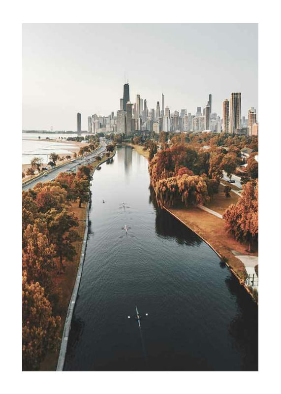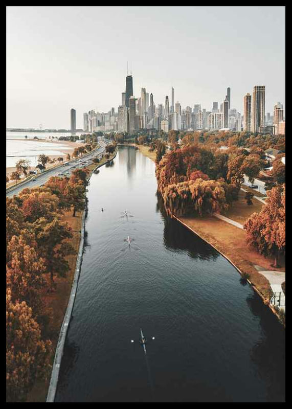 Chicagos välkända silhuett reser sig i bakgrunden medan en bred flod leder blicken genom motivet. Träd i klara höstfärger kantar vattnet där flera roddbåtar syns. Denna poster fångar stadens pulserande liv och naturens färgskiftningar, vilket gör den till ett stämningsfullt inslag i vardagsrum eller arbetsrum.