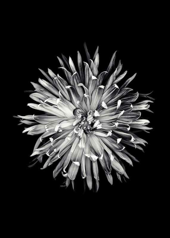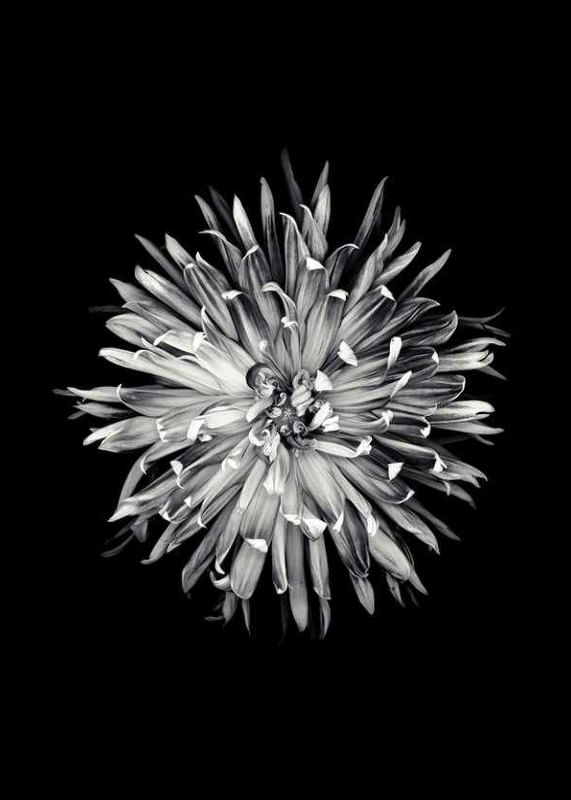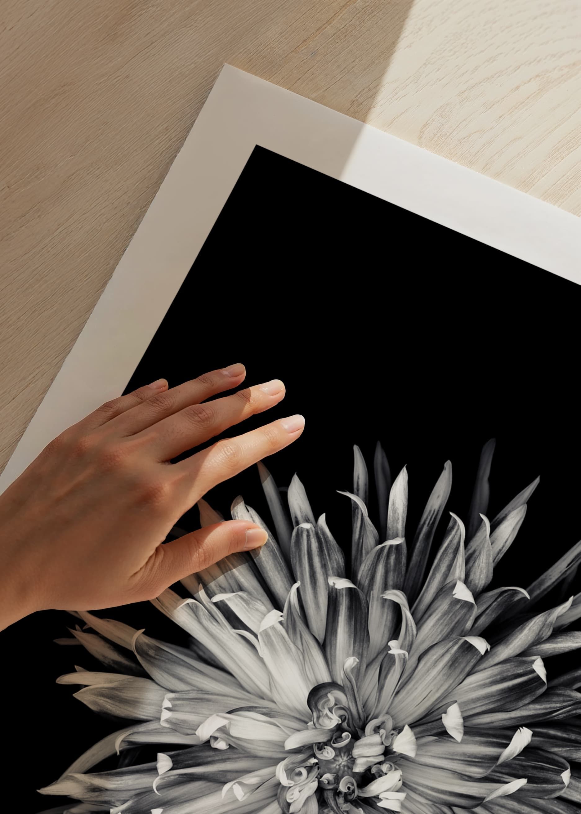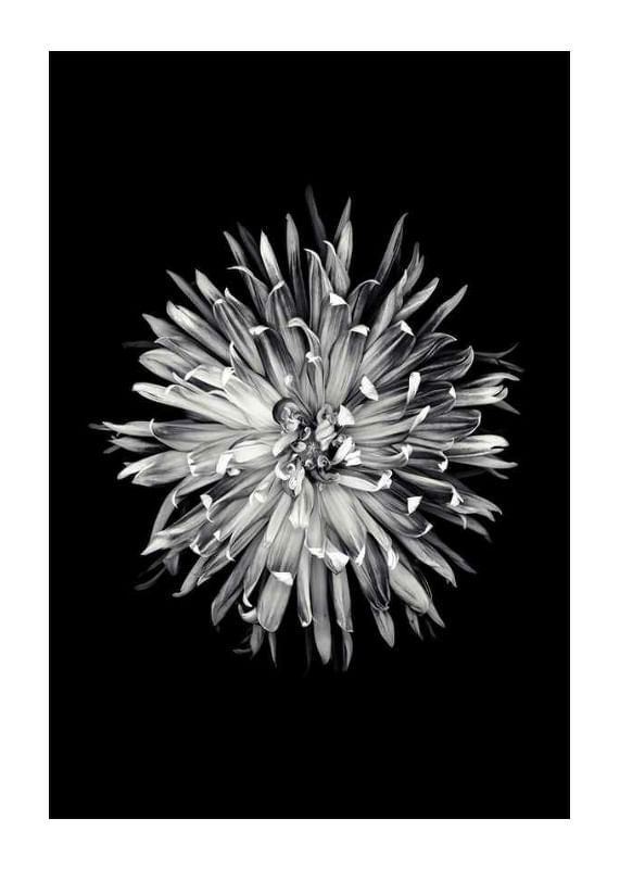Stilren närbild på en dahlia i svartvitt, där blomman framträder mot en helt mörk bakgrund. De smala, böjda kronbladen ger motivet dynamik och kontrast. Den grafiska effekten gör denna poster till ett starkt inslag i moderna utrymmen och den passar särskilt bra i rum där man vill ha ett tydligt botaniskt fokus.