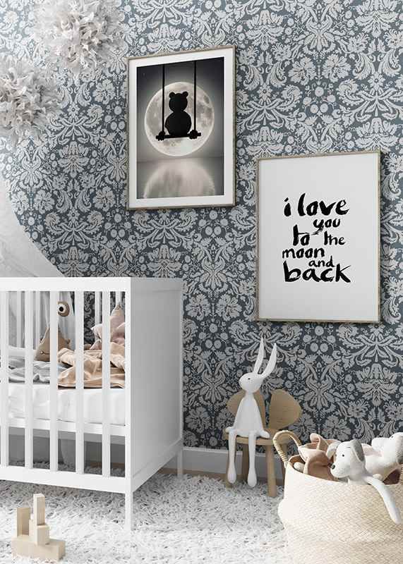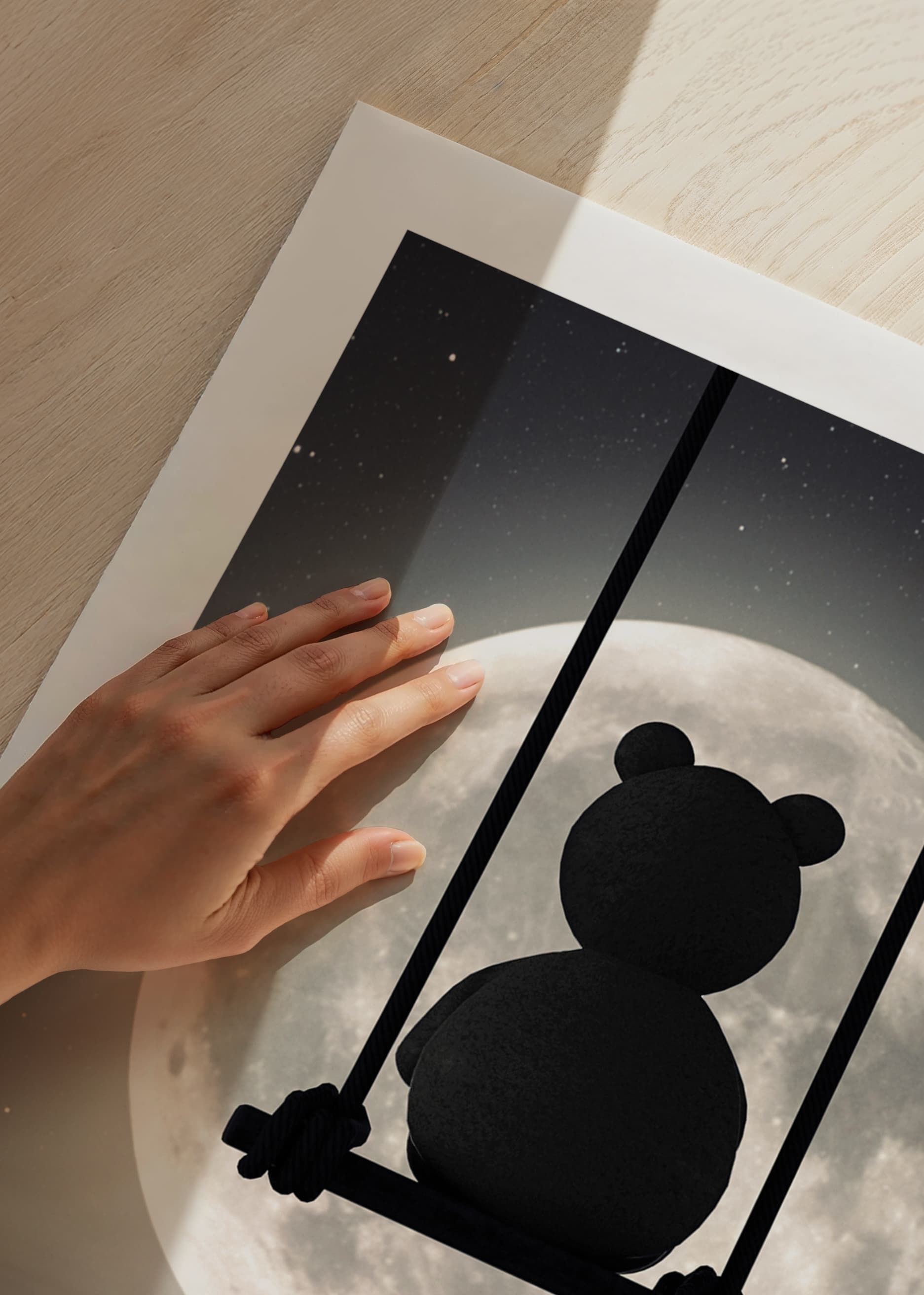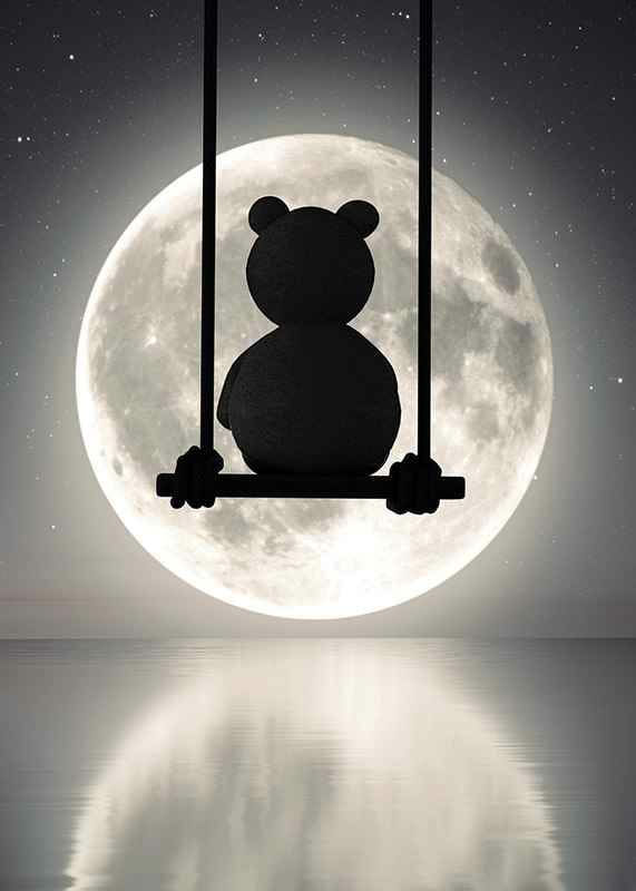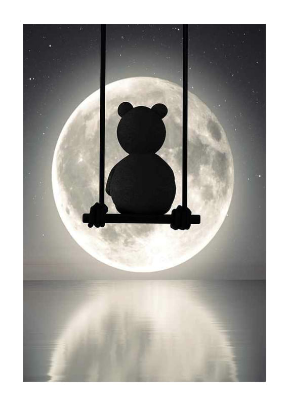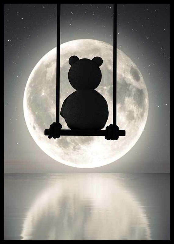Silhuetten av en teddybjörn sitter på en gunga i natten, med en stor lysande fullmåne och stjärnprickad himmel som bakgrund. Månen speglas i det stilla vattnet under motivet. Denna poster ger en lugn och drömsk känsla och passar fint till barnrum eller läshörna, gärna ihop med andra motiv i liknande stil.