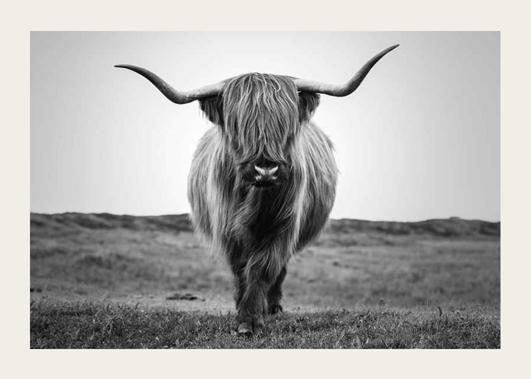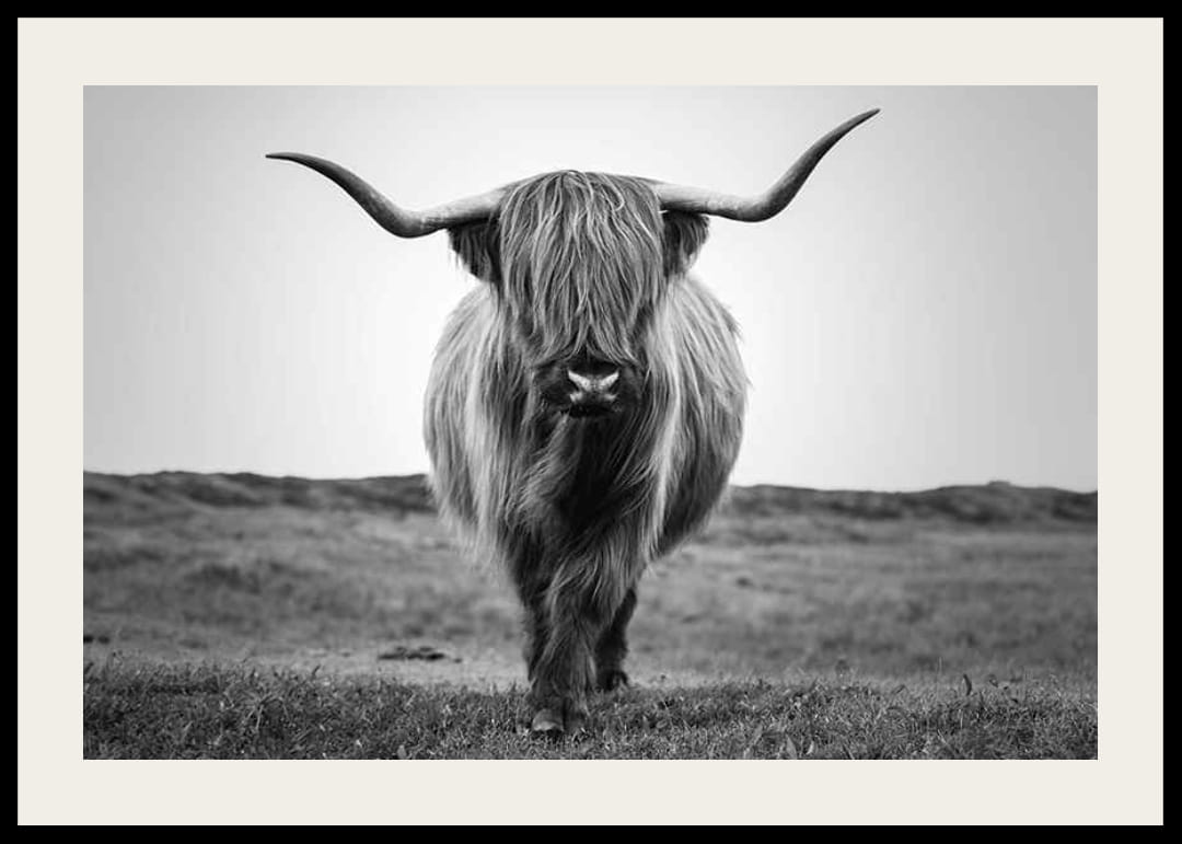En highland-ko står i centrum av motivet med sitt långa, täta hår och imponerande horn. Bakgrunden är suddig och landskapet öppet, vilket framhäver den svartvita fotots kontraster. Okomplicerad och naturlig känsla gör denna poster lätt att kombinera med både rustika och moderna inredningsstilar.