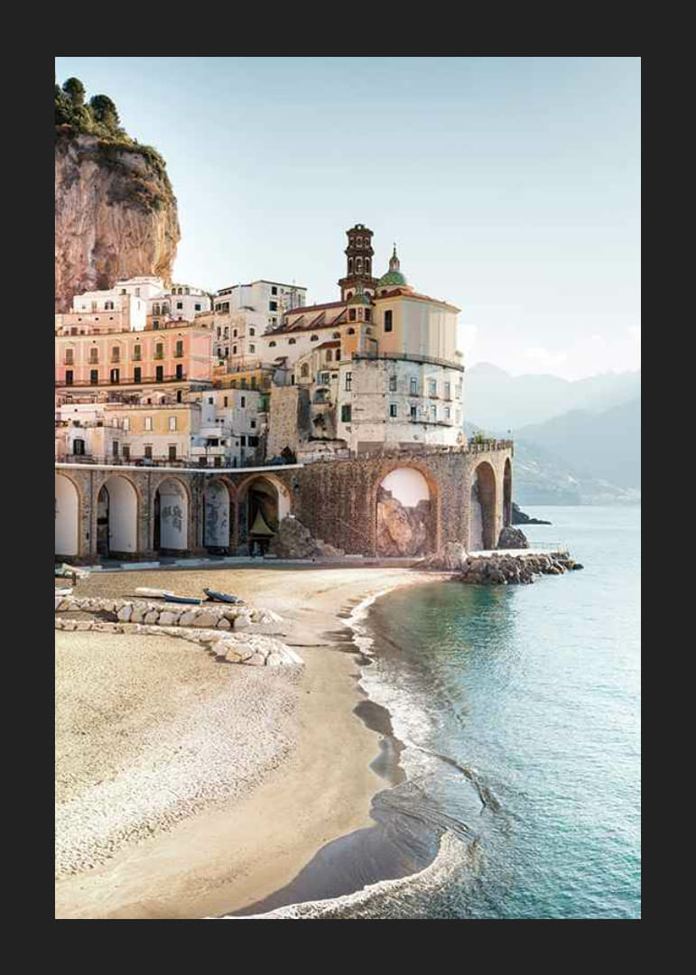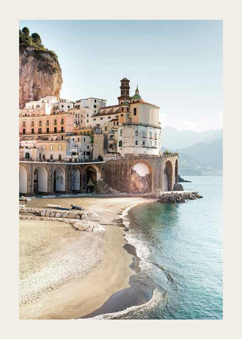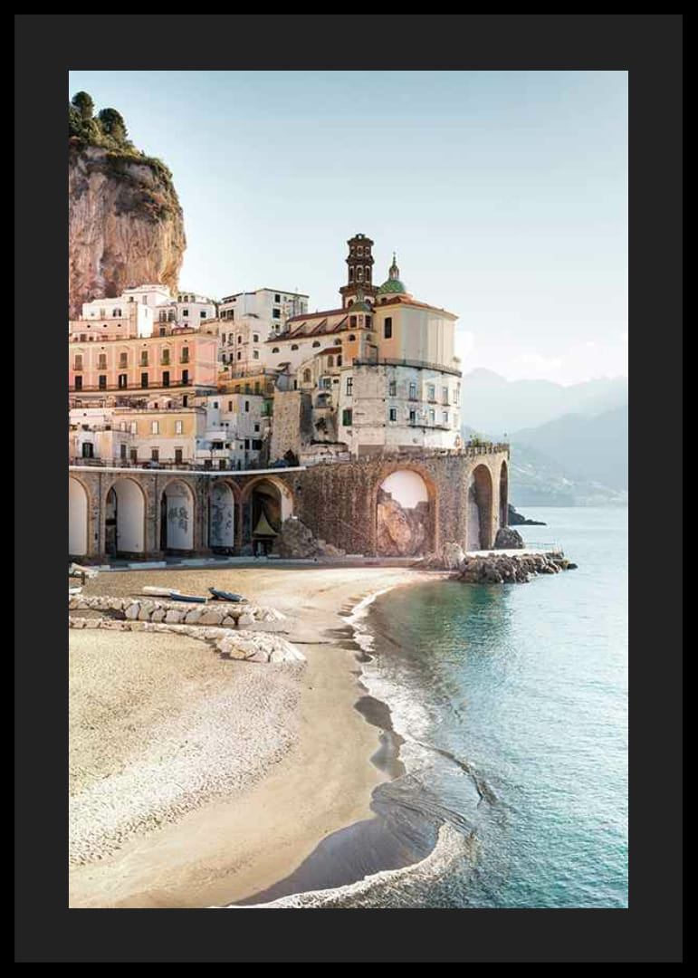 Pastellfärgade hus reser sig längs klipporna vid Amalfikusten och blickar ut över det lugna, turkosa Medelhavet. Bågar och valv i stadens konstruktion speglas i vattnet nedanför och en sandstrand sträcker sig längs kajen. Denna poster fångar Amalfi Italiens ikoniska skönhet och för in en känsla av sydländsk atmosfär i både vardagsrum och kök.
