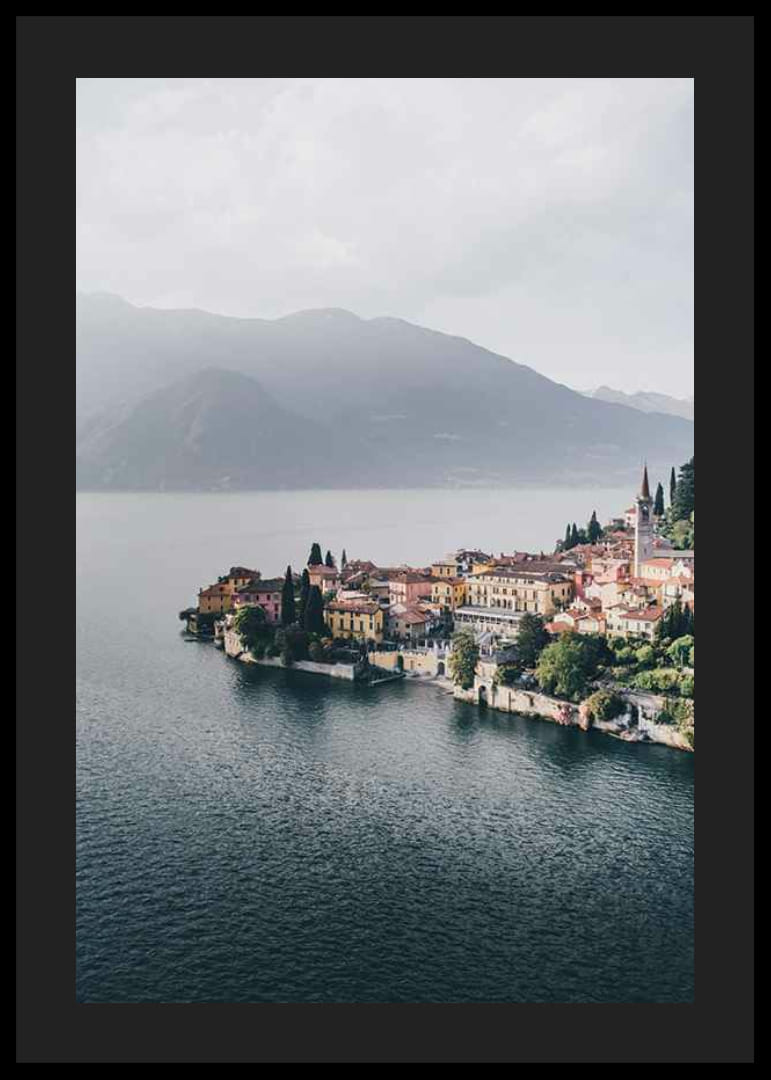 Färgstarka hus med tegelröda tak omges av cypresser vid en sjö, med dimhöljda berg i bakgrunden. Den italienska byn Bellagio vid Comosjön sträcker sig ut i vattnet och skapar en lugn känsla. Med sitt fylliga ljus och natursköna vyer ger denna poster en inbjudande atmosfär till vardagsrum eller hall.