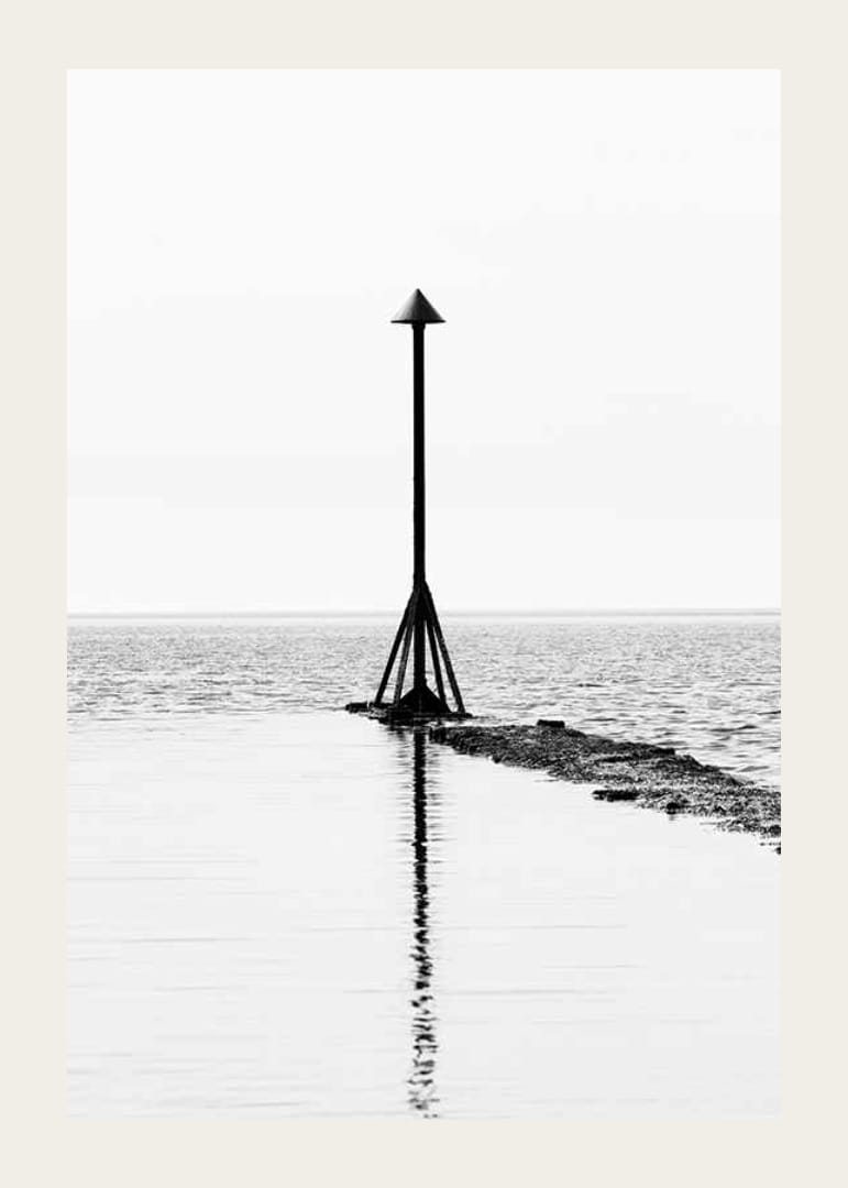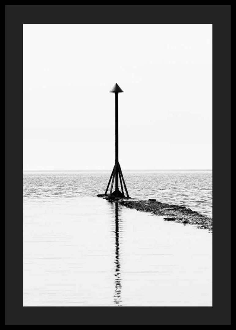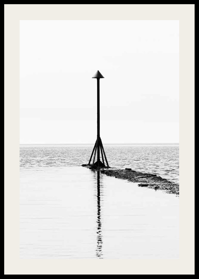 Ett ensamt sjömärke med konisk topp står ute på en stenbrygga som sträcker sig i vattnet. Klara svartvita kontraster och grafisk enkelhet präglar motivet. Vattenytan speglar sjömärket, vilket skapar en balanserad och lugn känsla. Denna poster passar i rum där enkelhet och tidlöshet värdesätts.