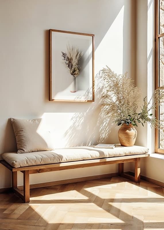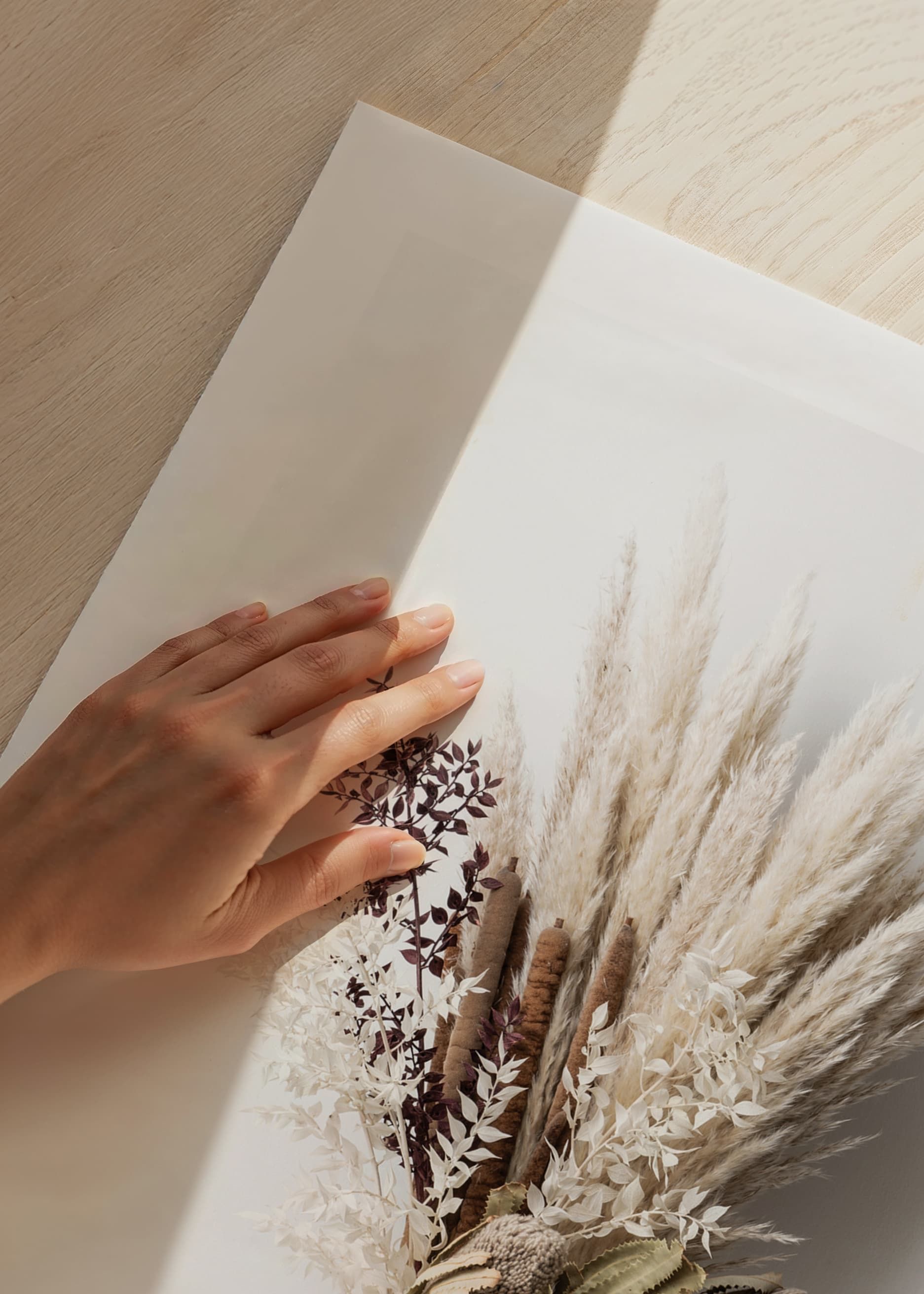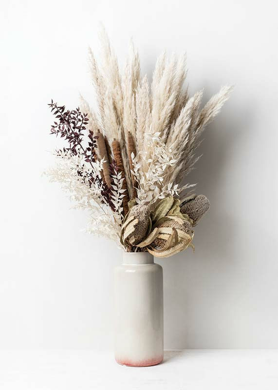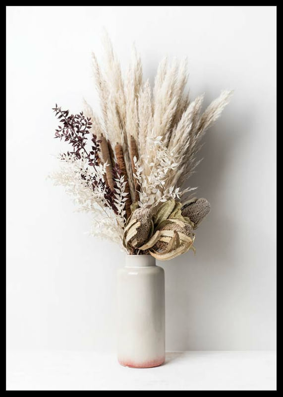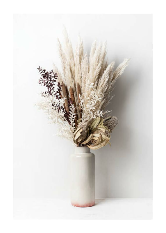 Arrangemang av pampasgräs och torkade växter i mjuka beige och naturvita toner, placerade i en elegant ljus keramisk vas mot enfärgad bakgrund. Den botaniska posten ger ett luftigt och stilrent intryck och passar bra i allt från vardagsrum till sovrum där en naturlig och lugn känsla önskas.