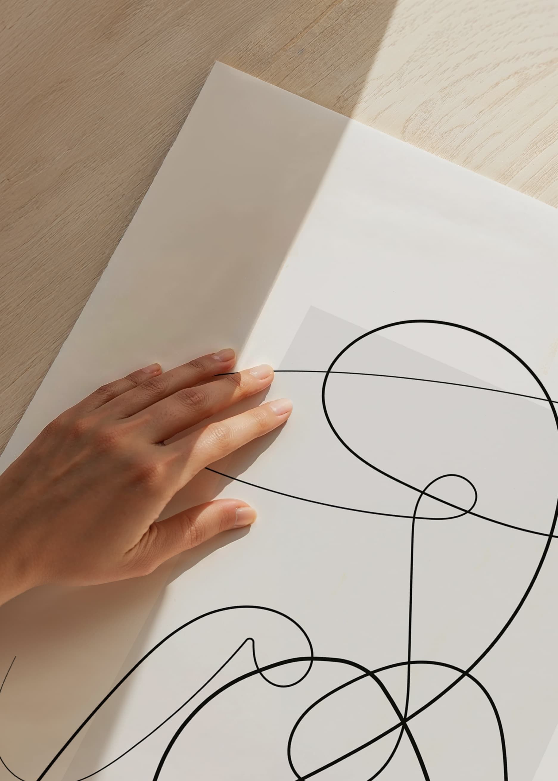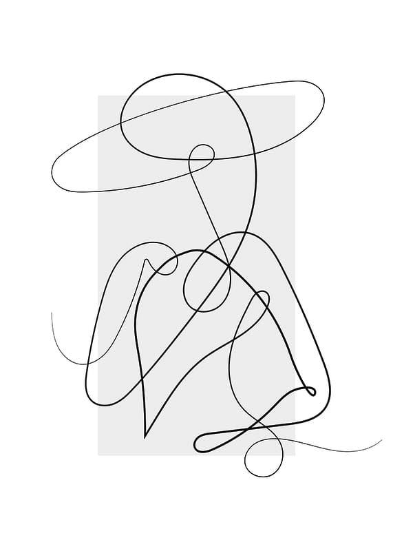 Motivet består av en stiliserad mänsklig figur skapad med en obruten svart linje mot vit bakgrund, där en hatt och kropp tydligt framträder. En ljusgrå rektangel i bakgrunden ger extra kontrast. Den här posten ger ett modernt och luftigt uttryck till exempelvis vardagsrum eller arbetsrum.