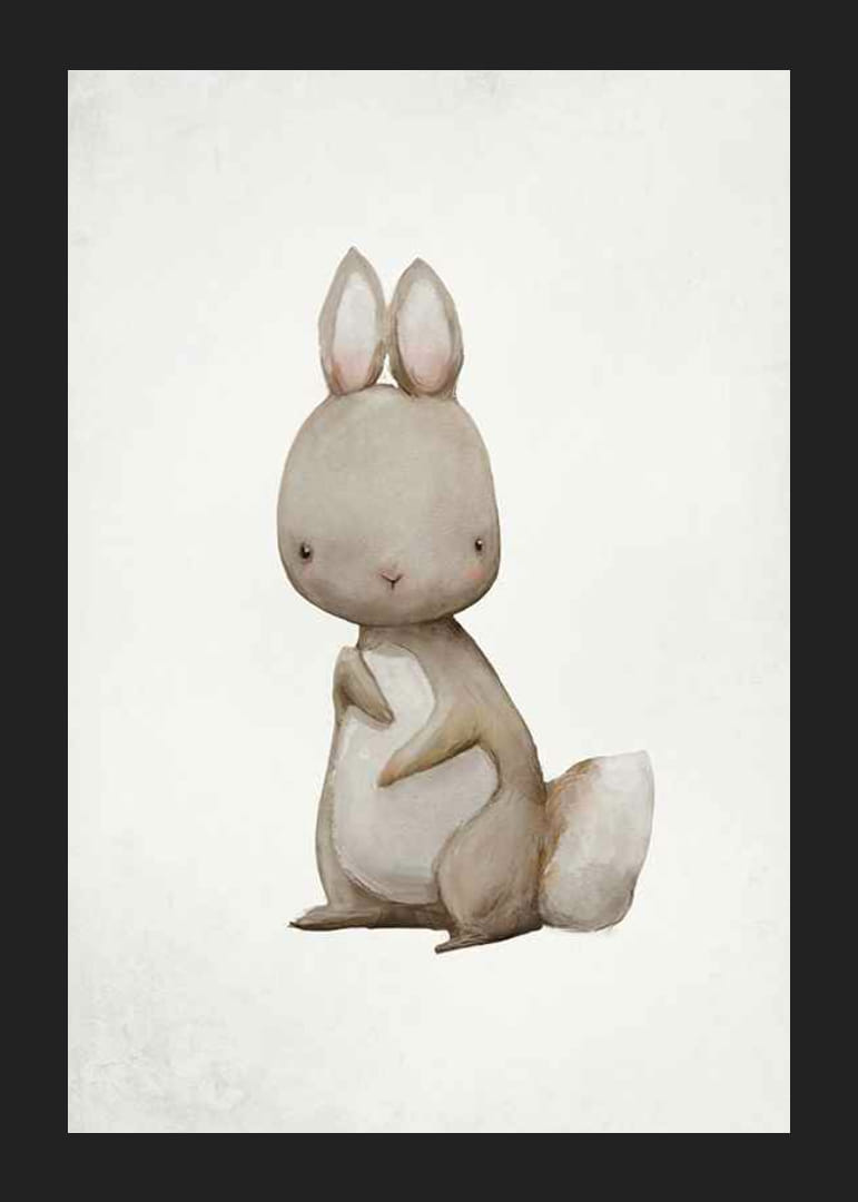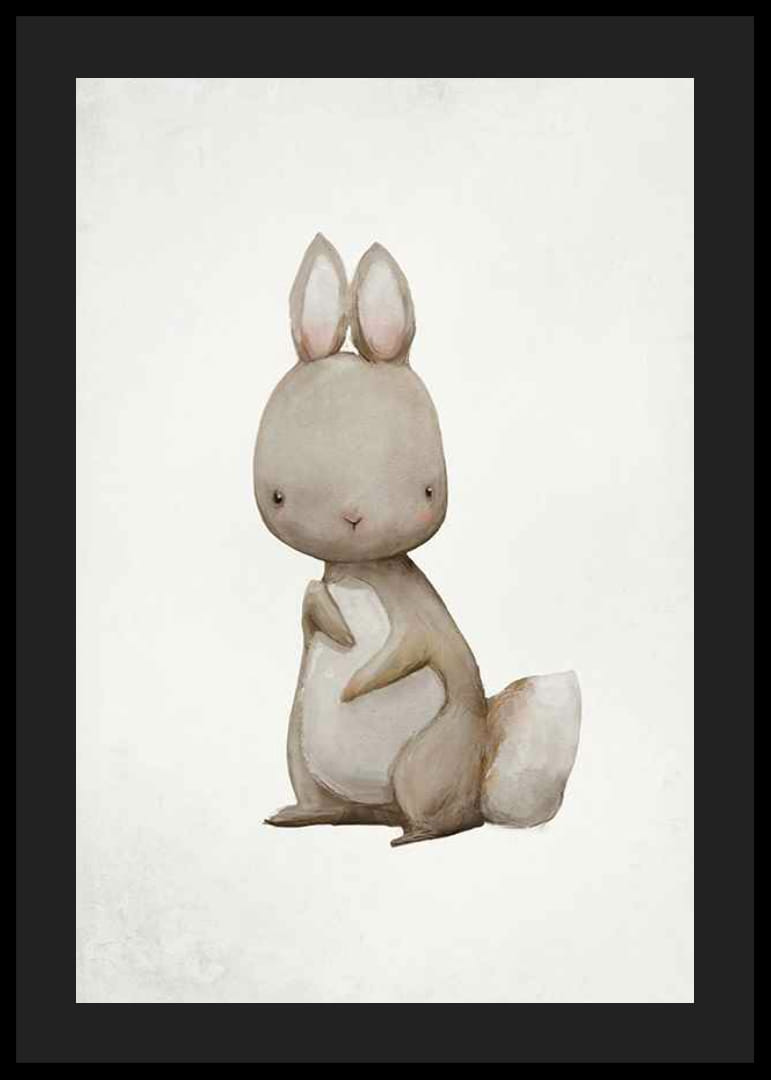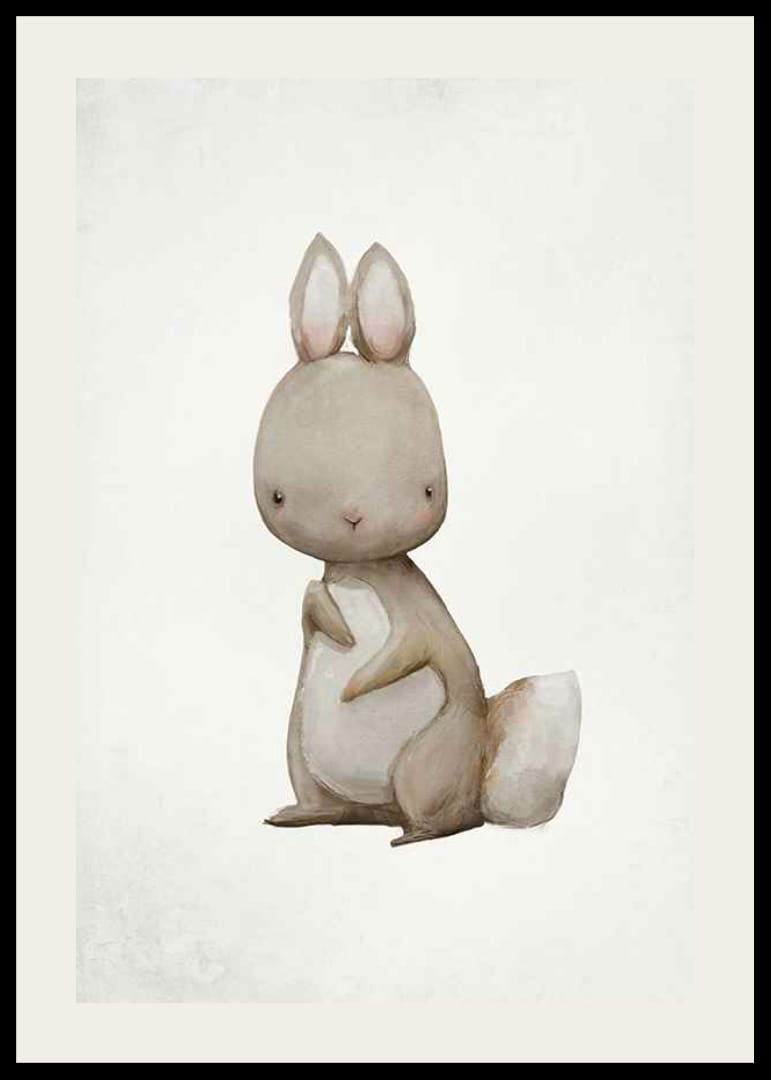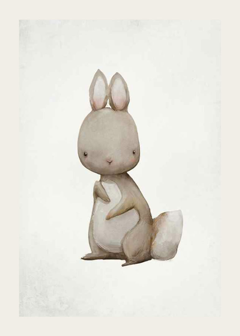 En stillsam hare i mjuka beige och grå nyanser står upprätt mot en ljus, lätt texturerad bakgrund. De stora öronen och enkla formerna ger ett vänligt uttryck som passar barnrum eller lekrum. Denna poster ingår i en serie med djurmotiv och tillför en varm, lekfull känsla till hemmets yngre miljöer.