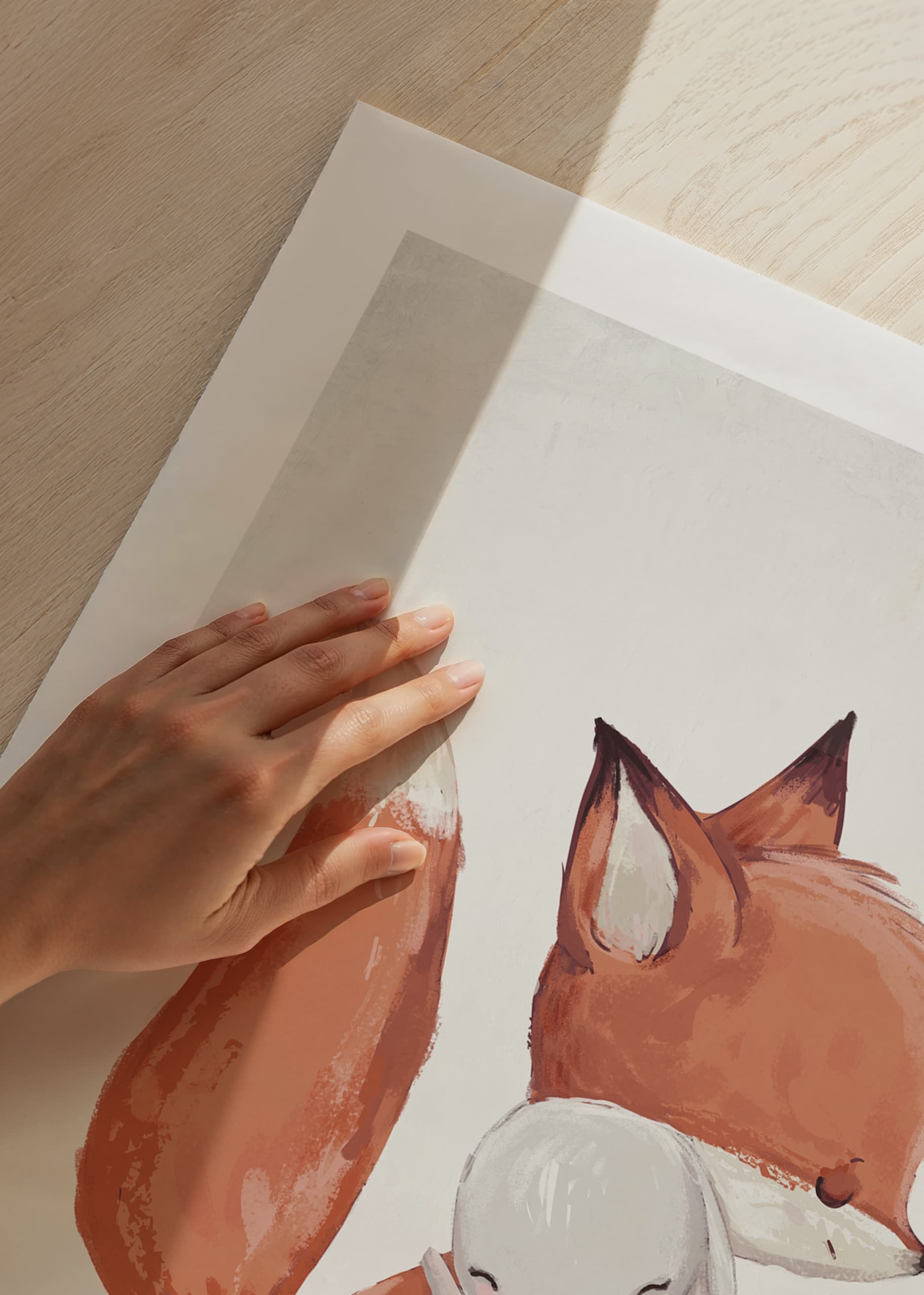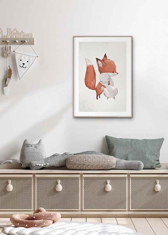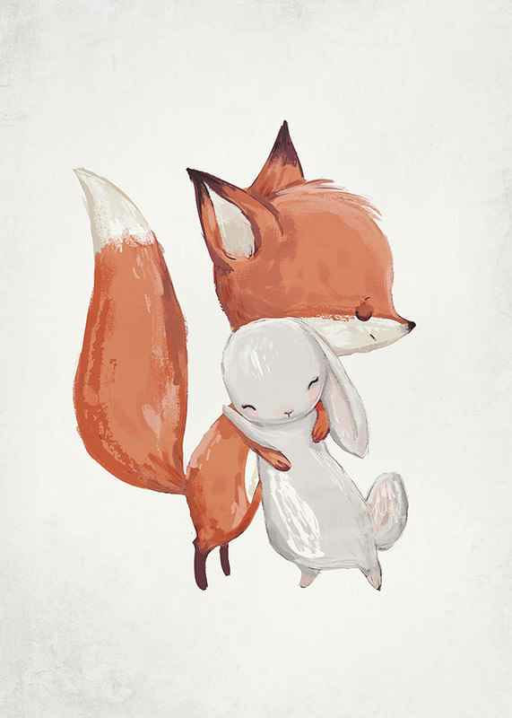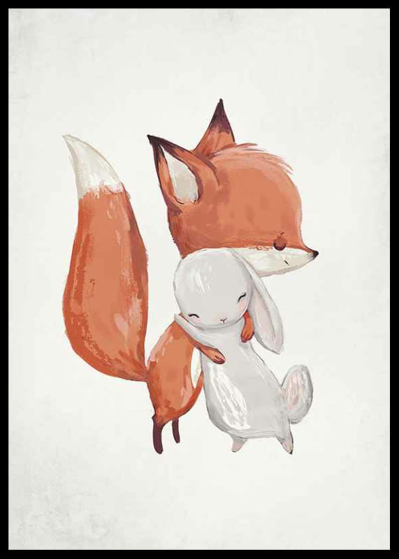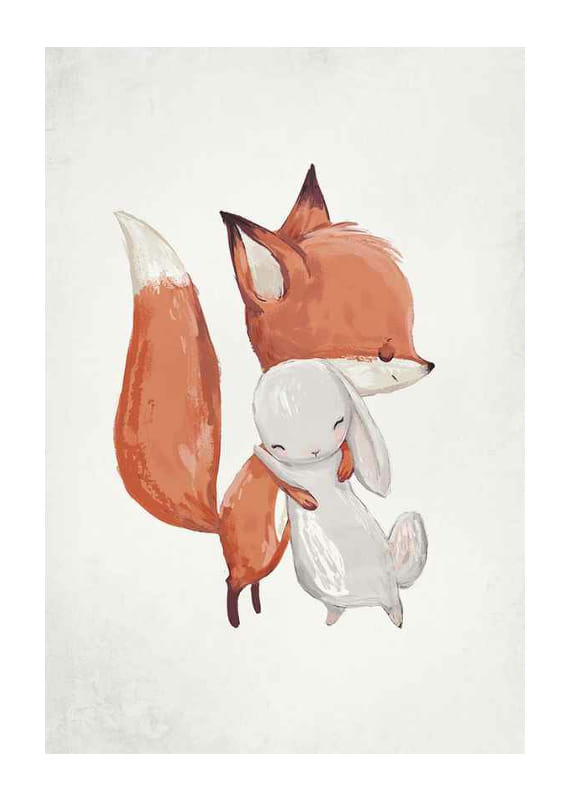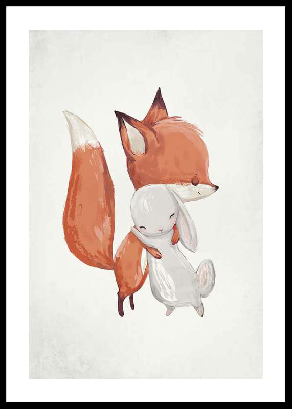 Motivet består av en rödbrun räv och en ljusgrå kanin som omfamnar varandra med slutna ögon, målade i en mjuk akvarellstil. De mjuka färgövergångarna och den ljusa bakgrunden ger ett behagligt och vänligt uttryck. En poster som lyfter barnrummets atmosfär med ett varmt och lekfullt inslag.
