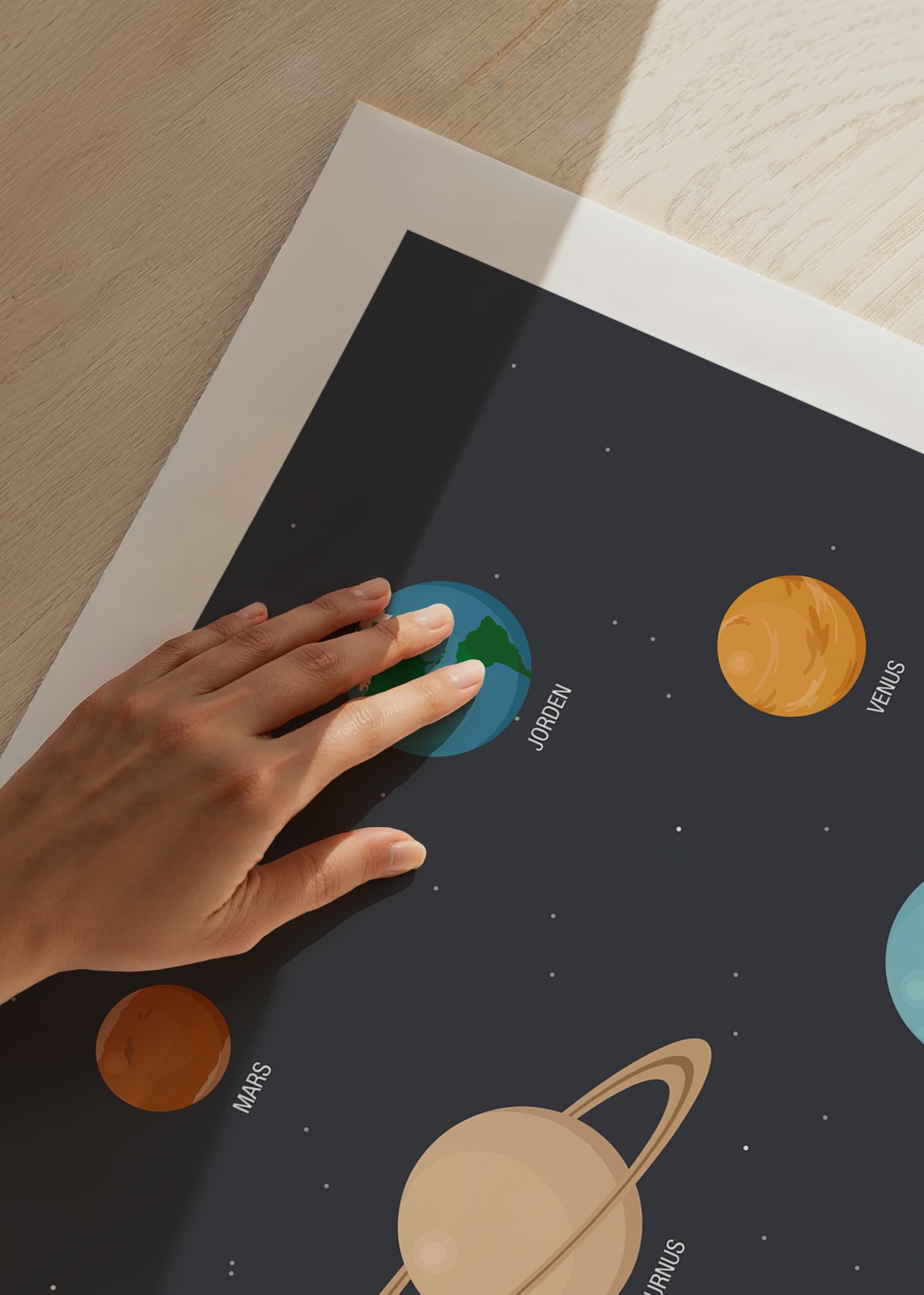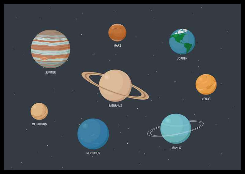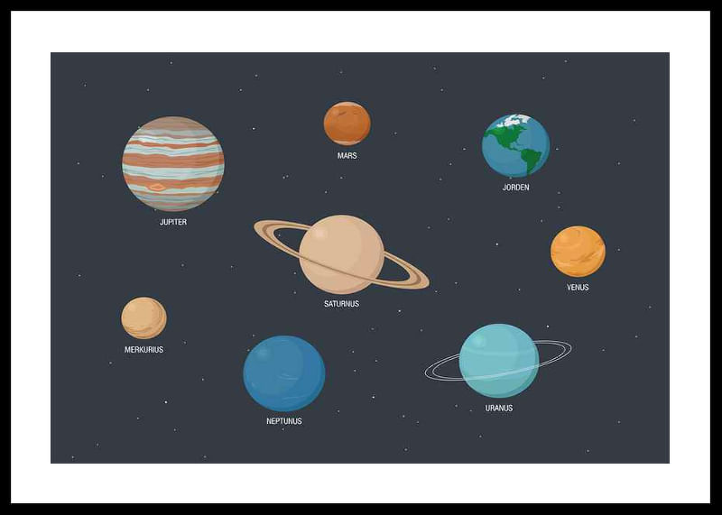 Solsystemets åtta planeter presenteras som tydliga illustrationer mot en mörk stjärnhimmel. Varje planet är namngiven och avbildad med unika färger och detaljer såsom Saturnus ringar och Jordens blå-gröna mönster. Denna poster ger ett lekfullt och lärorikt inslag till barnrummet eller lekrummet.