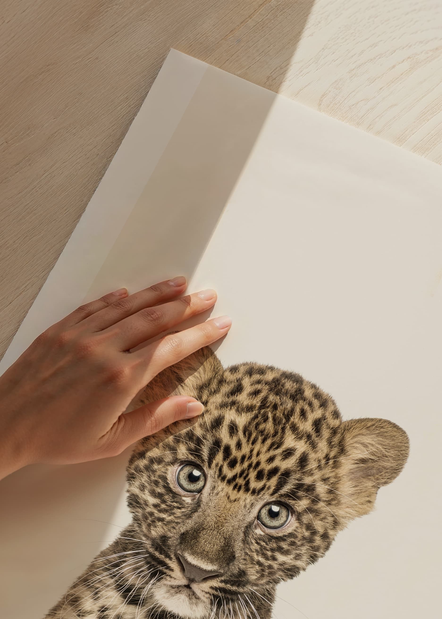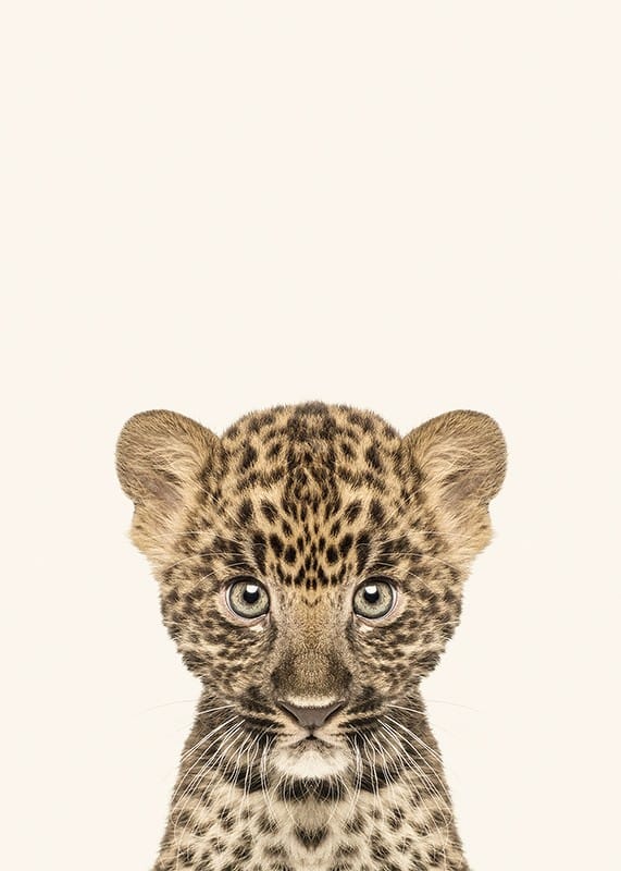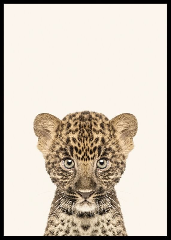 Närbild av en leopardunge med stora ögon och tydliga fläckar mot en helt ljusbeige bakgrund. Detaljerna i ansiktet och pälsen framhävs i en stiliserad illustration som ger ett vänligt uttryck. Denna poster passar bra i barnrum eller lekhörna, ensam eller tillsammans med andra motiv ur samma serie.