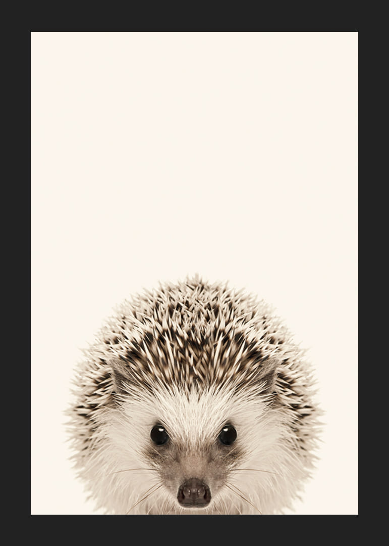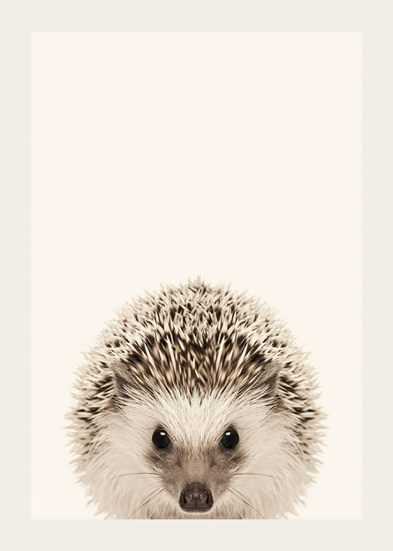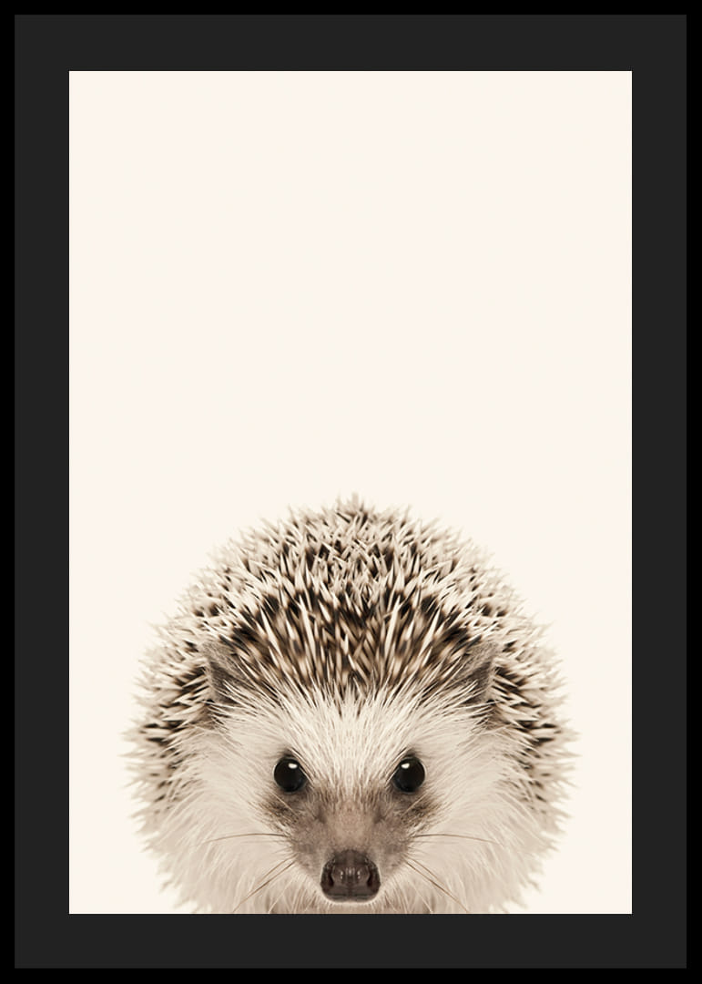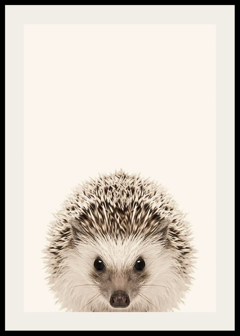 Motivet består av en närbild på en liten igelkottunge som tittar rakt fram med stora svarta ögon. Bakgrunden är enkel och ljus, vilket framhäver djurets taggar och mjuka ansikte. Denna poster passar naturligt i barnrum eller lekfulla miljöer där man vill skapa en varm och inbjudande atmosfär.