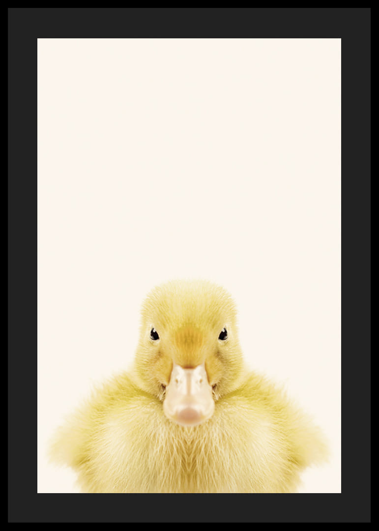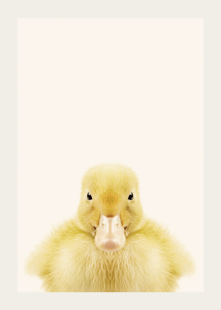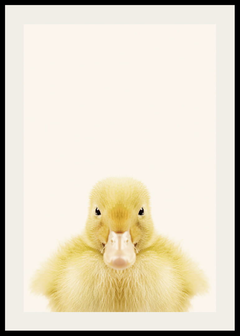 Motivet består av en närbild på en gul ankunge som står mot en mjuk, ljusbeige bakgrund. Fjädrarna är fluffiga och detaljerade, och ankungens blick är riktad rakt fram. Den minimalistiska kompositionen gör att postern skapar ett ljust och lekfullt uttryck, särskilt passande i barnrum eller lekrum.