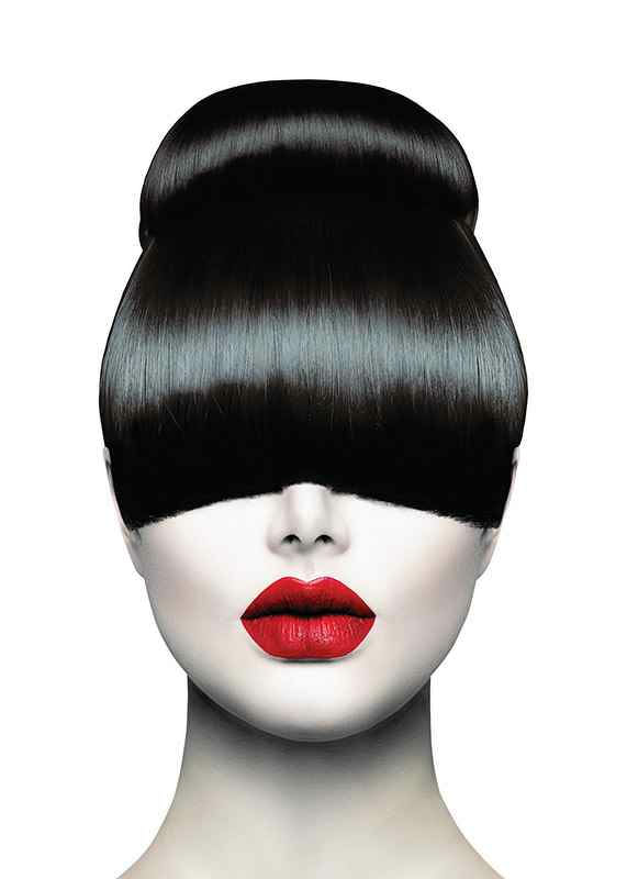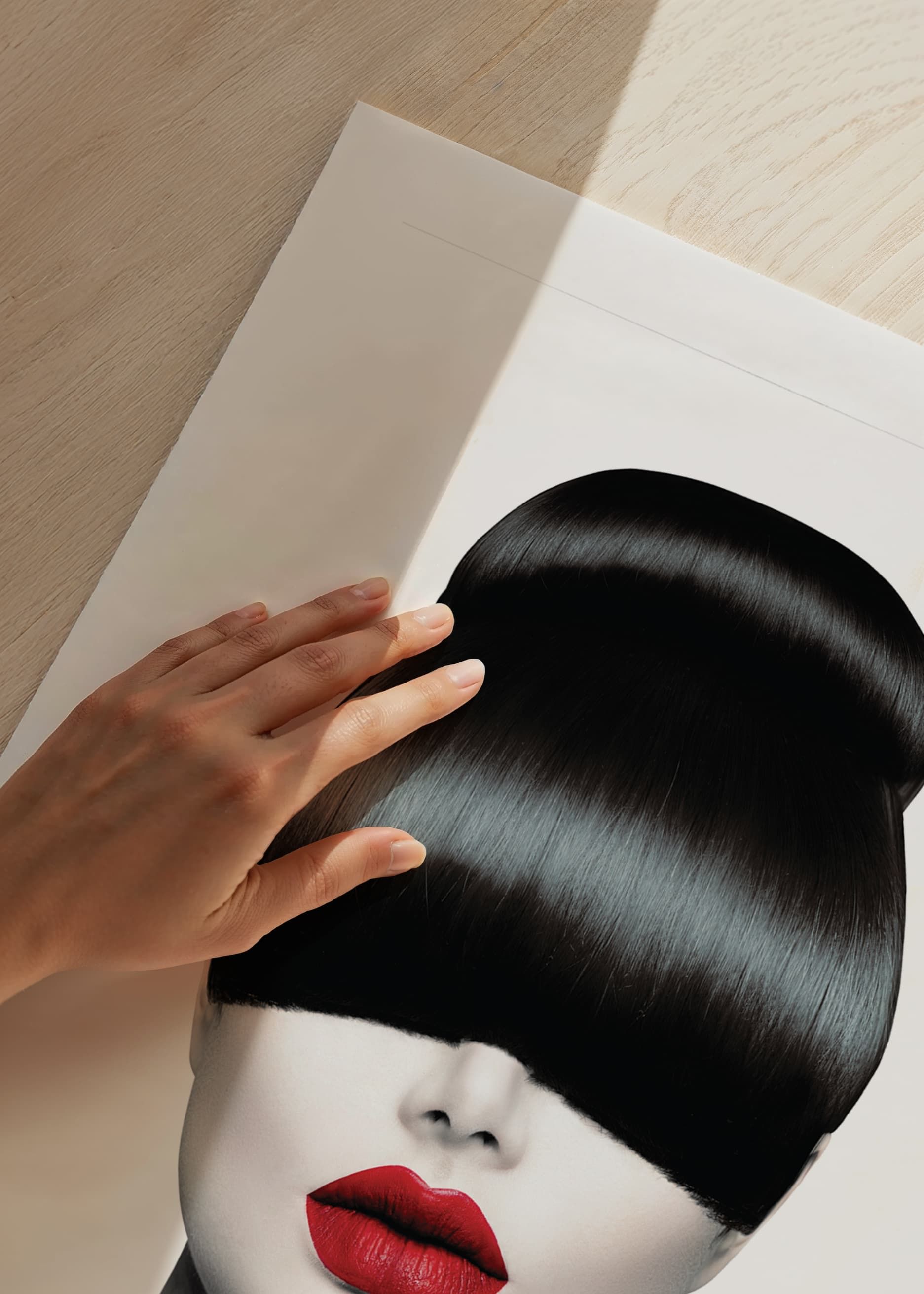 Motivet består av ett stiliserat porträtt i närbild av en kvinna med slät, svart uppsatt frisyr och rak lugg som täcker ögonen. Hudtonen är ljus och kontrasten mot de klarröda läpparna är tydlig. Den minimalistiska bakgrunden framhäver formen och färgerna. Postern passar till moderna rum med grafisk inredning.