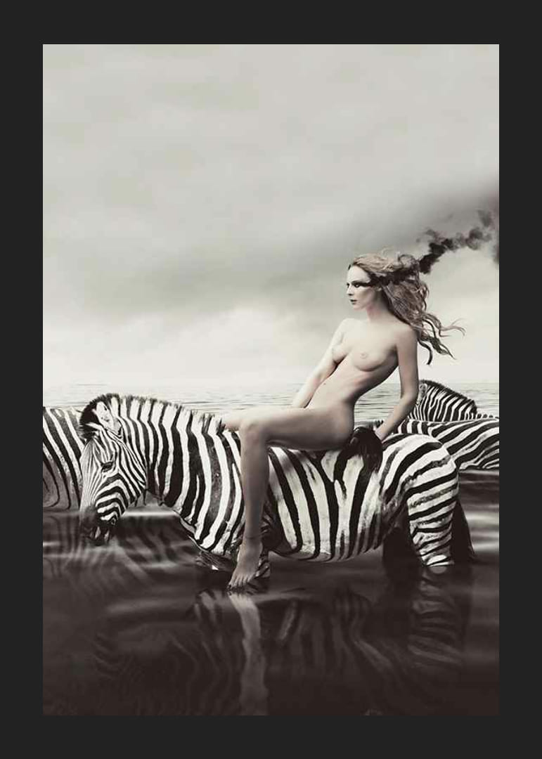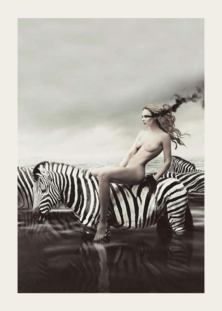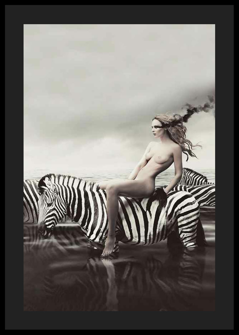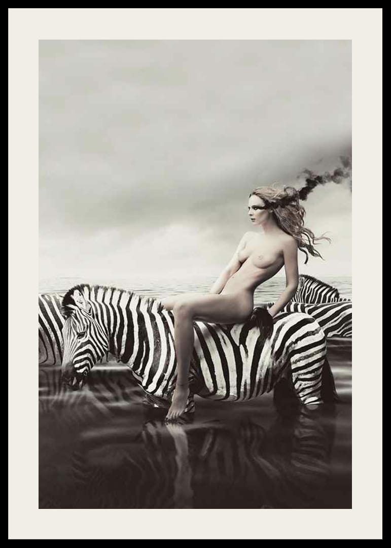 Motivet består av en naken kvinna som sitter på en zebra i grunt vatten, omgiven av fler zebror. Bilden går i svartvita, dämpade toner och har ett surrealistiskt uttryck med ett dramatiskt molntäcke och rök i bakgrunden. Denna poster ger en konceptuell och konstnärlig känsla till moderna hemmiljöer.