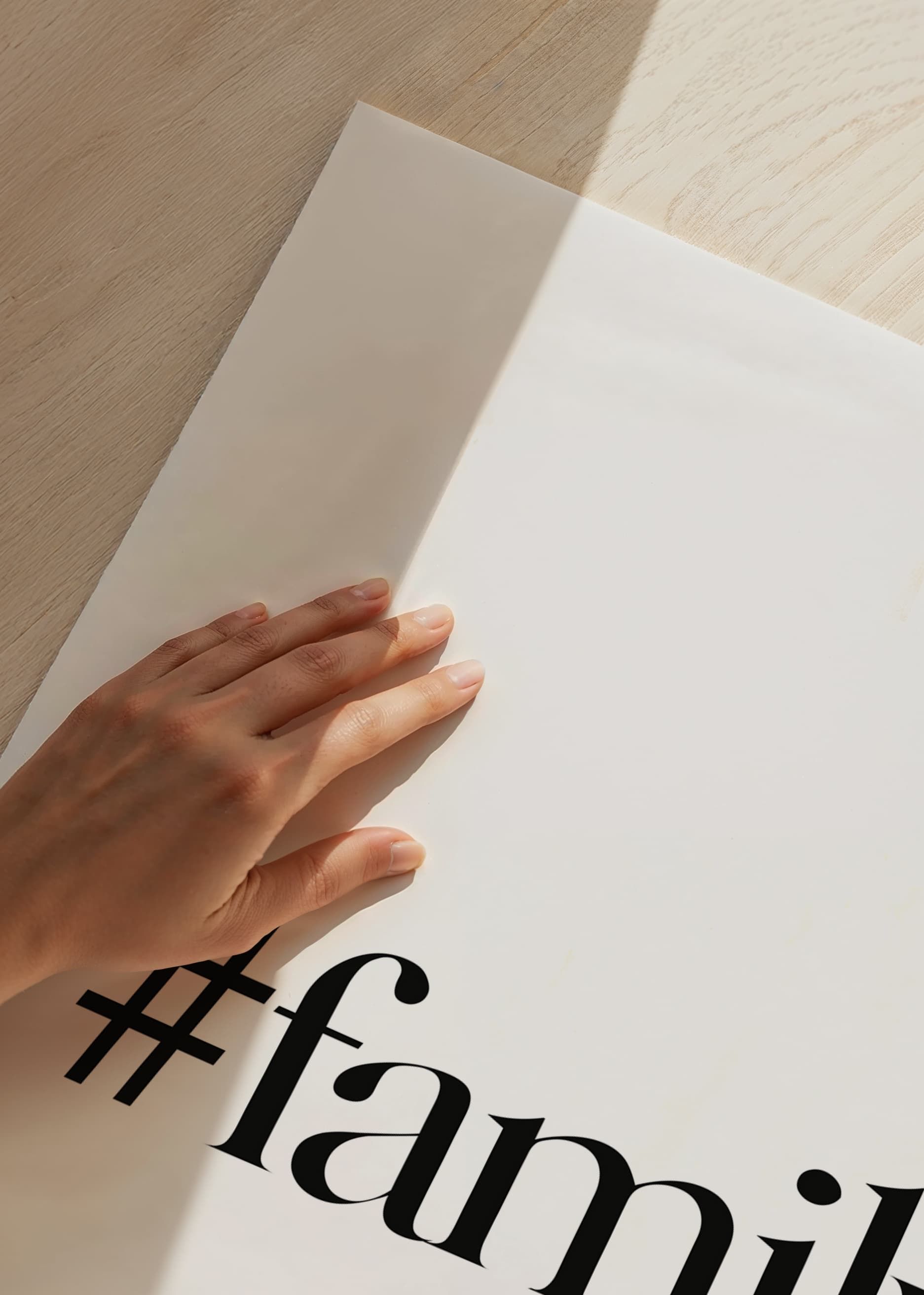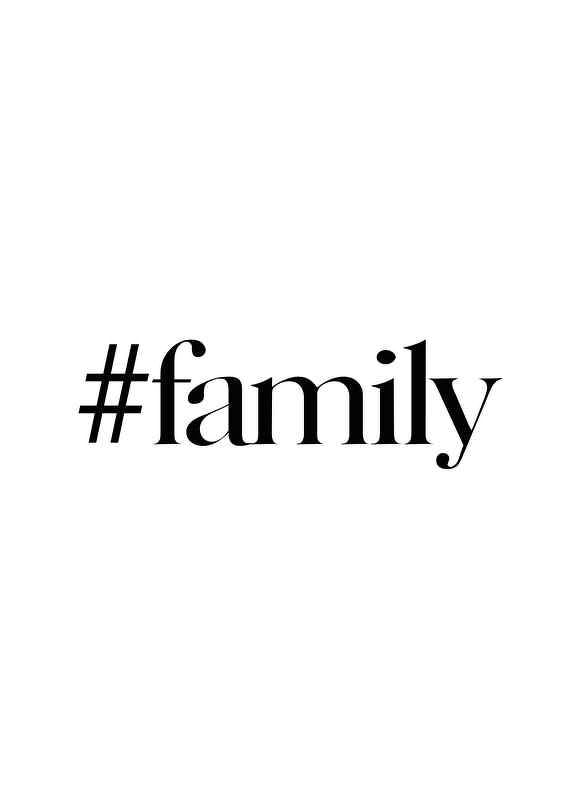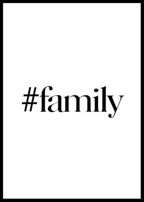 Stilren text i svart med ordet #family i en klassisk serifstil mot helt vit bakgrund. Den enkla kompositionen ger ett luftigt och modernt uttryck, vilket gör denna poster lättplacerad i hemmets olika rum. En diskret hyllning till gemenskap som passar lika bra i hallen som över matbordet.