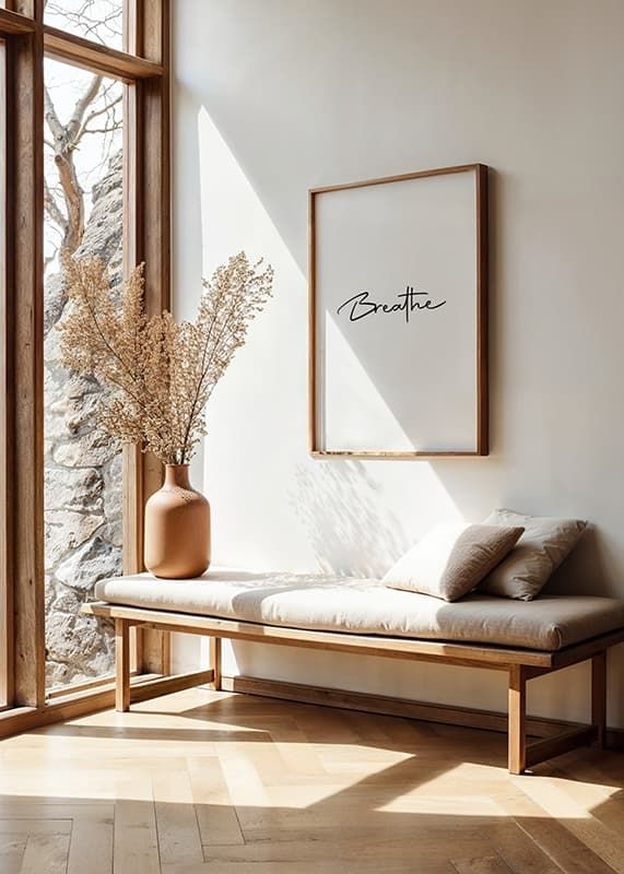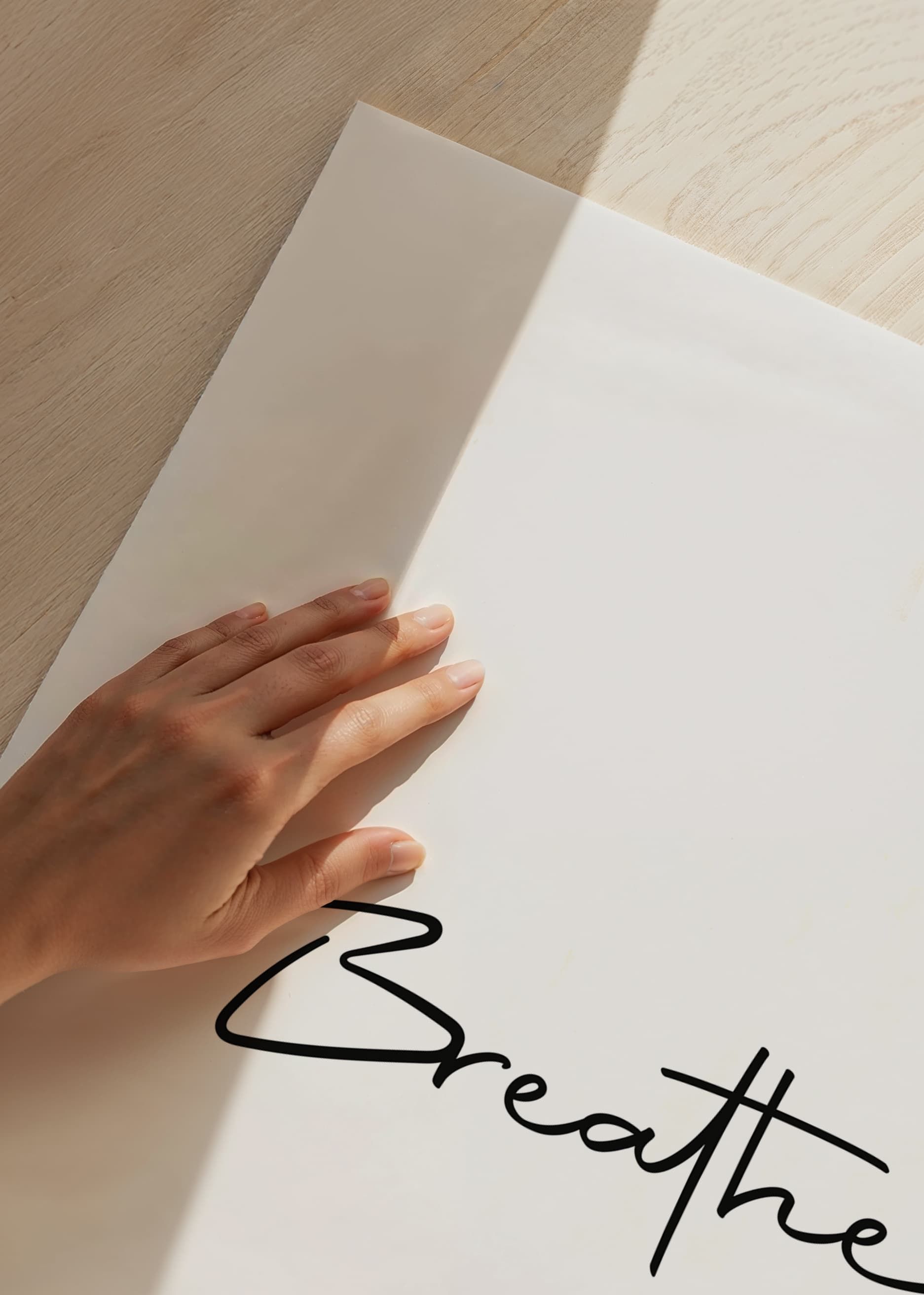 Handskriven text i svart med ordet ”Breathe” placerad centralt mot helt vit bakgrund. Den minimalistiska utformningen gör att postern passar i många olika miljöer, som hall, sovrum eller arbetsrum. Ett stilrent tillskott för dig som vill skapa en lugn och avskalad atmosfär med din poster.