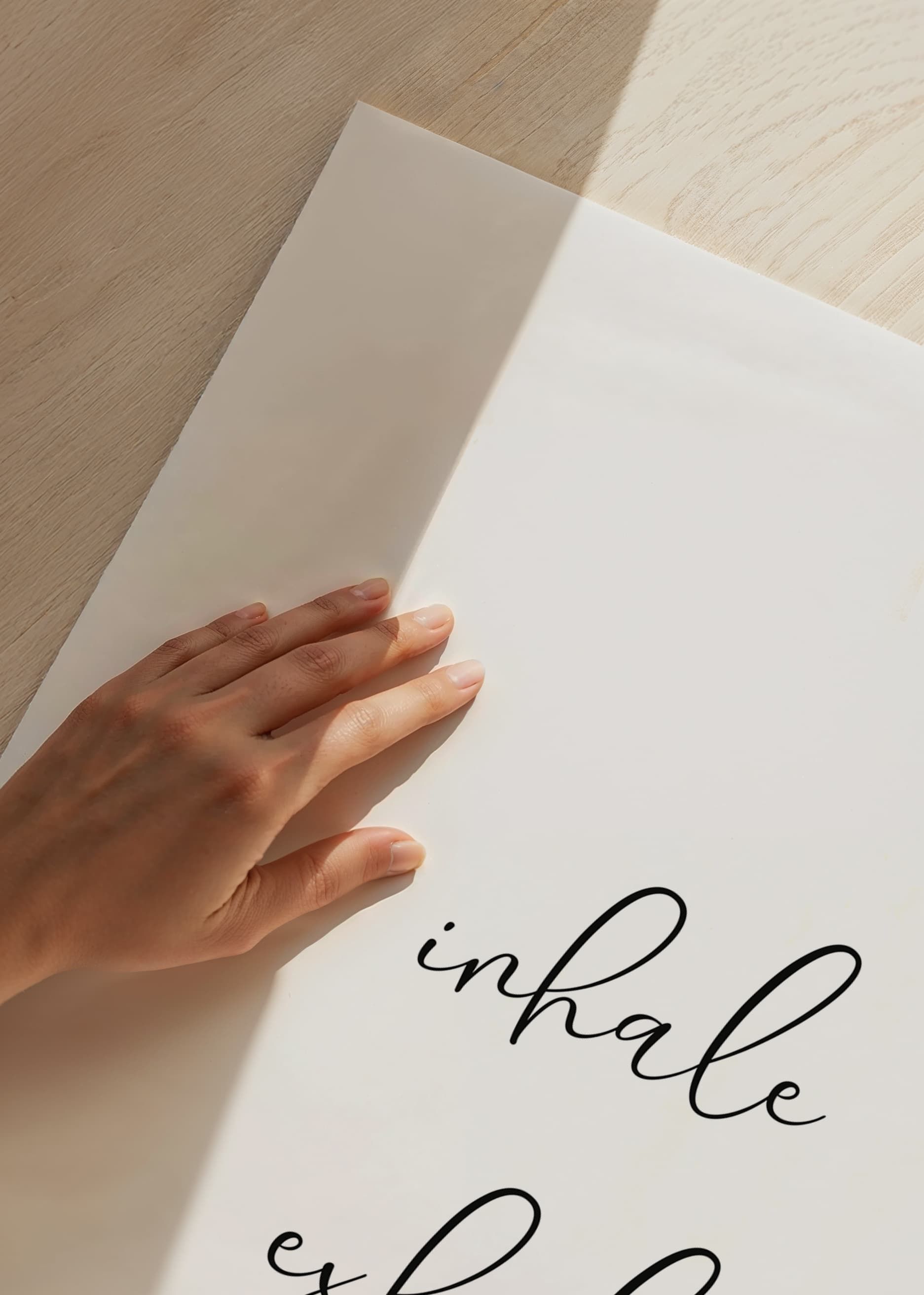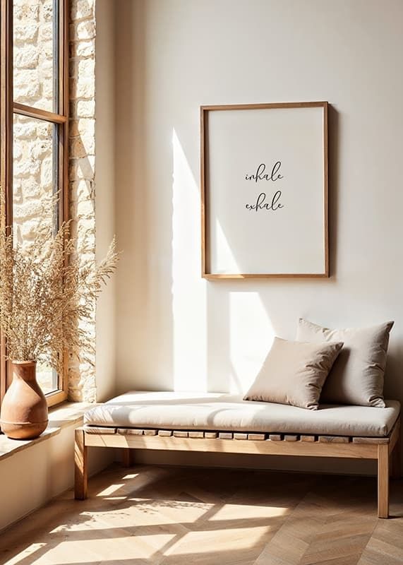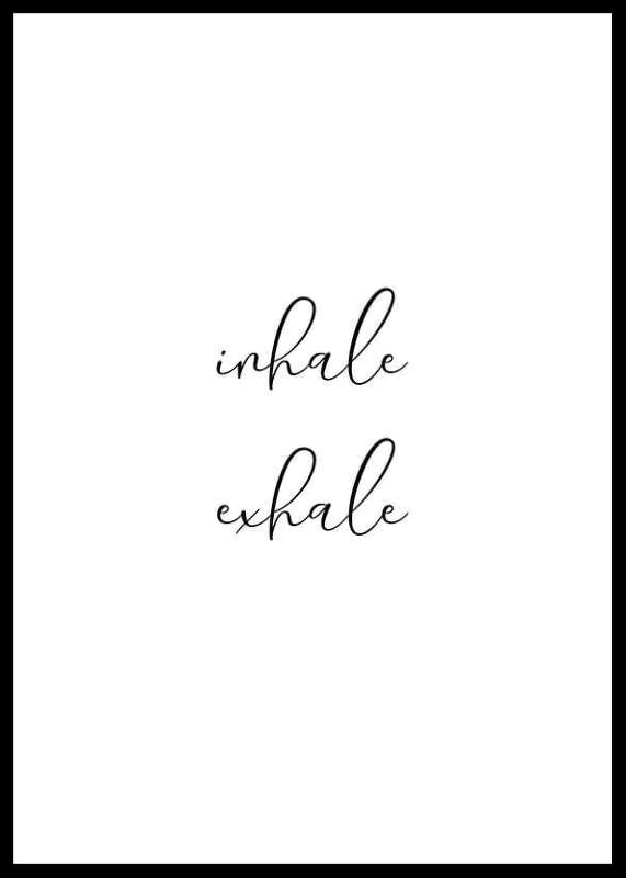 Två rader svart skrivstil mot vit bakgrund bildar orden ”inhale exhale”. Den minimalistiska designen och det luftiga utrymmet ger en modern känsla som passar i sovrum, vardagsrum eller kontor. Postern fungerar som en diskret påminnelse om lugn och närvaro och smälter in i många olika typer av inredningar.