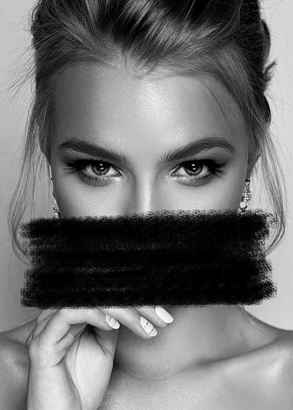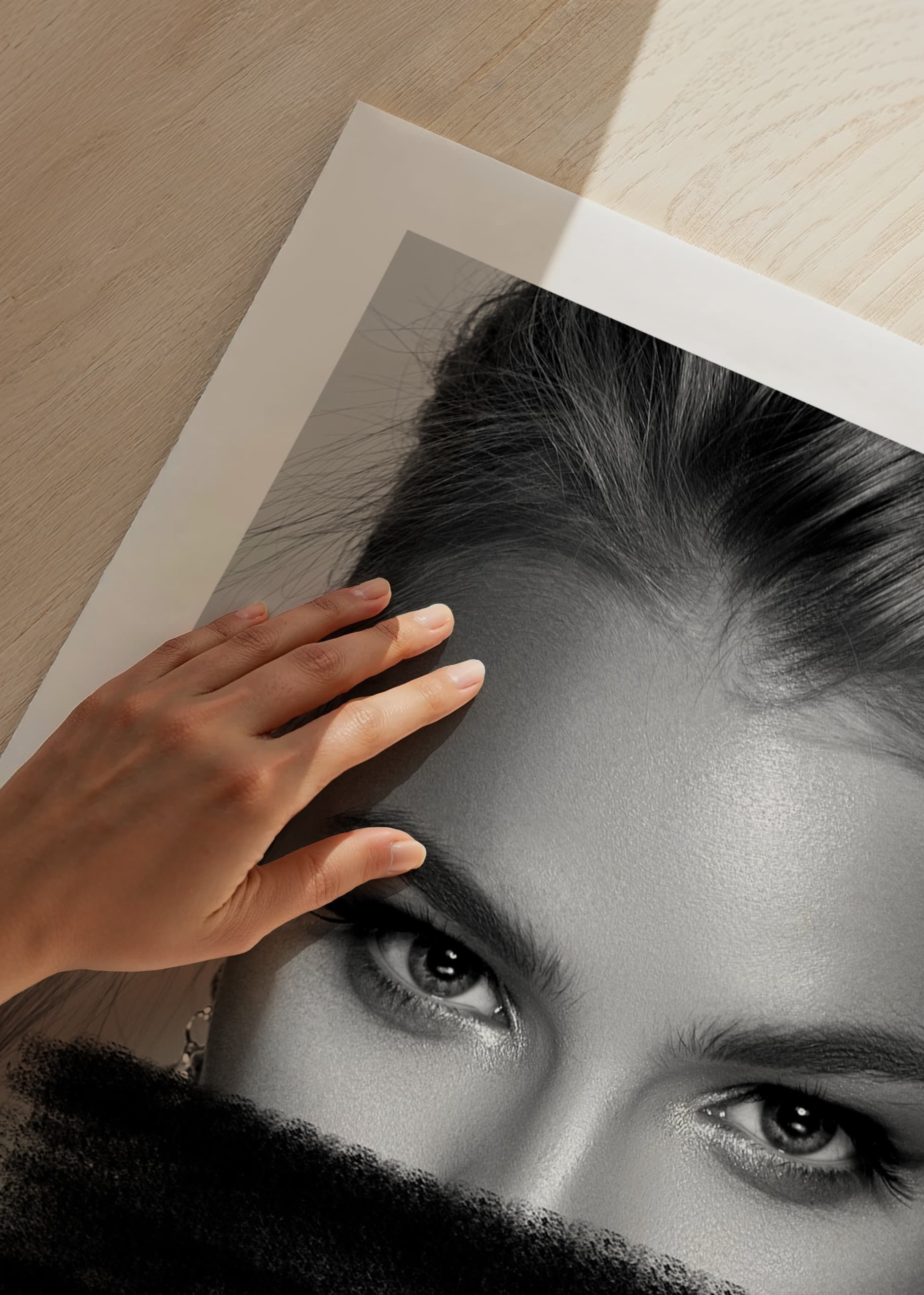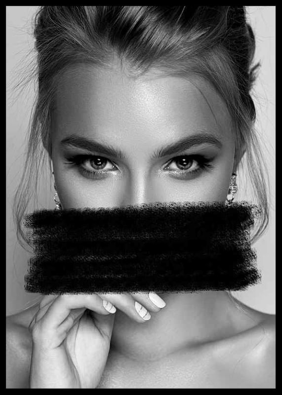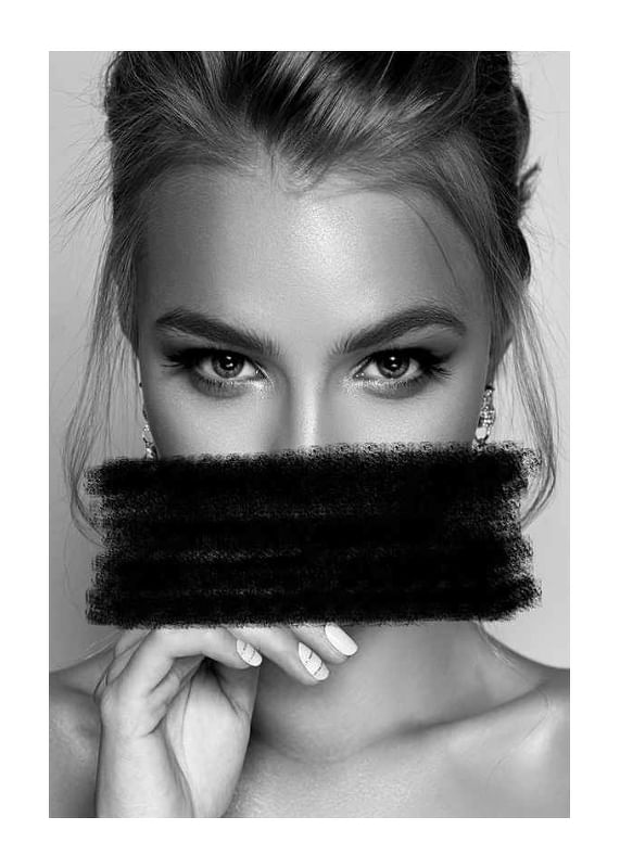 Kontrastrikt svartvitt porträtt där en ung kvinna med ljusa drag och markerad blick står i centrum. Munnen och nedre delen av ansiktet är täckt av breda svarta penseldrag, vilket ger bilden ett grafiskt uttryck. Posters av det här slaget passar särskilt bra i moderna miljöer som vill utmana med ett starkt visuellt intryck.
