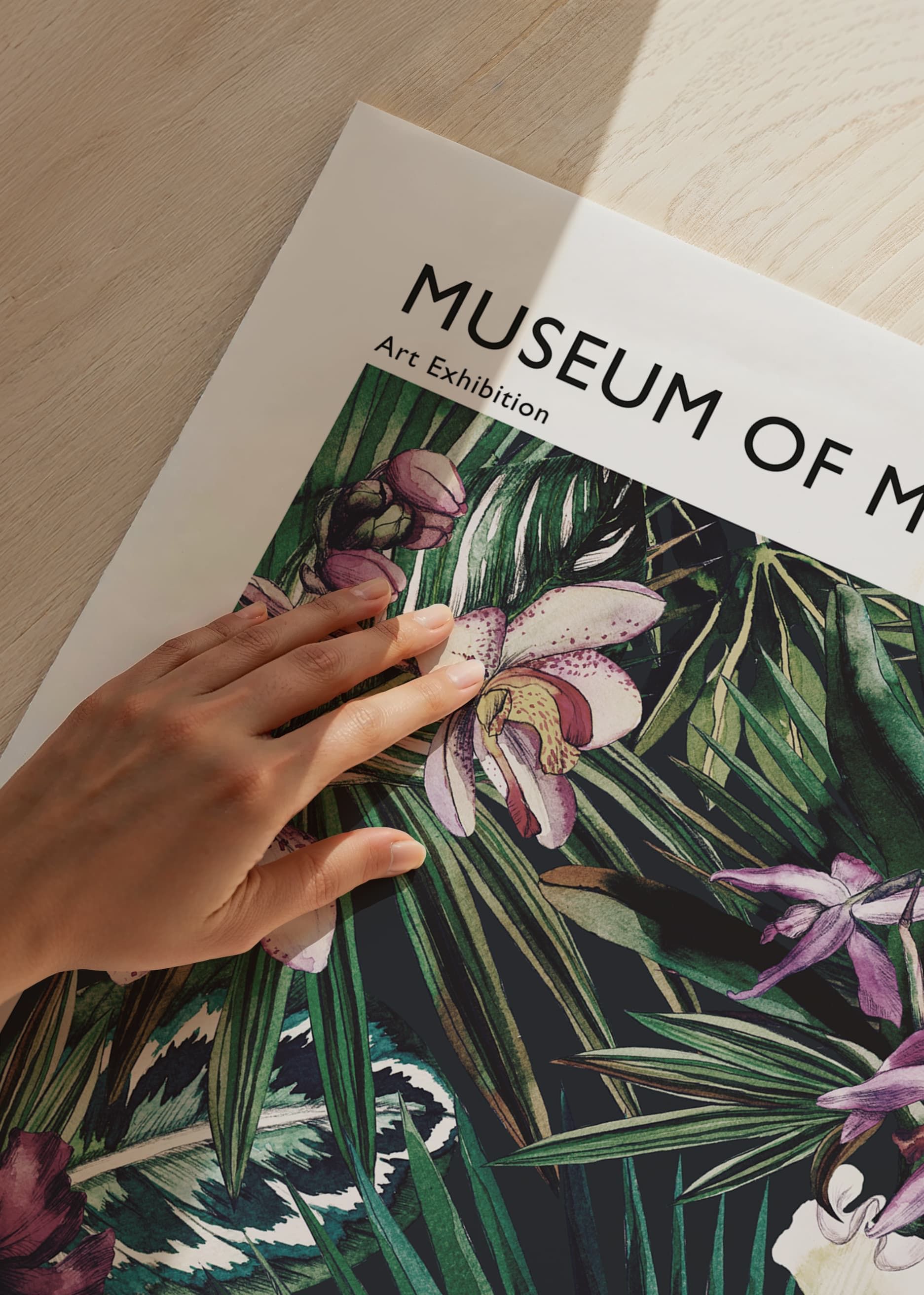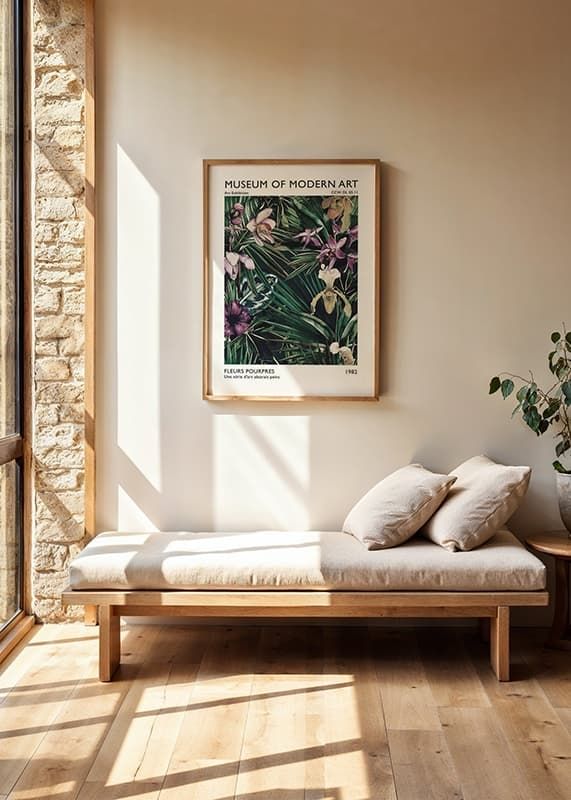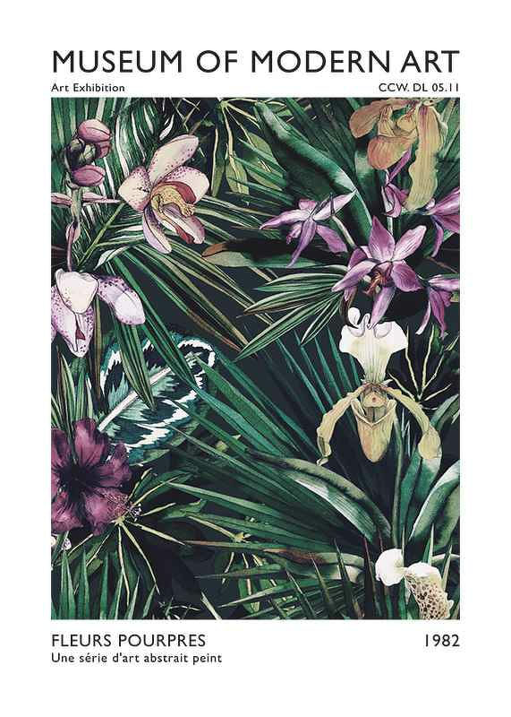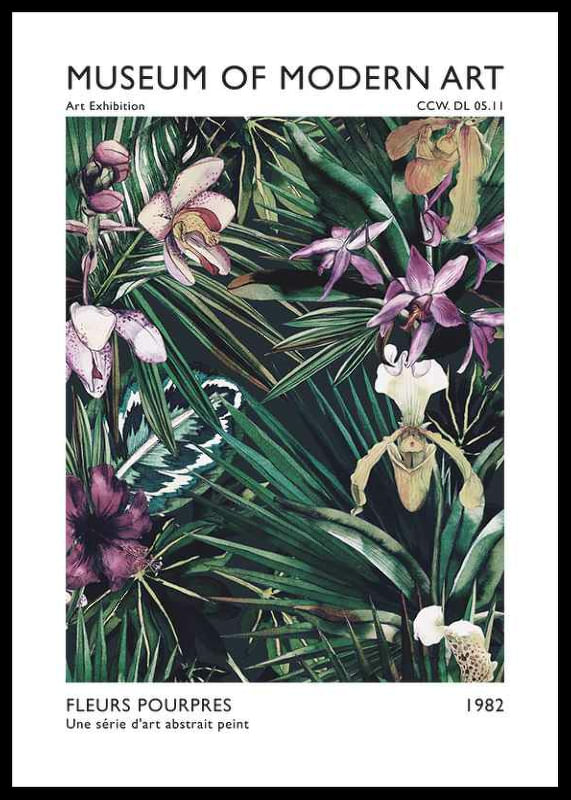 Exotiska orkidéer i lila och vita nyanser bland mörkgröna blad utgör motivet, där detaljerade blommor och frodig växtlighet skapar ett rikt botaniskt uttryck. Färgerna rör sig från djup violett till ljusbeige, med inslag av vitt och rosa. Postern lyfter modern inredning och fungerar i både vardagsrum och sovrum.