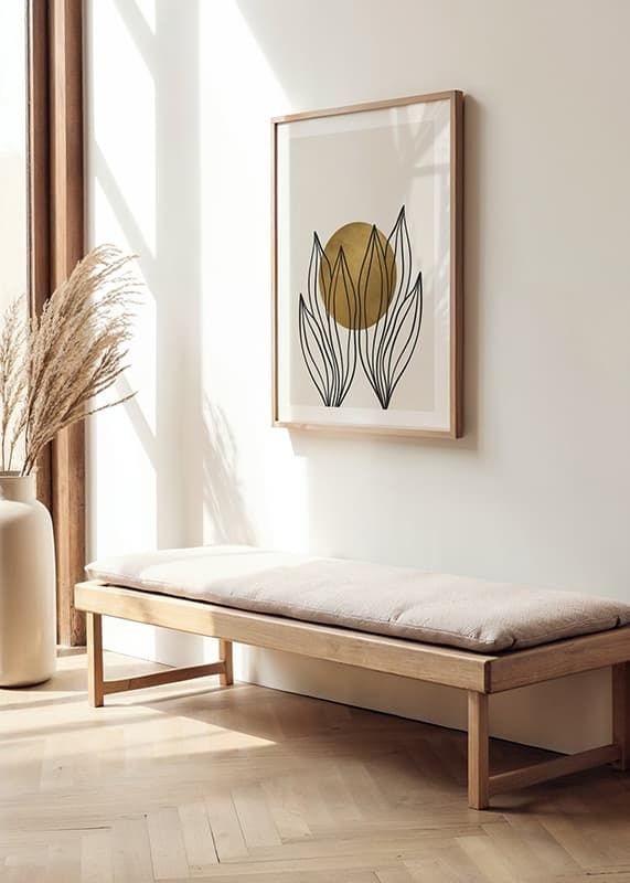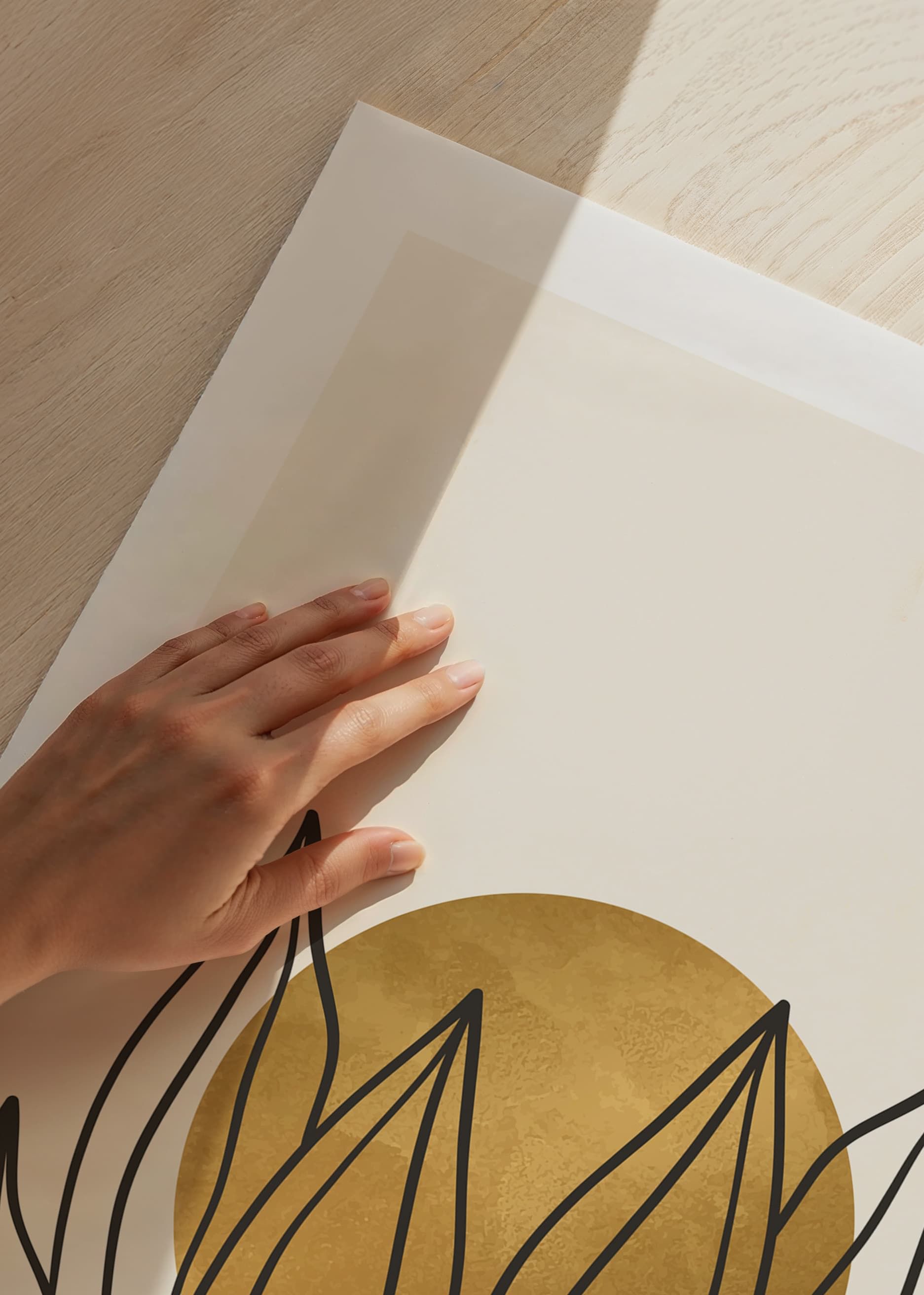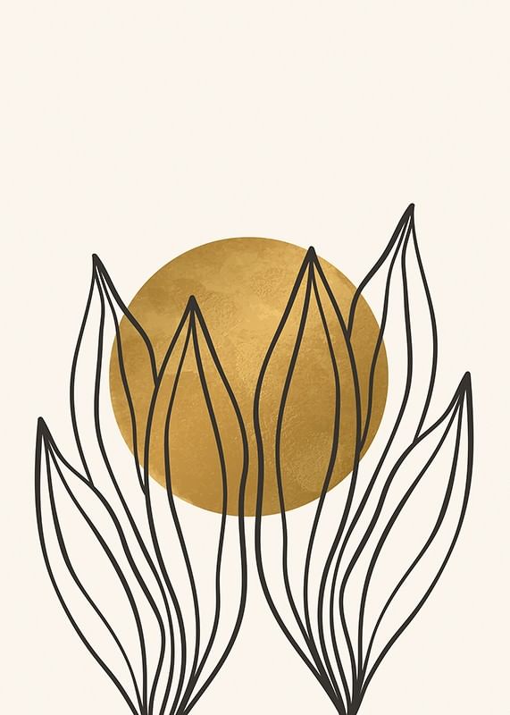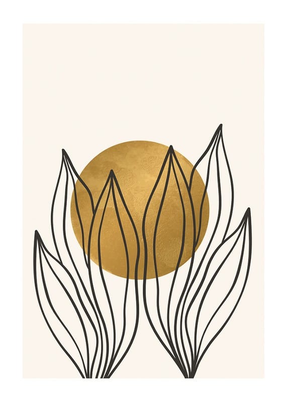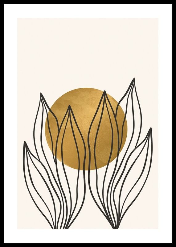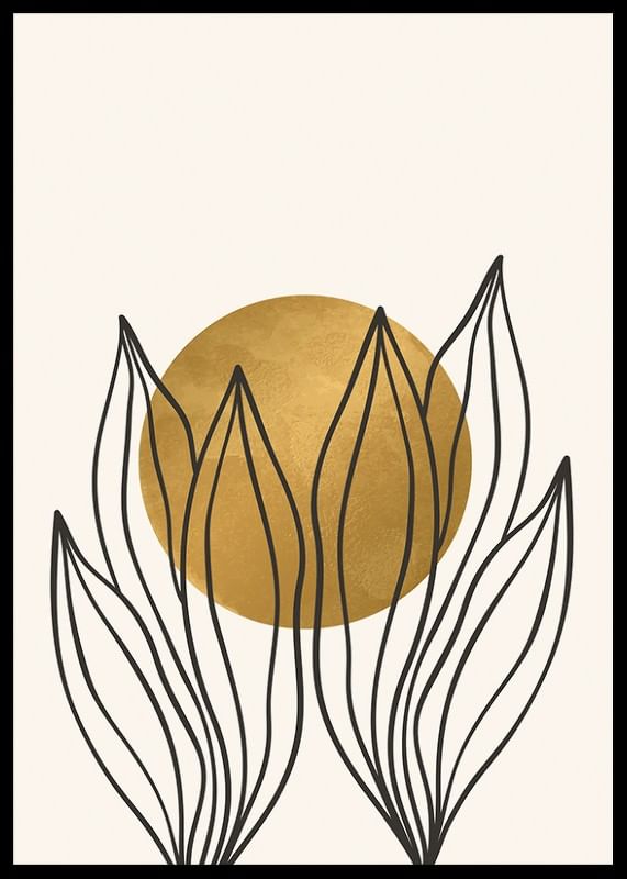 Svarta linjeteckningar av blad sträcker sig uppåt mot en central cirkel i gyllene akvarelltoner, mot en ljus, sandfärgad bakgrund. Den abstrakta kompositionen ger postern en modern och luftig känsla, vilket gör den enkel att kombinera med andra konstverk i såväl vardagsrum som sovrum.
