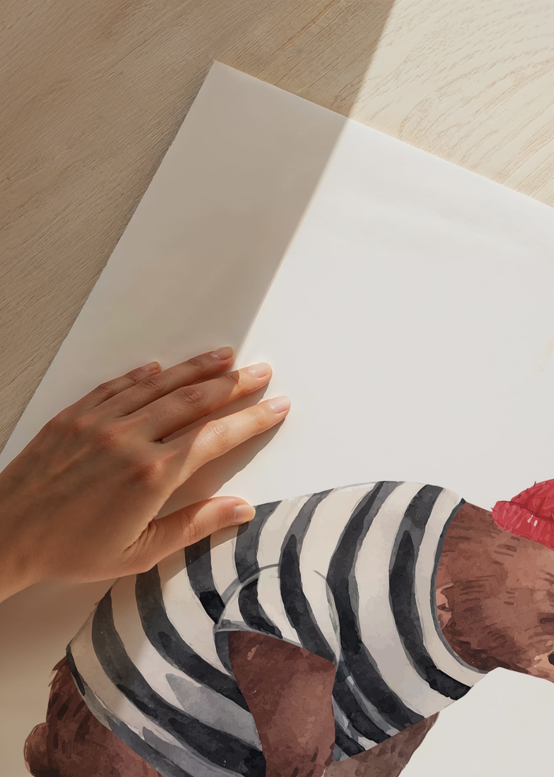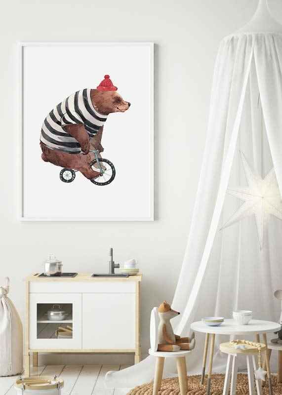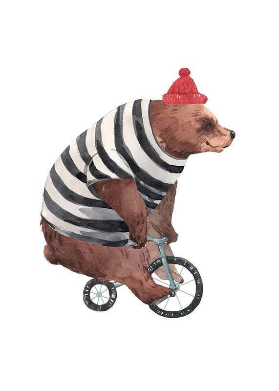 En brun björn klädd i svartvit randig tröja och röd stickad mössa cyklar på en mycket liten cykel mot vit bakgrund. Akvarellstilen skapar mjuka färgövergångar och varm känsla. Motivet ger barnrummet eller lekhörnan personlighet och humor. Denna poster passar i både barnrum och kreativa miljöer.