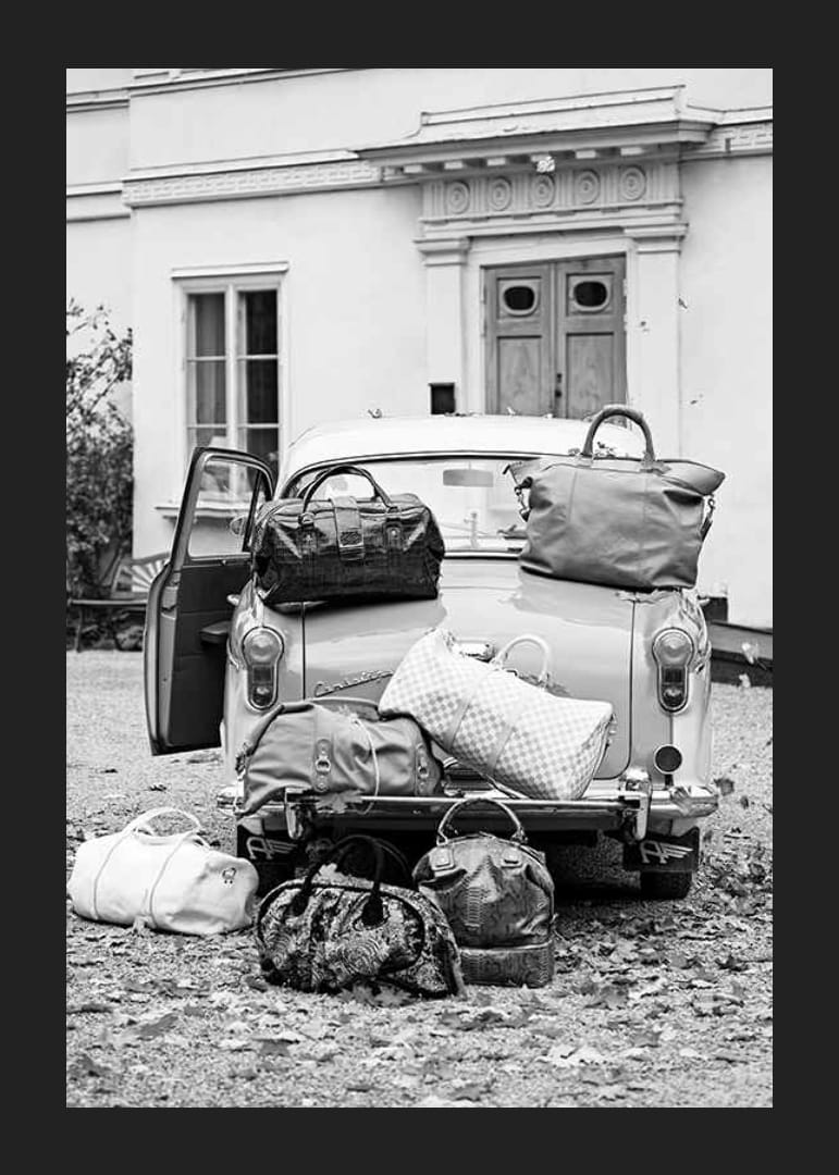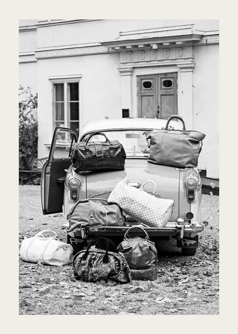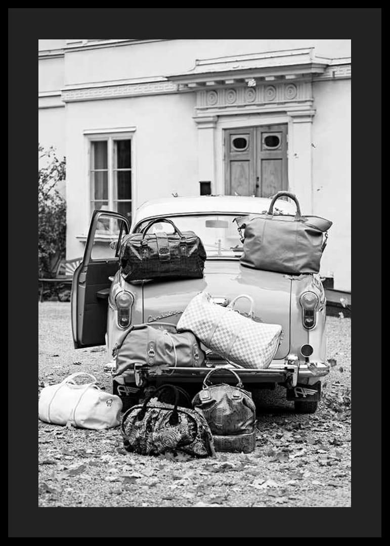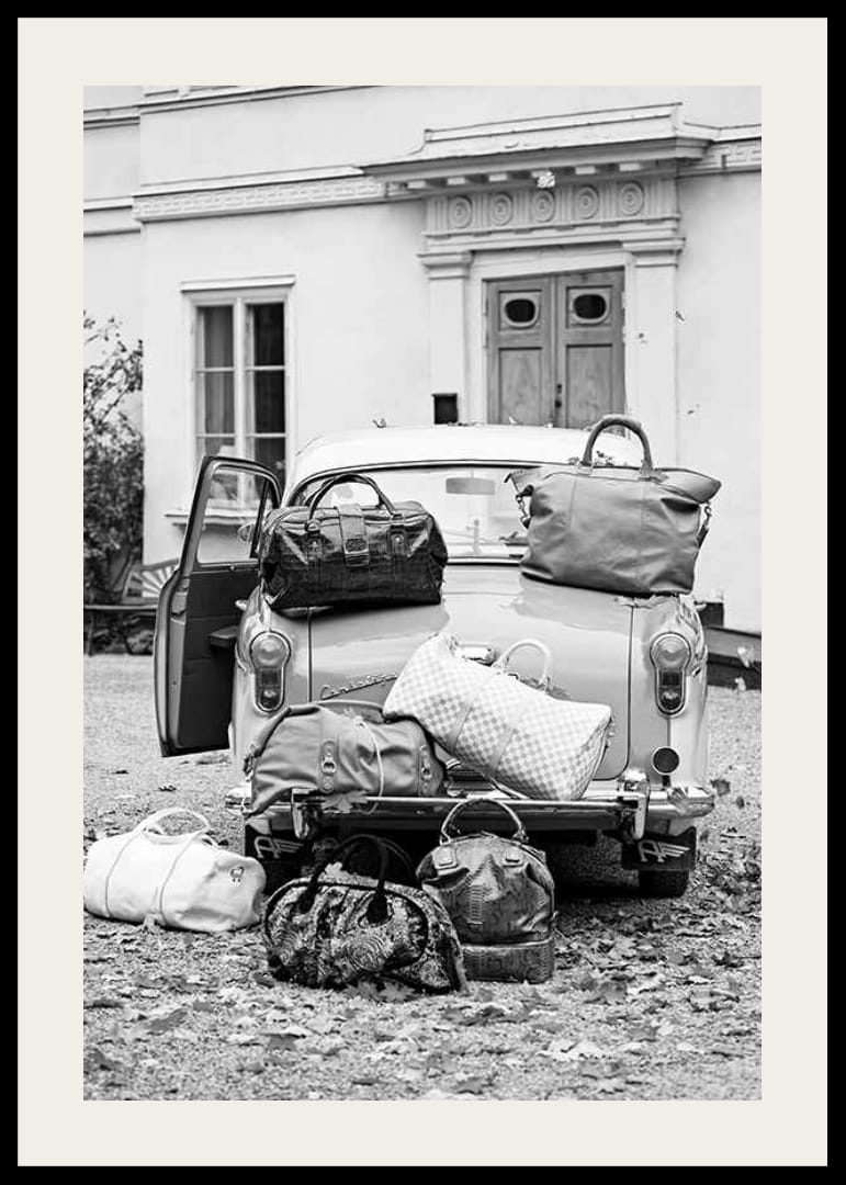 Bakpartiet av en äldre bil fylld med resväskor och väskor, fotograferad i svartvitt framför en klassisk husfasad. Dörren står öppen och höstlöv täcker marken. Stilrent motiv där retrokänsla möter vardaglig rörelse, vilket gör denna poster till ett passande och personligt inslag i hall, vardagsrum eller arbetsrum.