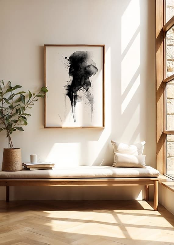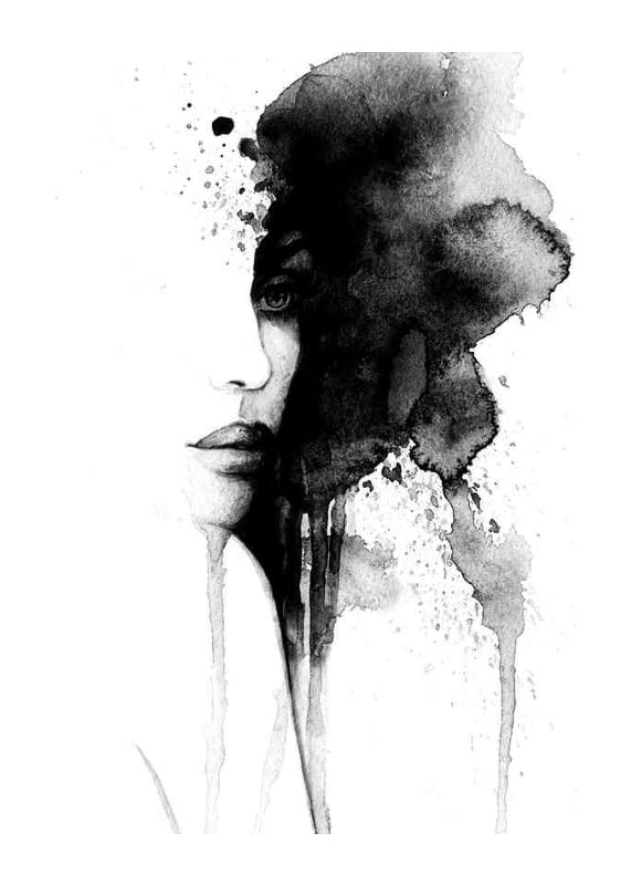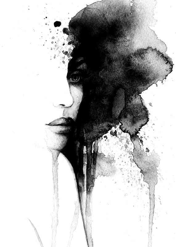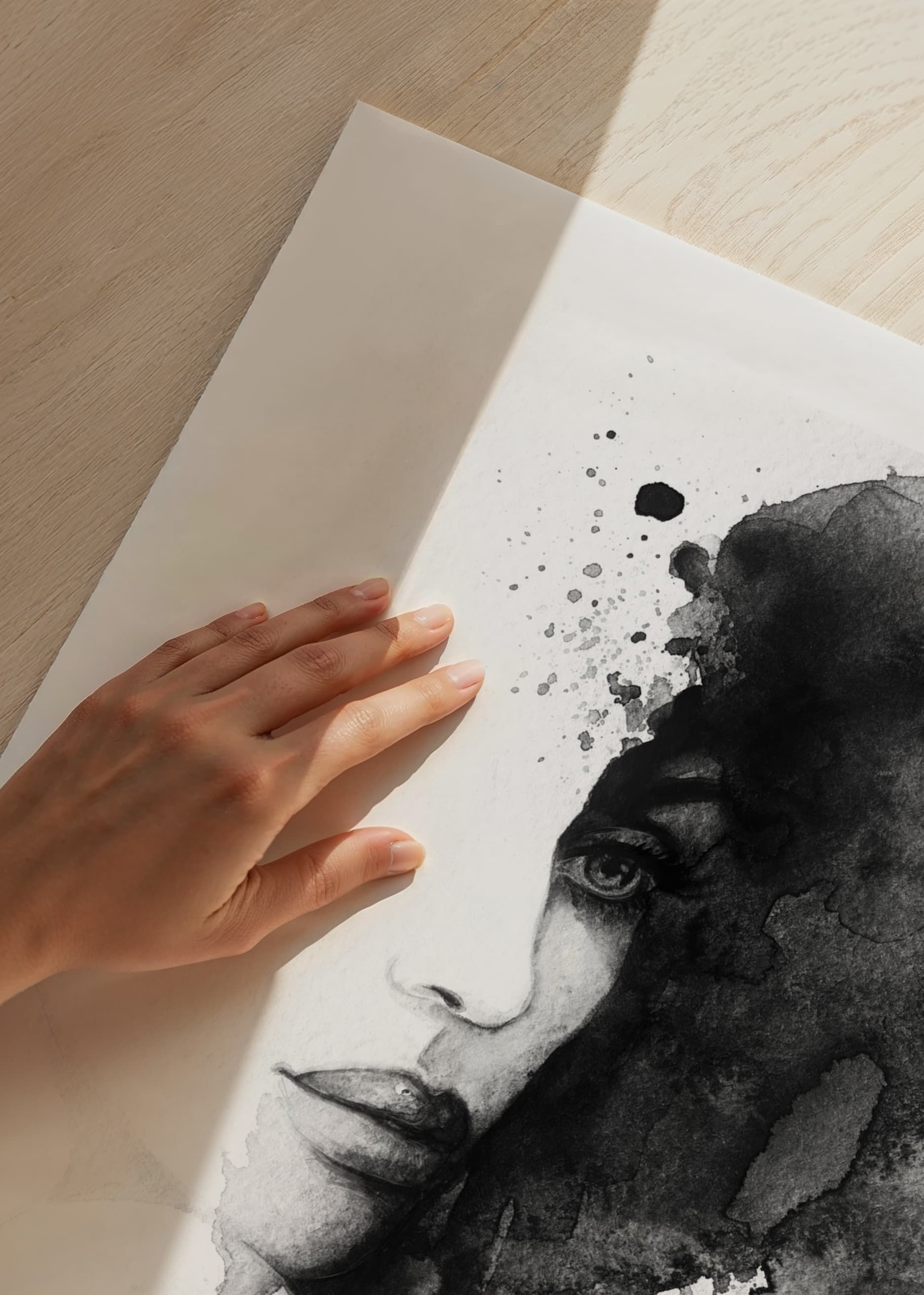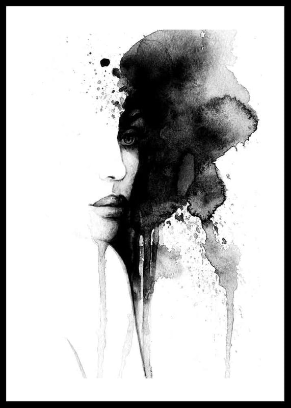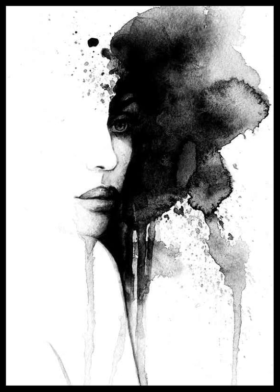 Ett halvt ansikte träder fram ur mjuka svarta penseldrag och rinnande akvarell på vit bakgrund. Blicken är riktad ut mot betraktaren och ansiktets andra halva löses upp i abstrakta former och stänk-effekter. Den svartvita färgskalan ger postern ett stilrent uttryck som lätt passar i moderna hem.