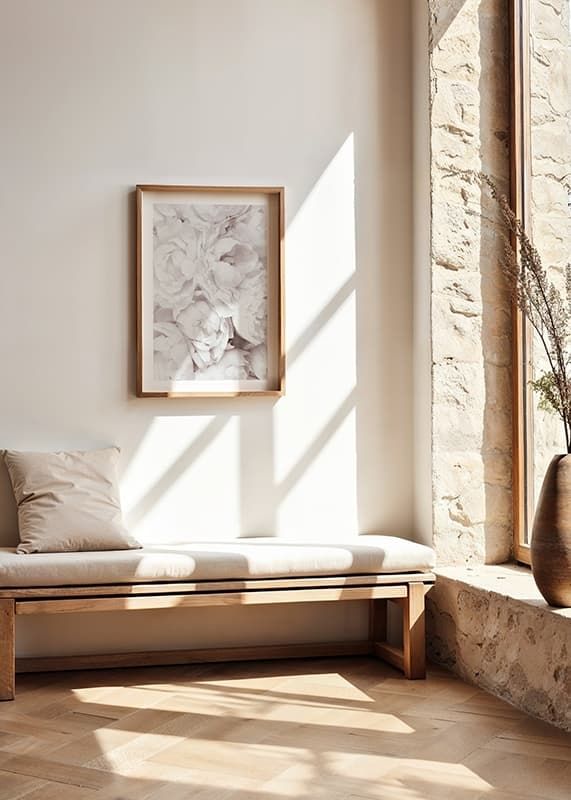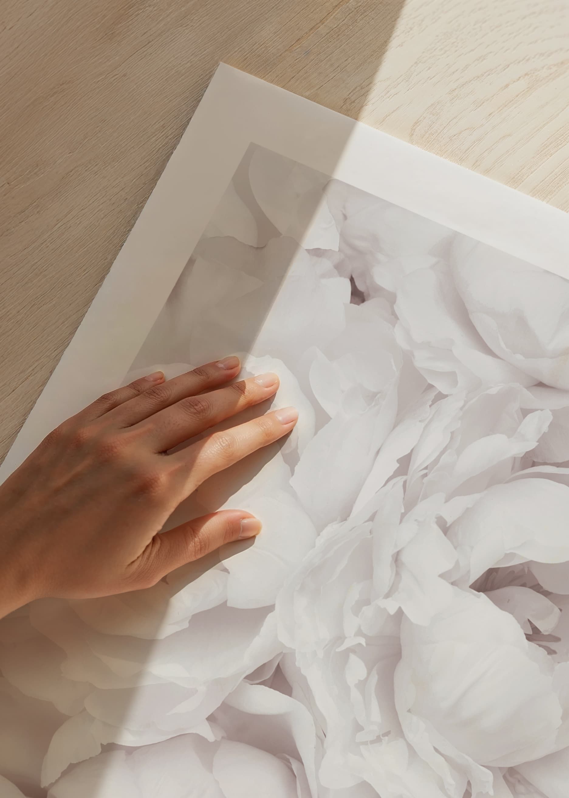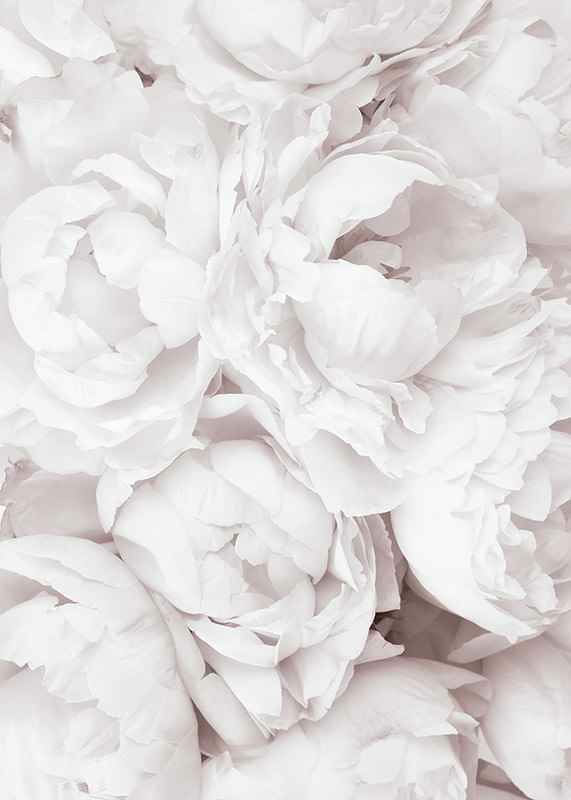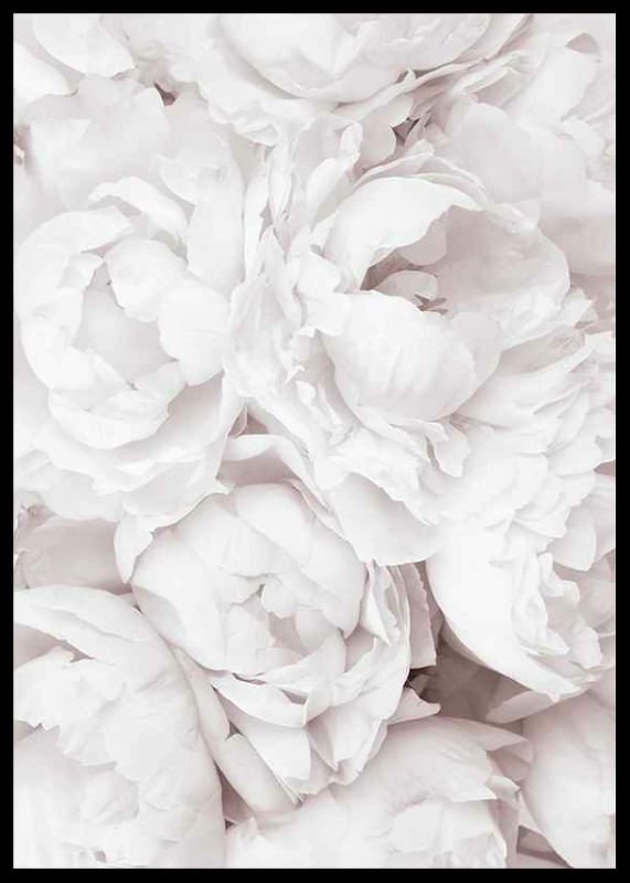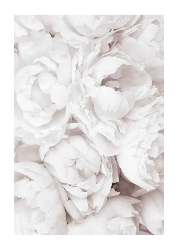 Närbild av flera öppna pioner i ljusrosa nyanser, med lager av mjuka blomblad som fyller hela ytan. De bleka tonerna skapar ett luftigt och romantiskt intryck. En botanisk poster som ger ett ljust och vänligt uttryck och passar fint i sovrum eller vardagsrum för en mjukare inramning.