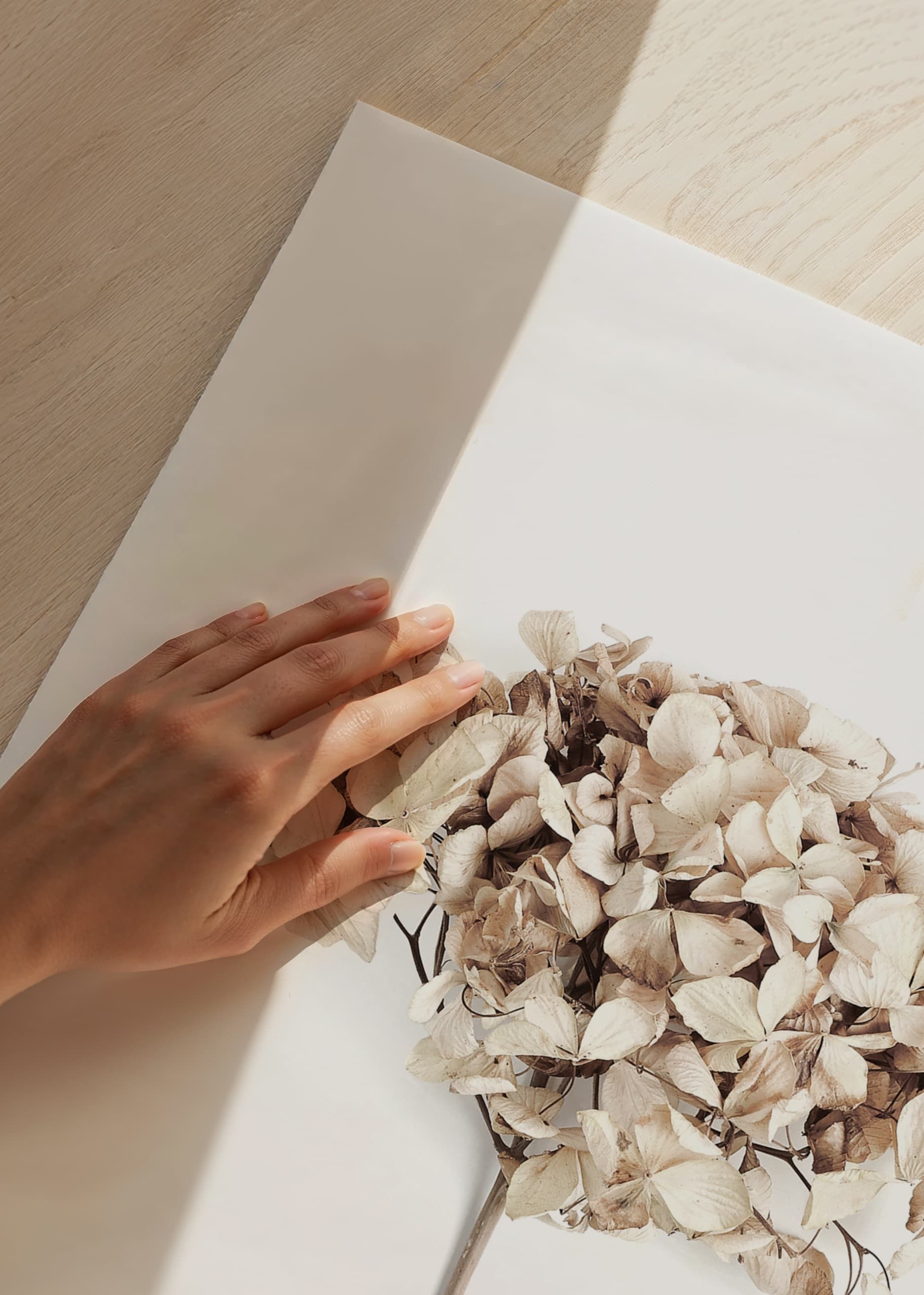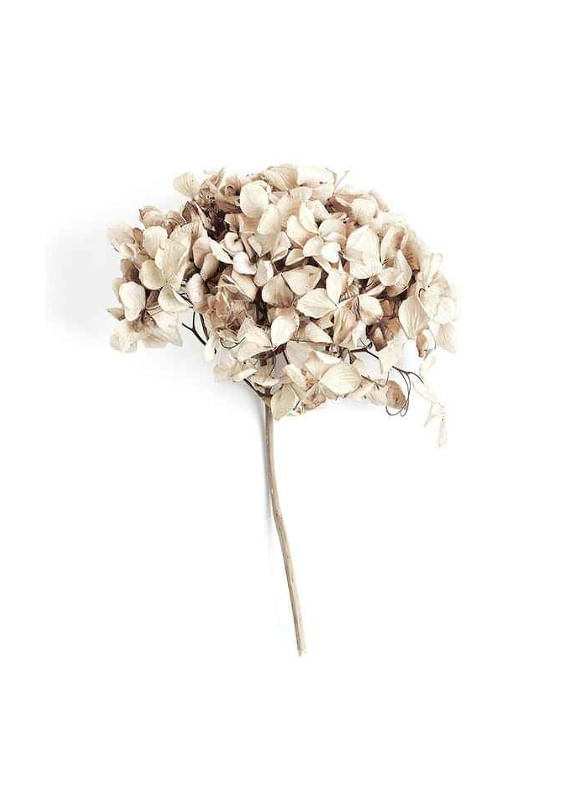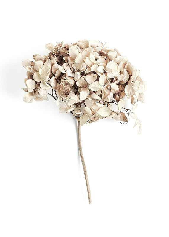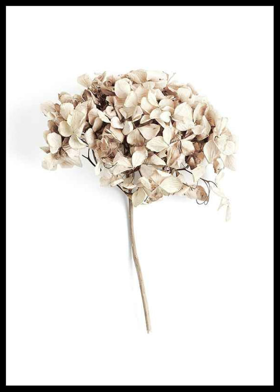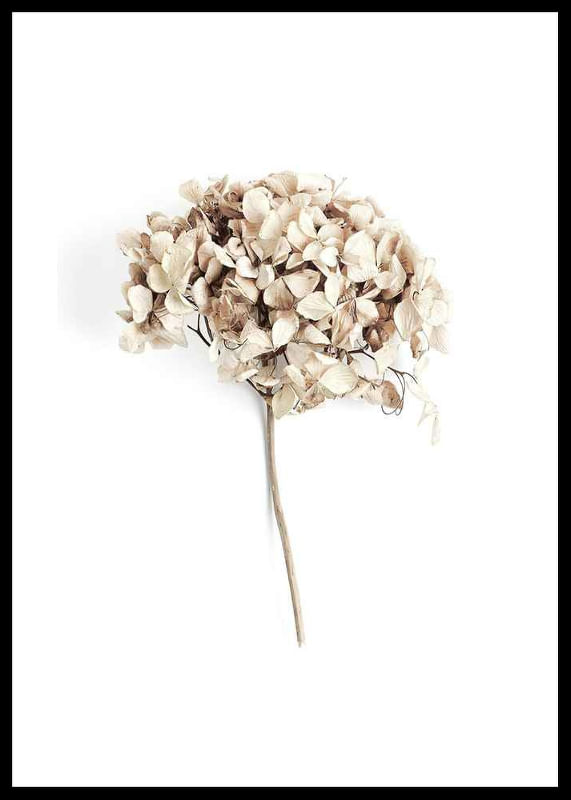 Närbild av en torkad hortensia med skira, krispiga kronblad i beige och ljusbruna nyanser, fångad mot en vit bakgrund. De subtila färgskiftningarna och det enkla arrangemanget ger postern ett naturligt och avskalat uttryck. Stilren detalj för hall, vardagsrum eller sovrum och lätt att kombinera med andra botaniska motiv.
