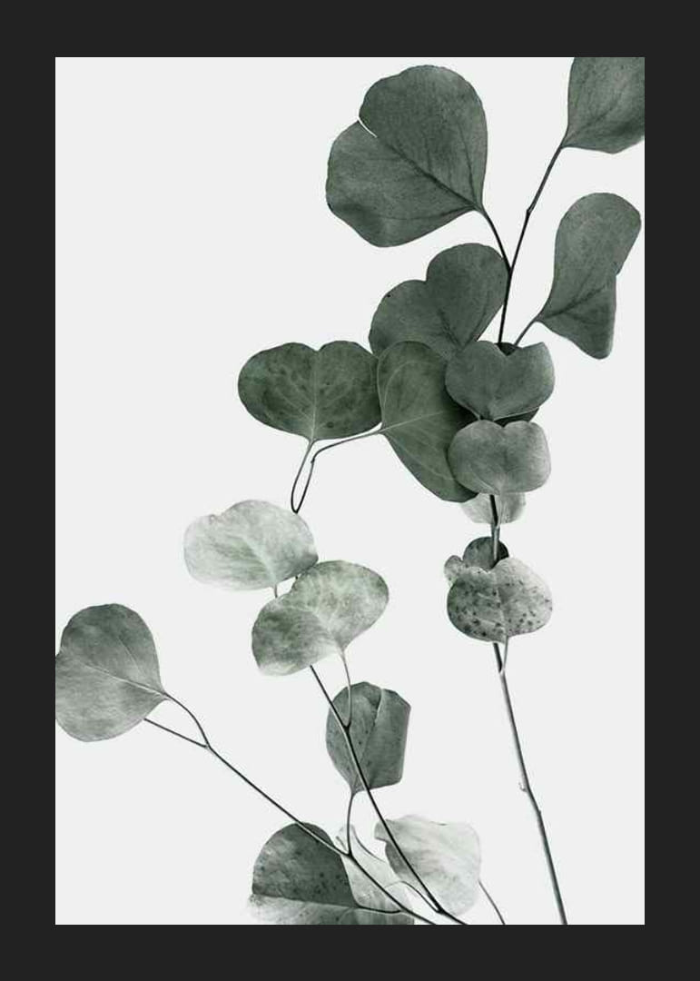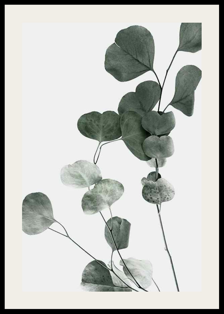 Stjälkar med runda, matta eukalyptusblad dominerar motivet, fångade i en fotografisk närbild med mjuk gråskala och tydliga detaljer. Den ljusa bakgrunden framhäver de naturliga nyanserna och skapar ett stilrent intryck. Denna poster ger en diskret botanisk känsla som passar bra till modern inredning.