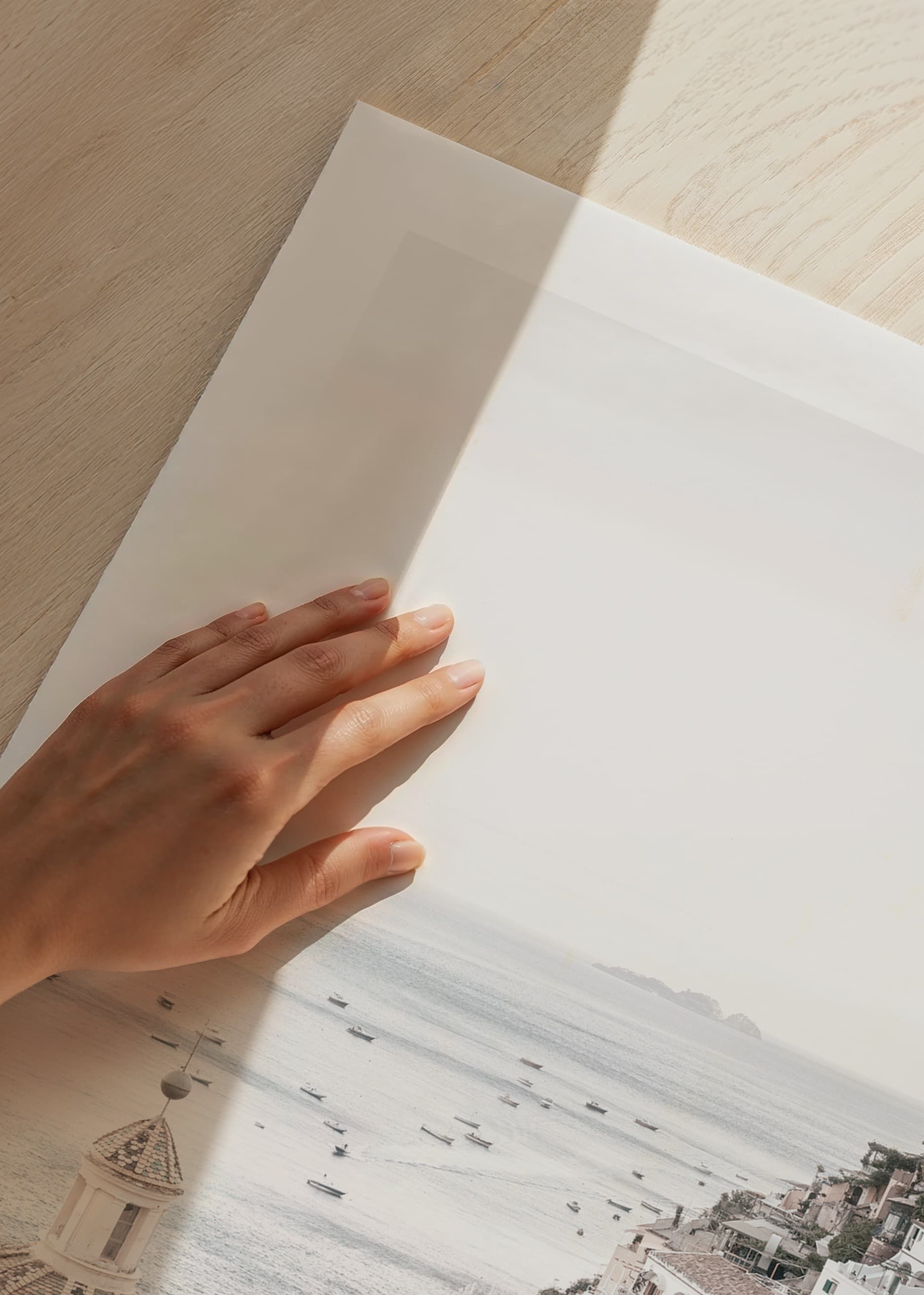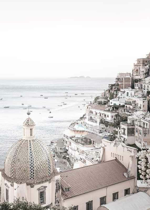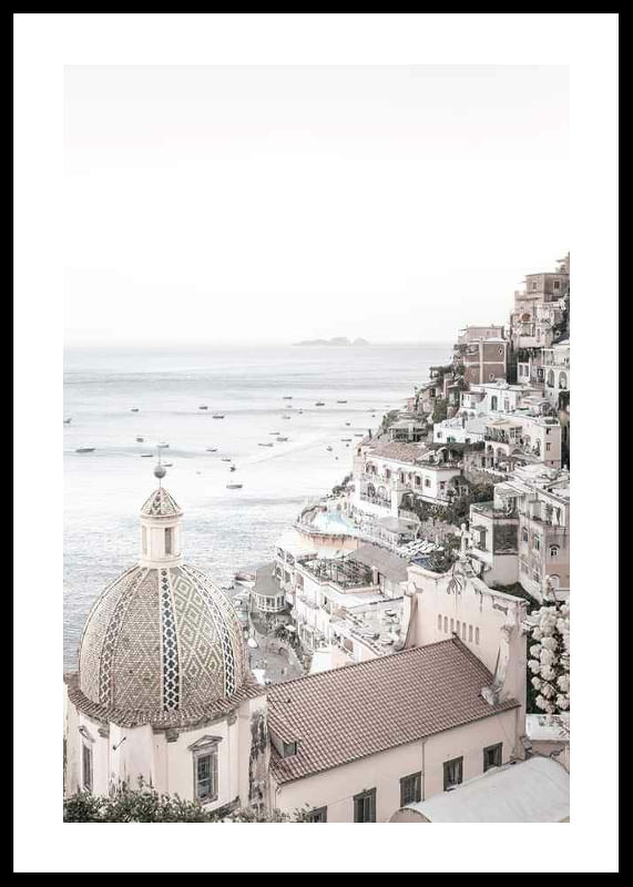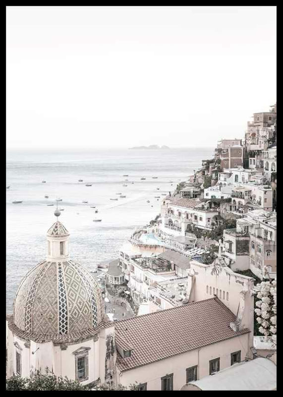 Pastellfärgade byggnader klättrar uppför sluttningen i byn Positano på Amalfikusten, i provinsen Salerno söder om Neapel. I förgrunden syns den karakteristiska kupolen från kyrkan Santa Maria Assunta. Ljusblått hav och små båtar breder ut sig i bakgrunden. Denna poster ger en känsla av Medelhavets lugn och passar fint i exempelvis vardagsrum eller hall.