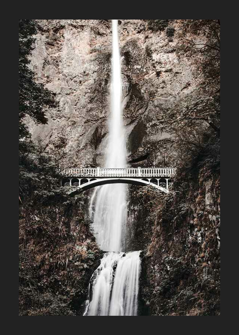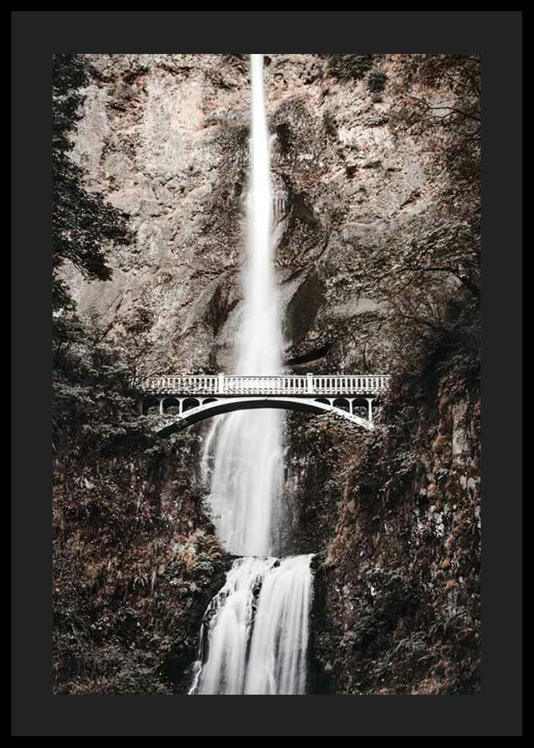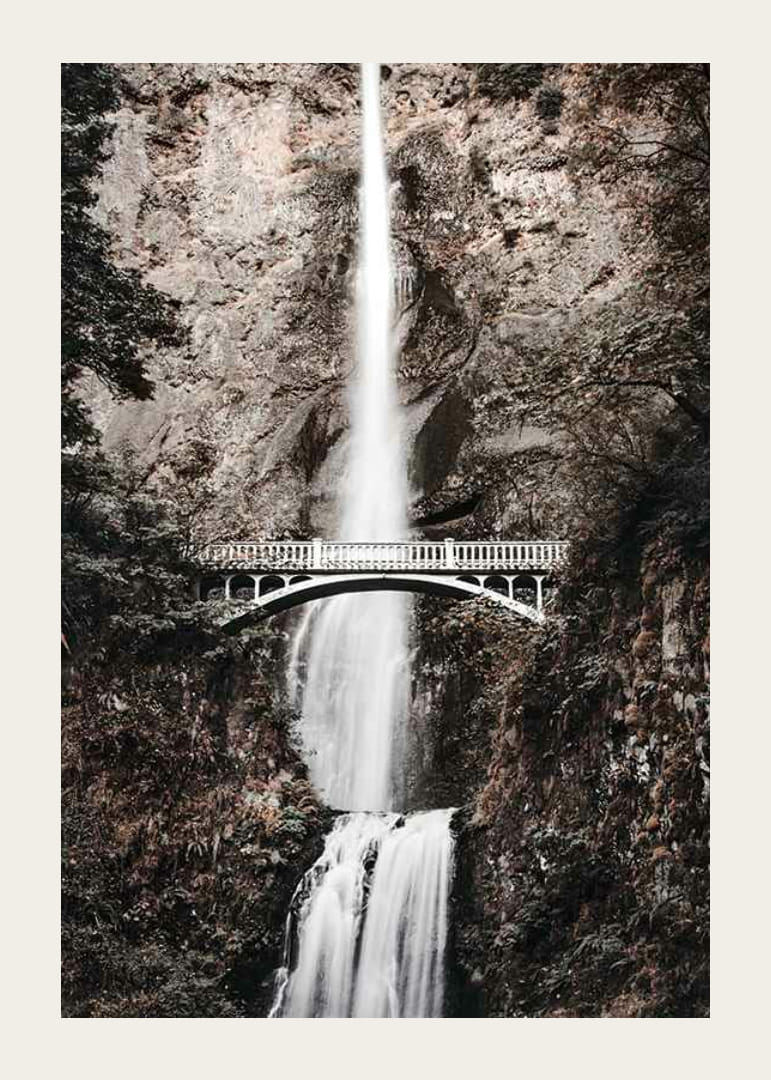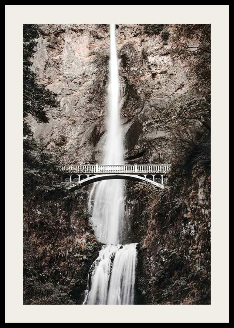 Högt vattenfall omges av klippor och höstfärgade träd, där en vit bågbro delar av fallet på mitten. Naturmotivets dova toner skapar ett lugnt och tidlöst intryck, samtidigt som den eleganta bron ger ett arkitektoniskt inslag. Postern ger naturlig karaktär åt vardagsrum, hall eller arbetsrum.