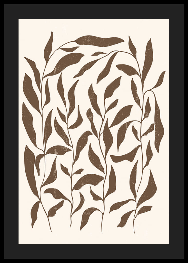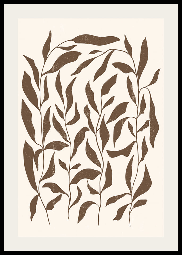 Motivet består av stiliserade, bruna blad och stjälkar som sträcker sig vertikalt i ett upprepande mönster. Den ljusa beige bakgrunden framhäver de organiska formerna och skapar ett grafiskt uttryck. Denna poster passar för att addera subtil växtkänsla till både vardagsrum och sovrum.