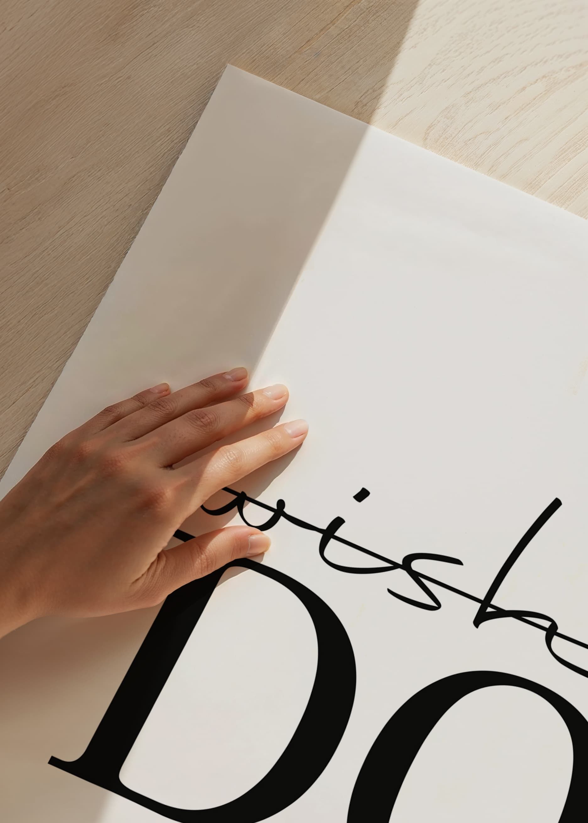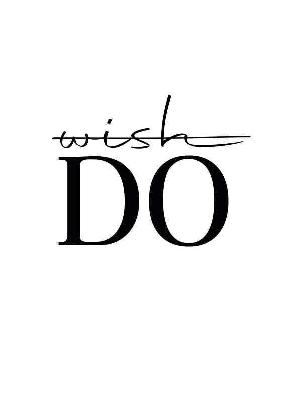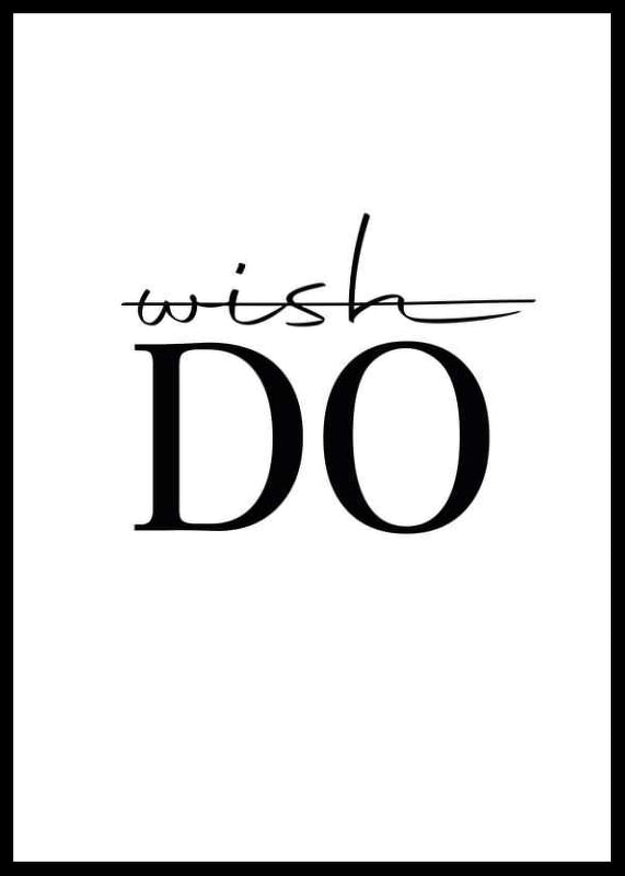 Grafiskt motiv med ordet “wish” i handskriven stil som är överstruket och “DO” i stora svarta blockbokstäver nedanför, mot en helt vit bakgrund. Kontrasten mellan de två orden och den minimalistiska designen ger en tydlig och motiverande känsla. Passar som poster i hemmakontoret eller en modern hall.